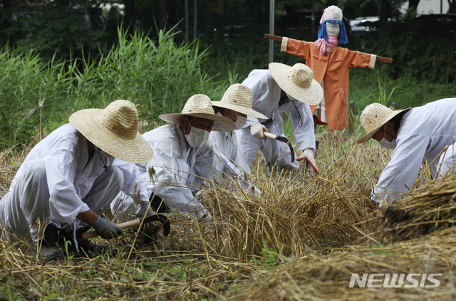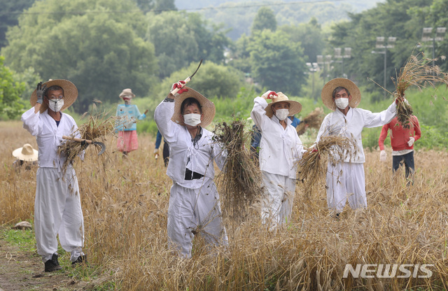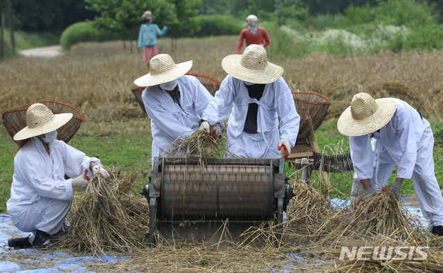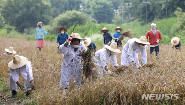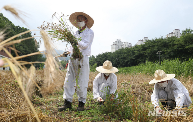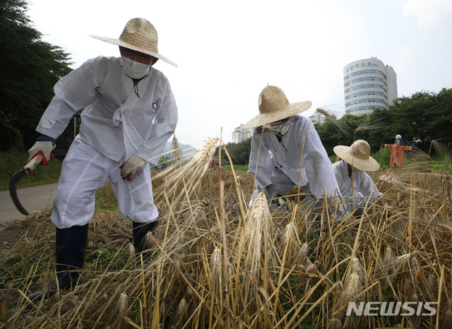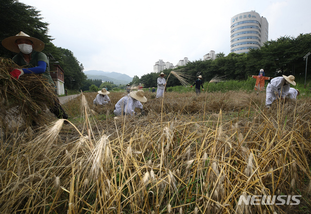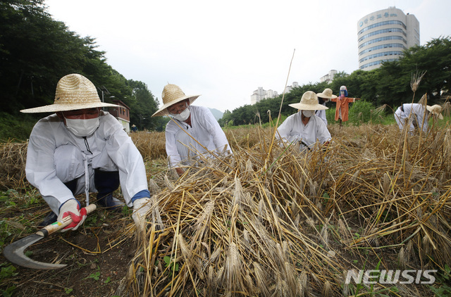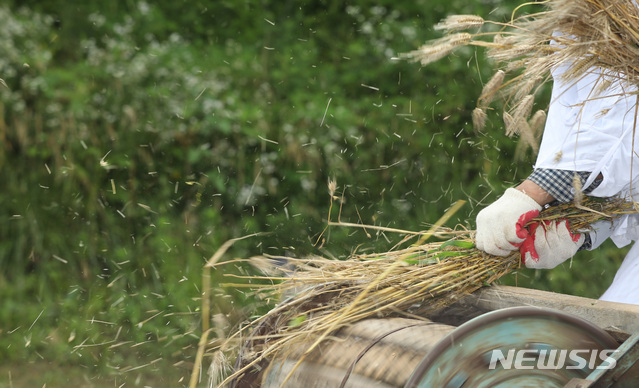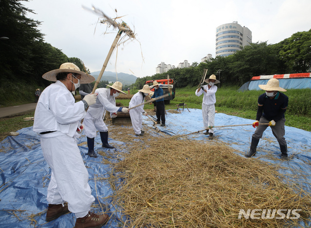 ソウル市瑞草区を流れる良才川そばのオーガニック麦畑で29日、良才川の管理者たちが収穫した麦を脱穀した。