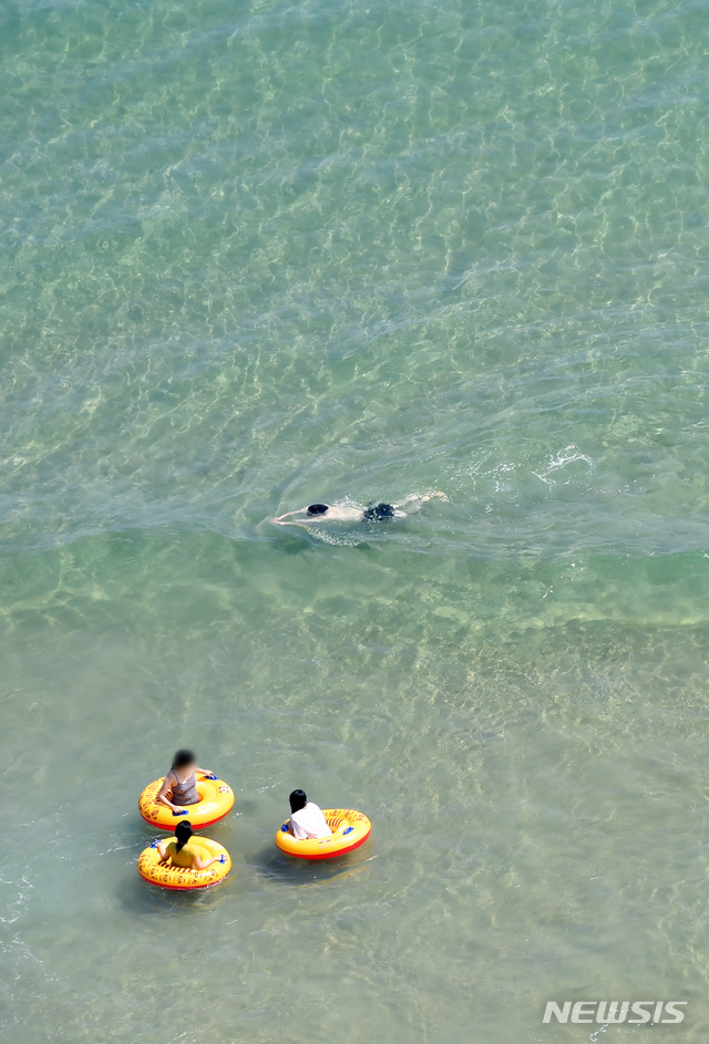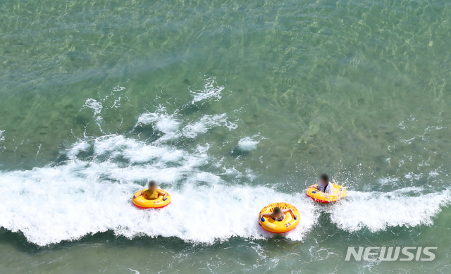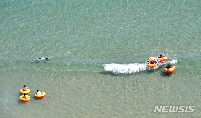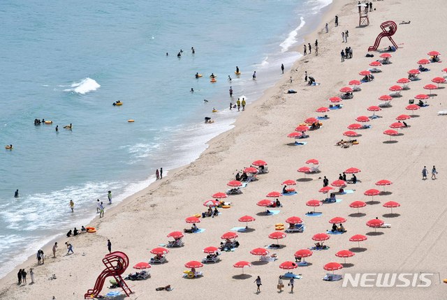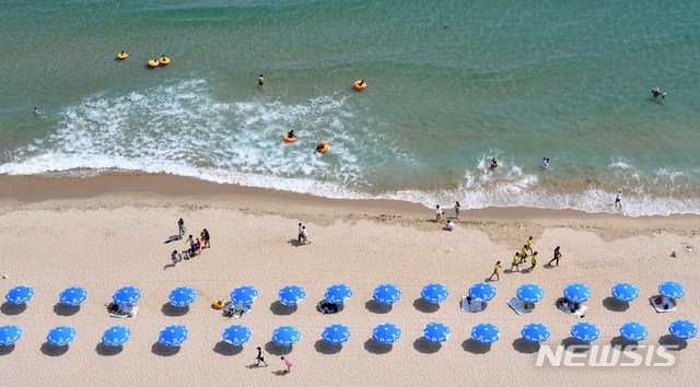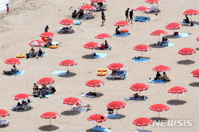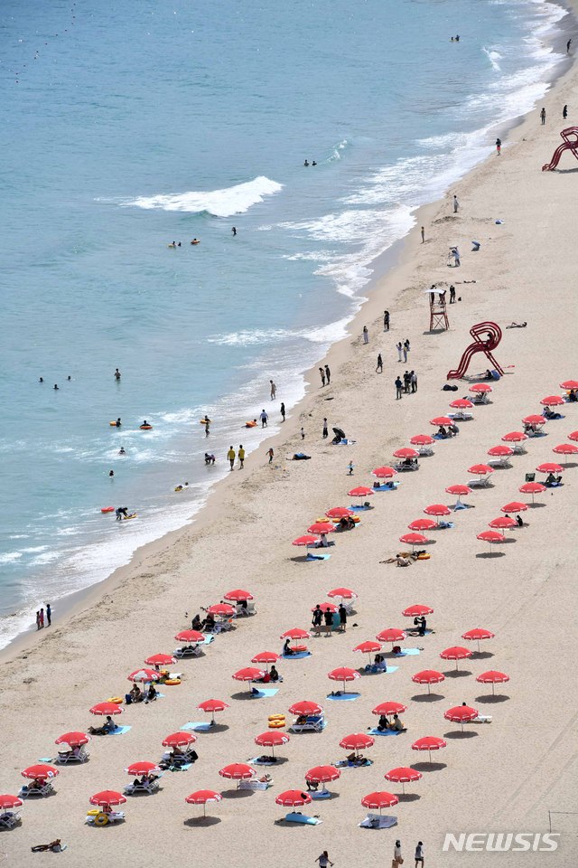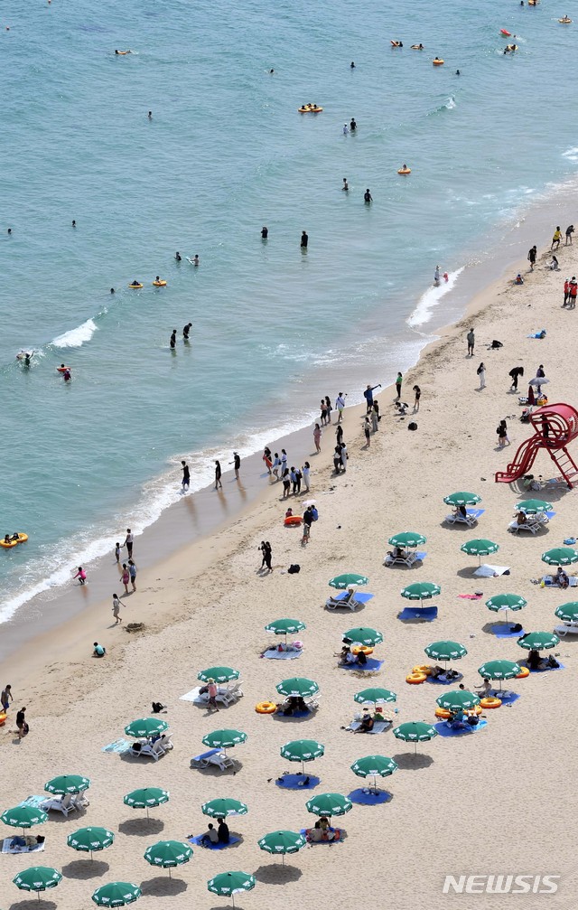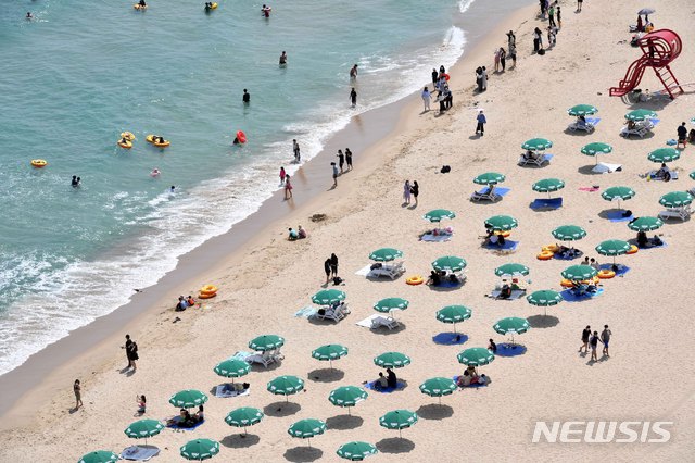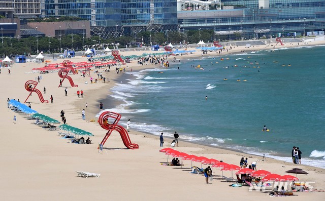 1日、釜山の海雲台海水浴場を訪れた市民や観光客が水遊びに興じている様子。 この日、釜山の7つの海水浴場(海雲台・松亭・広安里・多大浦・松島・日光・林浪)が全面オープンし、8月31日まで2カ月にわたり避暑客を迎える。