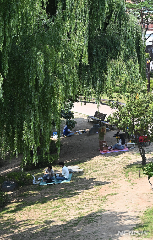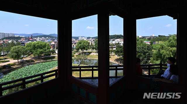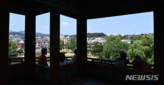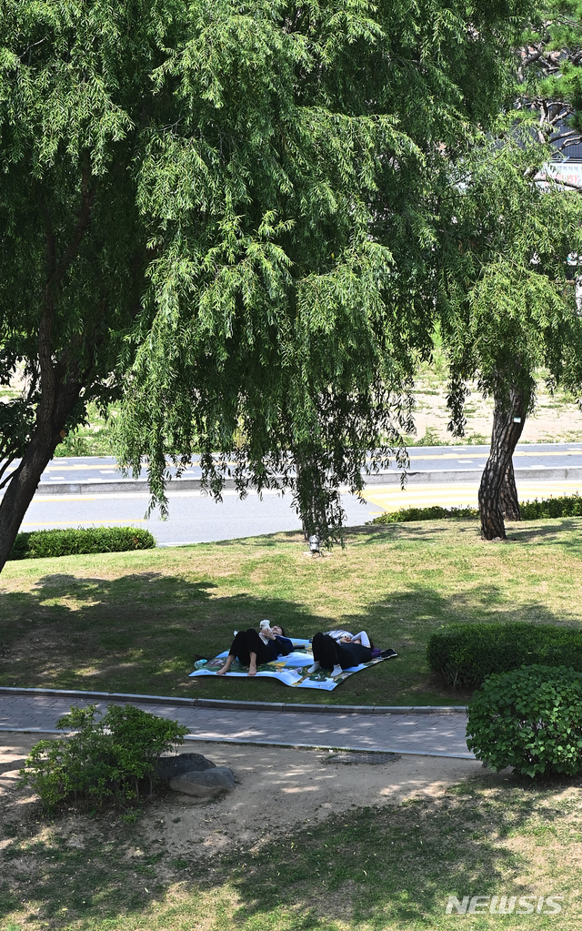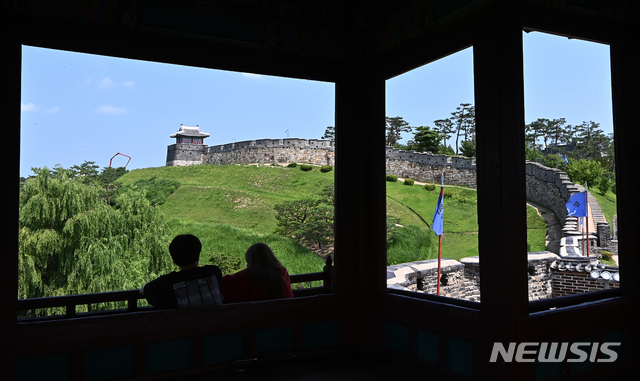 暑い一日となった2日の午後、京畿道水原市八達区の世界文化遺産「華城・訪花随柳亭」を訪れた市民が、木陰で一休みしている様子。