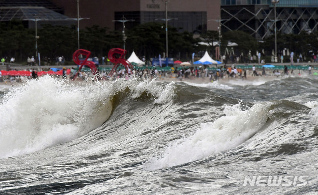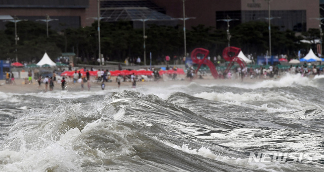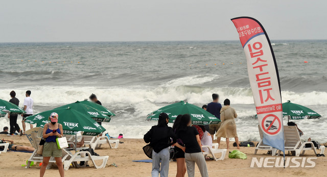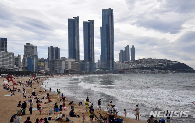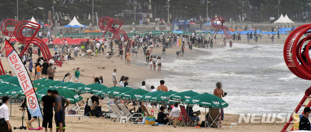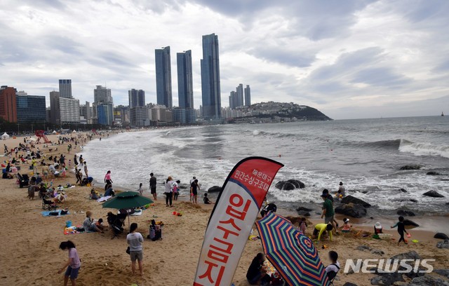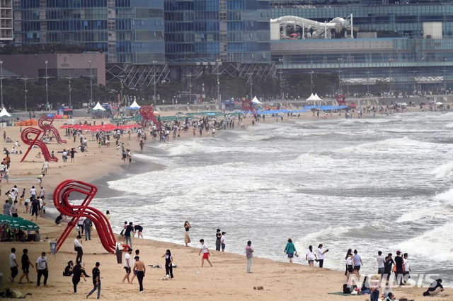 【NEWSIS】釜山地域の7つの海水浴場が全面オープンして初の週末となった4日午後、釜山市海雲台区の海雲台海水浴場には市民や観光客たちが訪れ、暑さをしのいだ。この日、釜山は梅雨が小康状態に入ったが、波浪注意報が出され、同海水浴場で海に入ることは規制された。