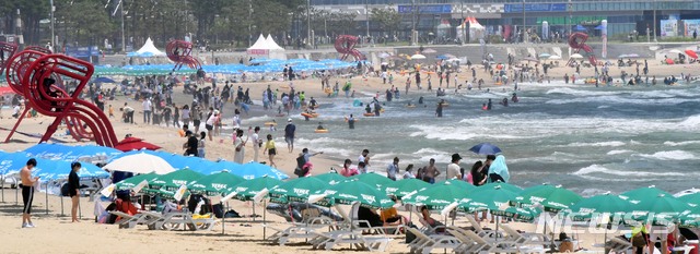 【NEWSIS】釜山地域に三日連続で猛暑注意報が発令された11日、釜山市内の海雲台海水浴場では市民や観光客たちが暑さをしのいでいた。