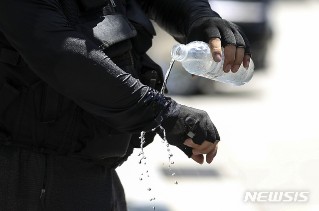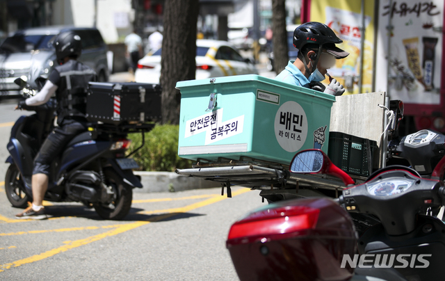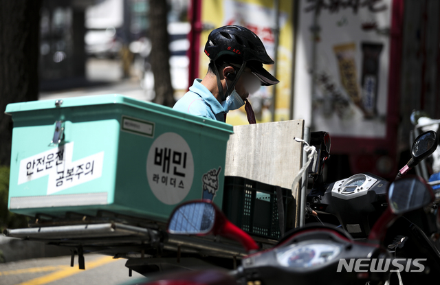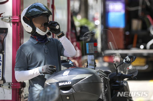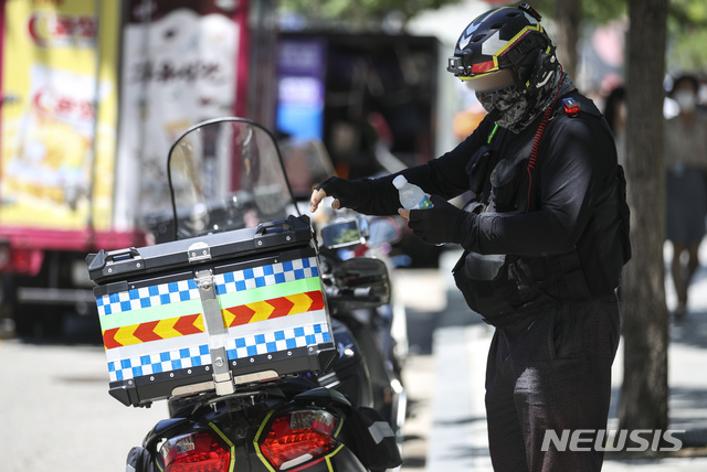 猛暑が続く22日午後、ソウル市鍾路区の路地で、宅配ドライバーが氷水とアイスクリームで暑さをしのいでいた。