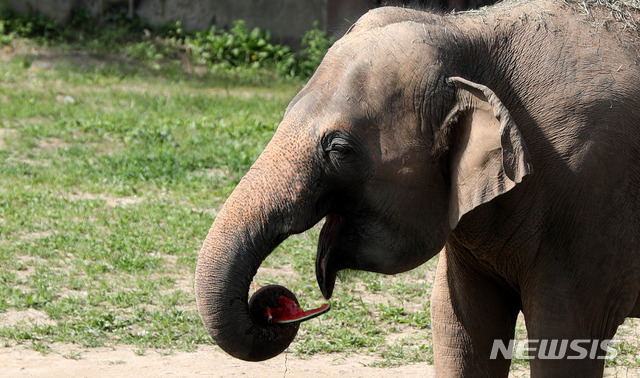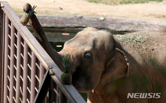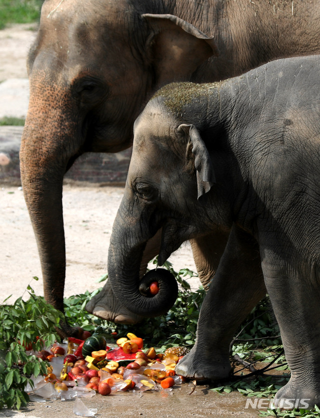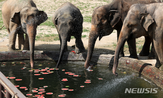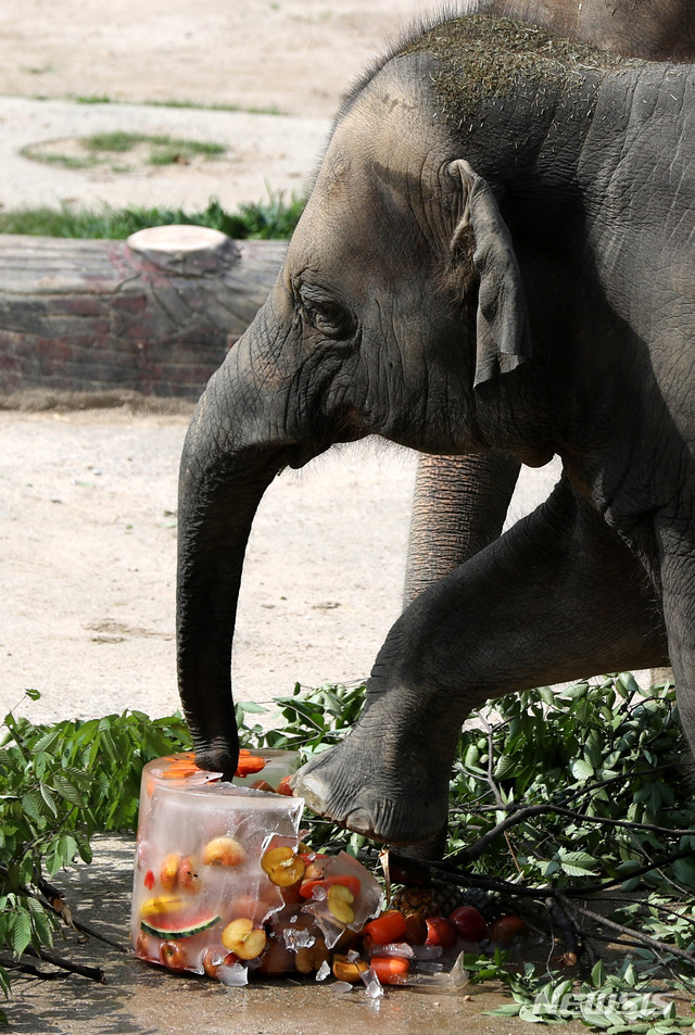 連日厳しい暑さが続く中、京畿道果川市にあるソウル大公園動物園では6日午前、果物が入った氷を食べながら涼むアジアゾウの姿が見られた。