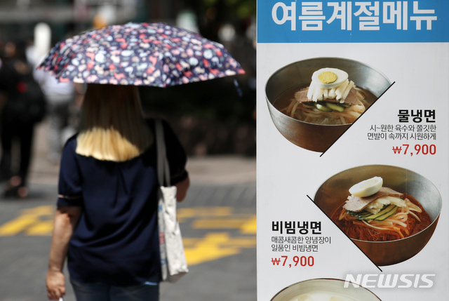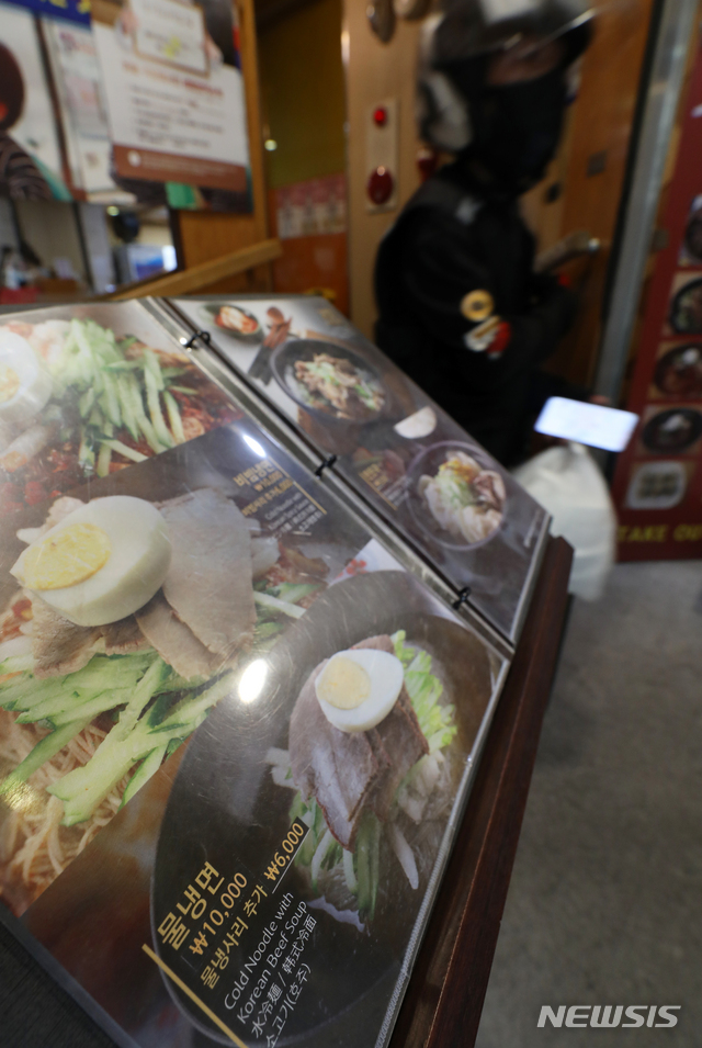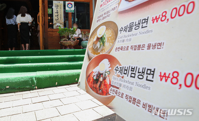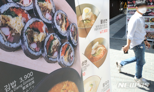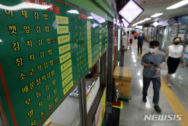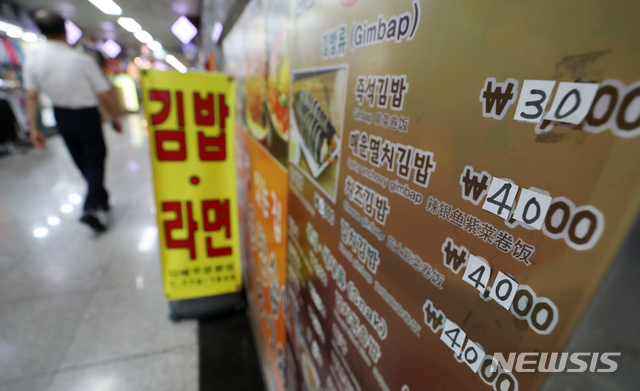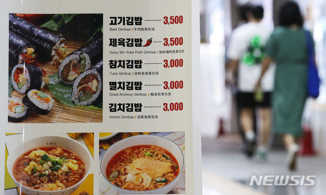 消費者物価の上昇により上半期の主要外食費も上がっていることが分かった9日の午前、ソウル市内の飲食店に掲げられたキムパプの価格表示。韓国消費者院の価格情報総合ポータルサイトによると、6月のソウル基準で、冷麺、キムパプ、ジャージャー麵、ビビンバなど代表的な外食メニュー8種類のうち7種類の平均価格が今年1月より上昇した。