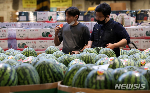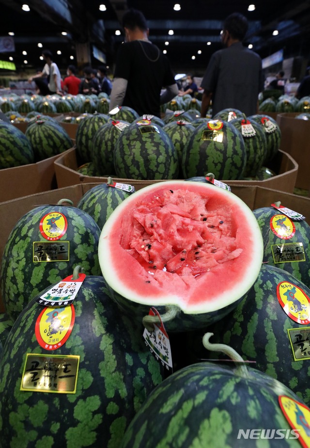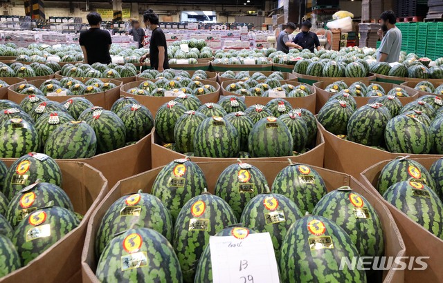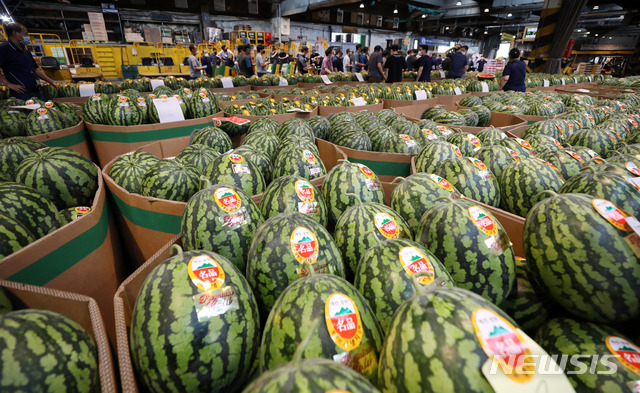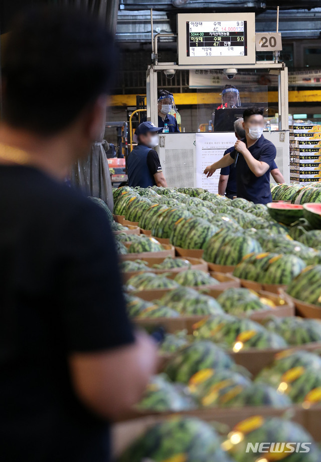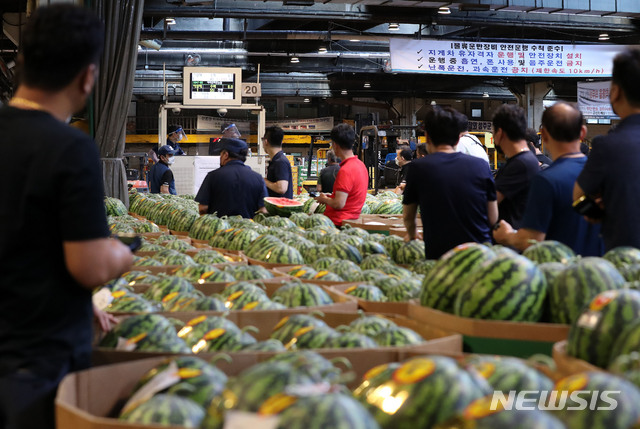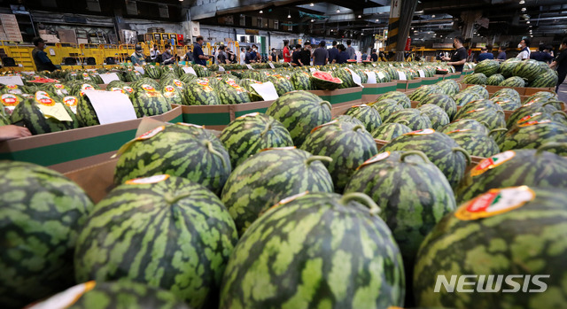 スイカをはじめとする果実類の価格が高騰している10日午前、ソウル市松坡区の可楽農水産物総合卸売市場で、スイカの競りが行われている様子。
