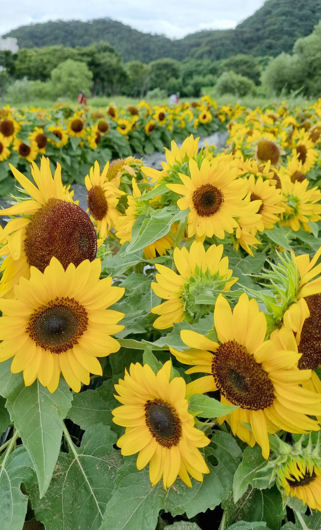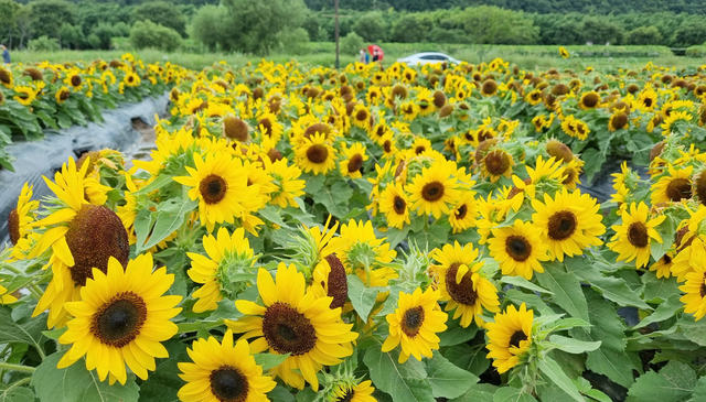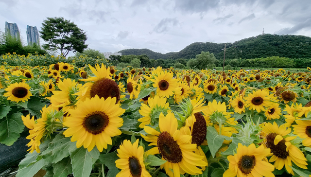 蔚山市中区の太和江国家庭園では18日、丈などが大きくない性質を有する矮性(わいせい)種のヒマワリが花を咲かせていた。