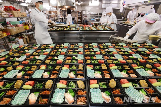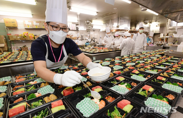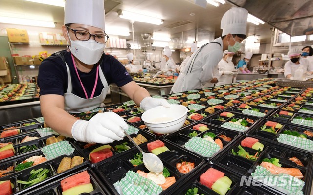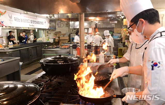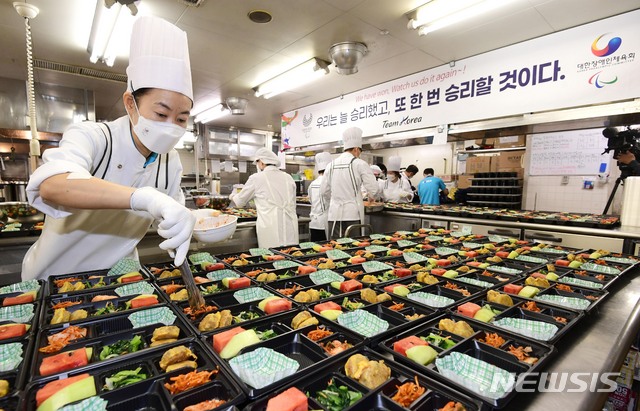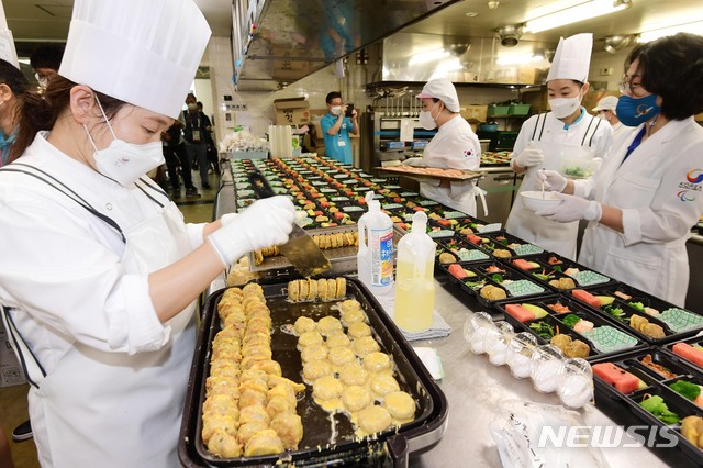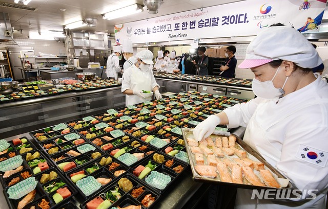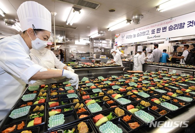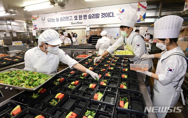 東京のコリアハウス給食支援センターで24日午前、東京パラリンピックに出場する韓国選手に提供する弁当を準備している調理師や栄養士の様子。
