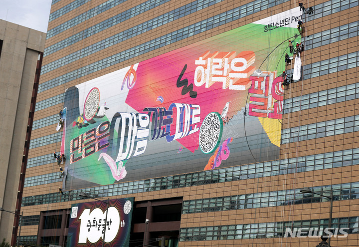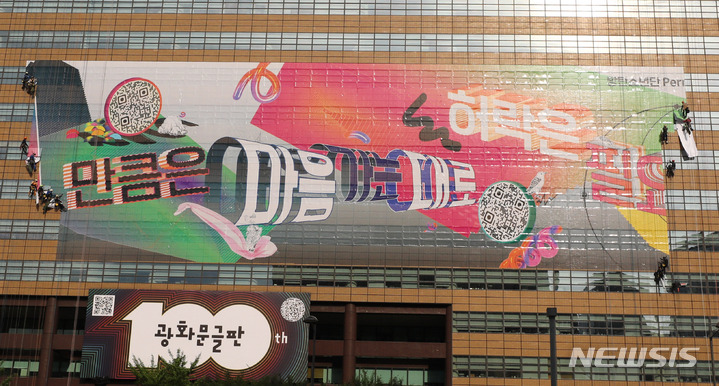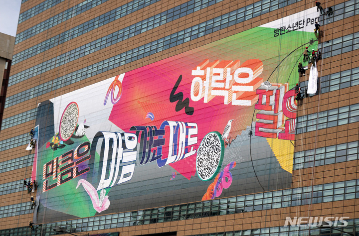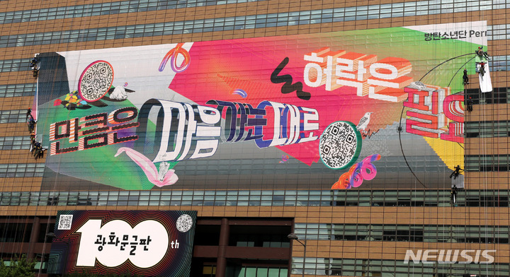 【NEWSIS】29日午後、ソウル市鍾路区光化門の教保生命の外壁に、100番目の光化門クルパン(メッセージボード)「BTS×光化門グルパン ダンスくらいは思いのままに、許可なんて必要ない」と書かれたラッピング作業が進められていた。