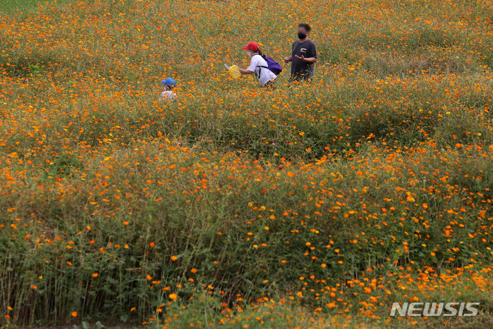 【NEWSIS】秋らしい天気となった5日午後、ソウル市陽川区内の安養川生態公園では、黄色いコスモスが咲いていた。