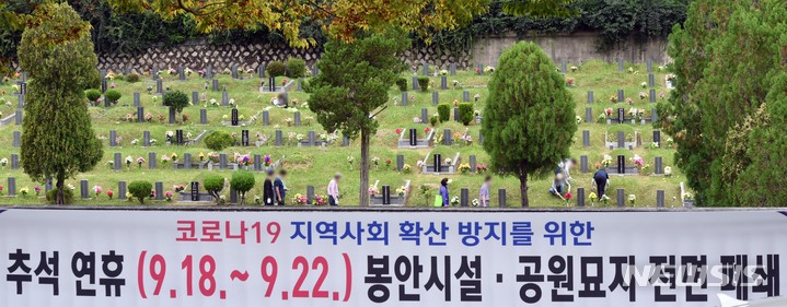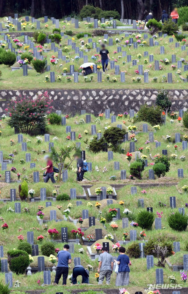 【NEWSIS】秋夕(チュソク=中秋節、今年は9月21日)連休まであと2週間ほどとなった5日、釜山市金井区内の永楽公園墓地を訪れ、草を抜くなど、少し早めの墓参りをする人々。釜山市は秋夕連休の18日から22日まで、永楽公園と追慕公園の公園墓地・奉安施設(奉安堂・奉安塀・奉安墓)を全面閉鎖することにした。