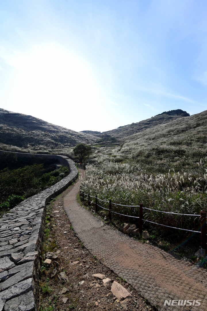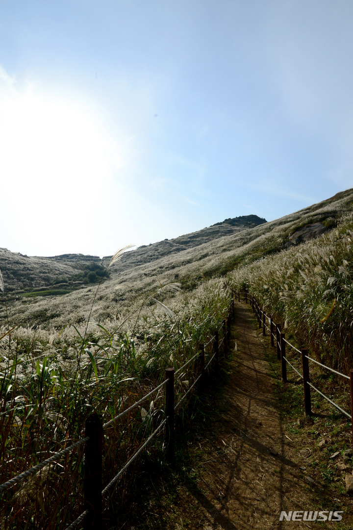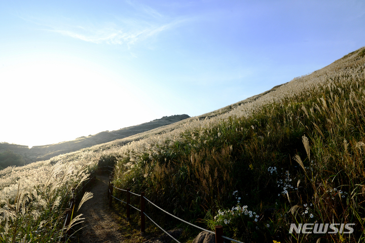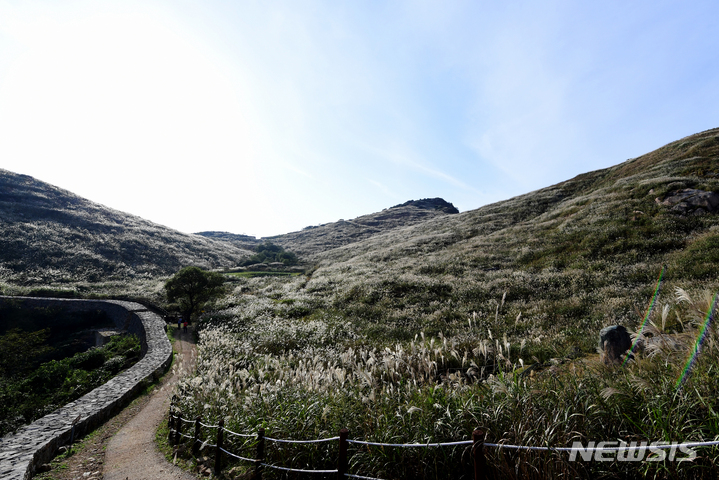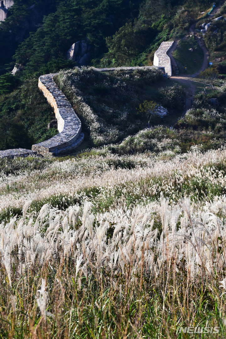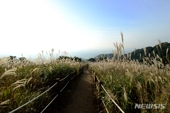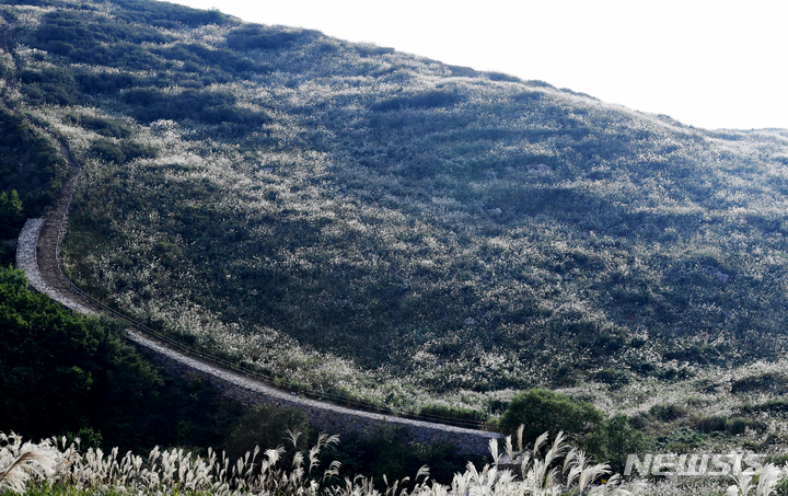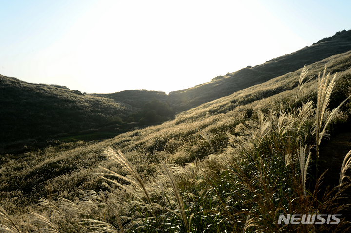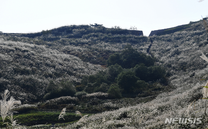 【NEWSIS】3日午後、慶尚南道昌寧郡の火旺山山頂近くから尾根を見下ろすと、銀色のススキが波のように揺れていた。