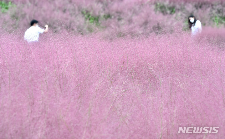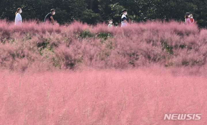 開天節(檀君神話に基づく韓国の建国記念日)の代替公休日に当たる4日、慶尚北道漆谷郡の架山スピア樹木園では、訪れた人々がミューレンベルギアのピンク色の波の中で秋の趣を満喫していた。