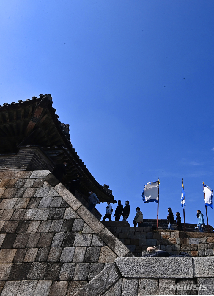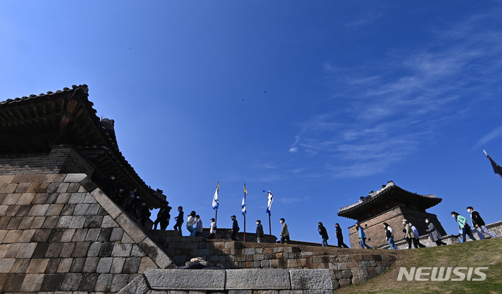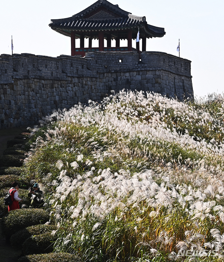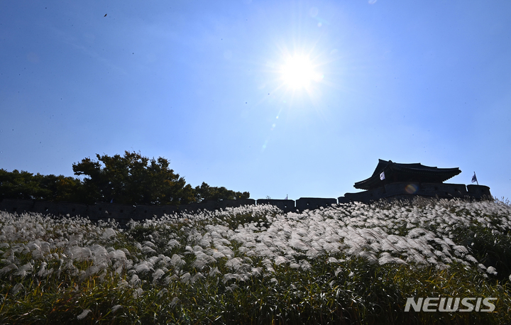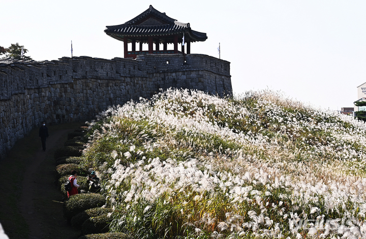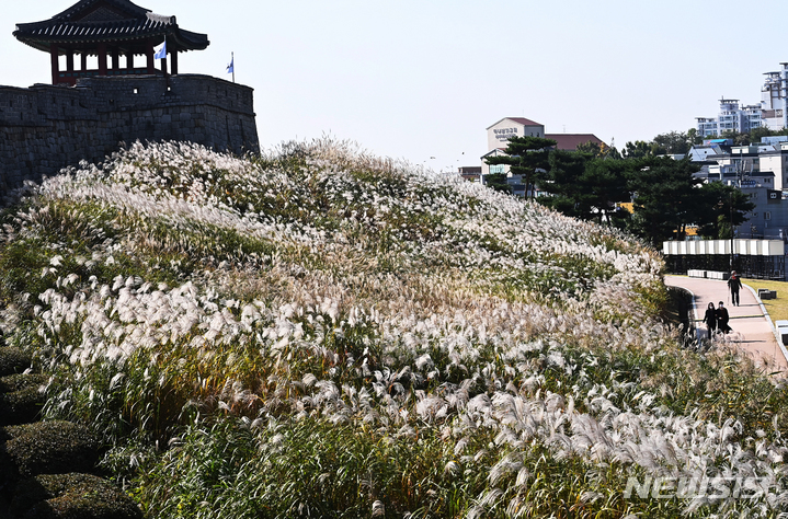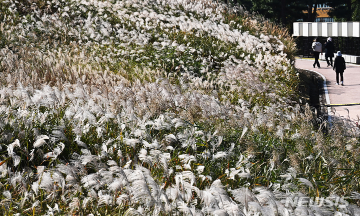 二十四節気の「霜降」まであと一日と迫った22日、京畿道水原市八達区の華西公園では、訪れた市民が、銀色に染まったススキが波のように揺れる草原の道を歩いて秋の趣を楽しんでいた。