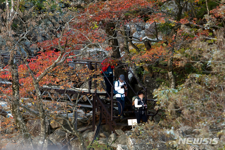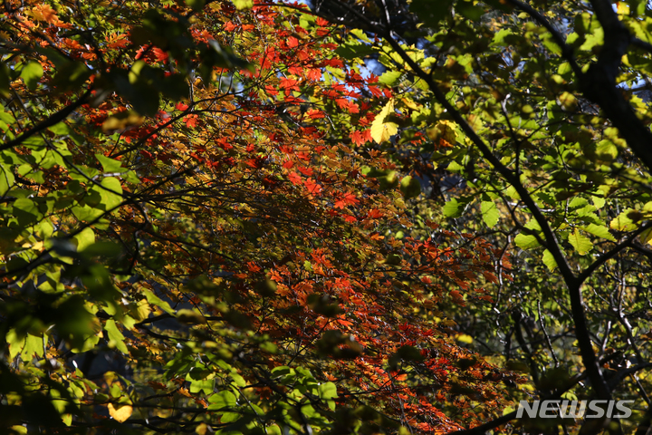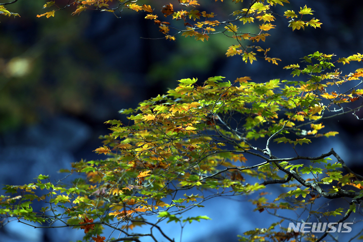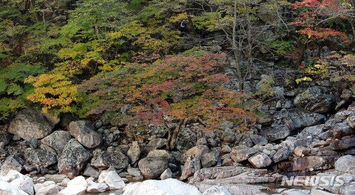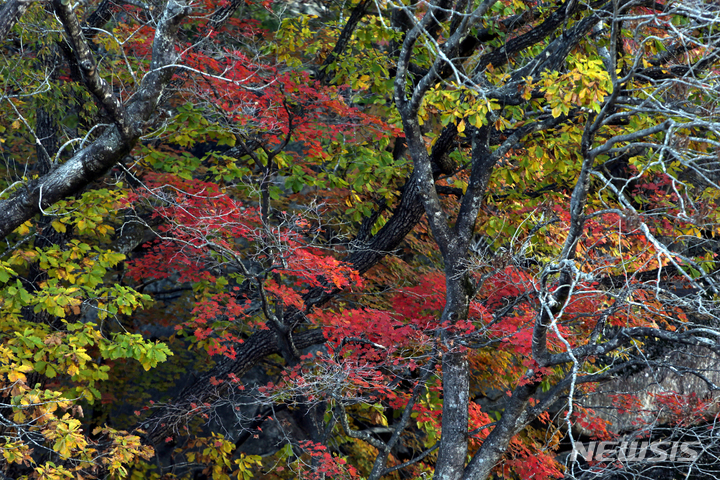 【NEWSIS】紅葉の絶頂のころと予想されていた24日午後、江原道束草市の雪岳山国立公園千仏洞渓谷で見つけた、色づいた紅葉。今年の紅葉は例年に比べて遅く、色づいた紅葉も早く枯れてしまっていて、あまり見られない。