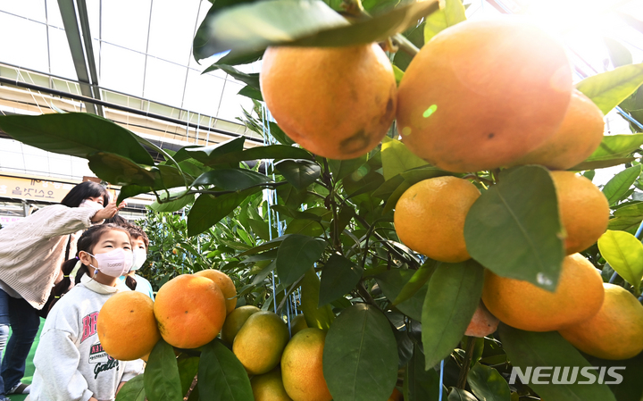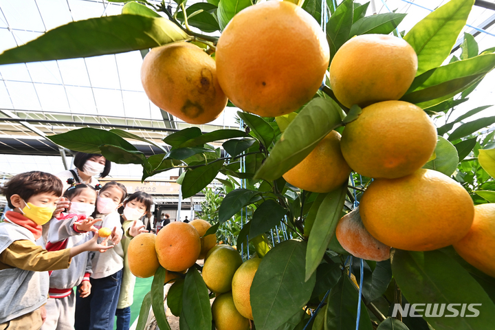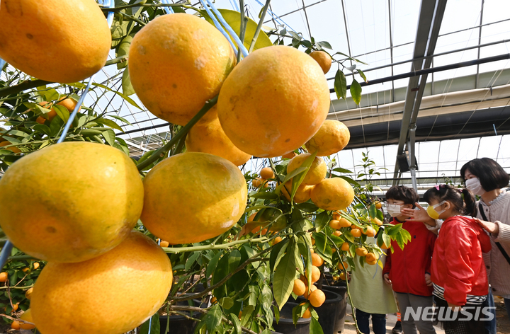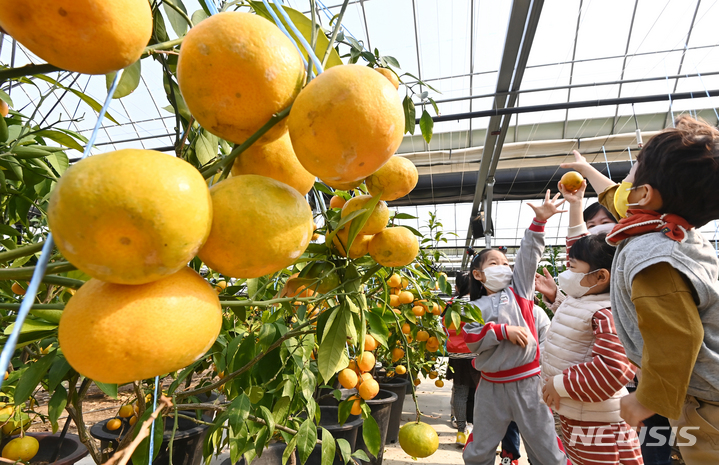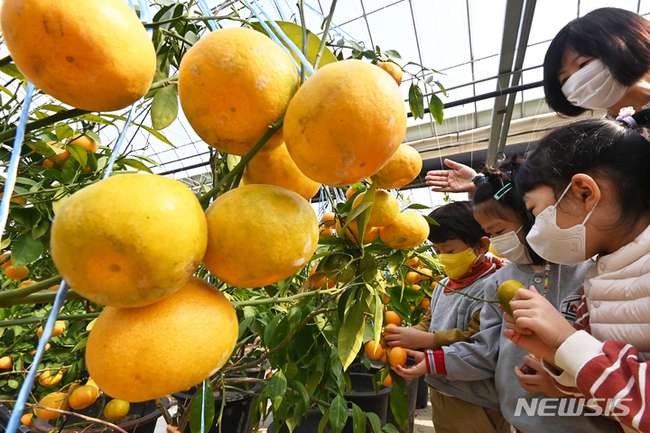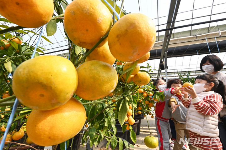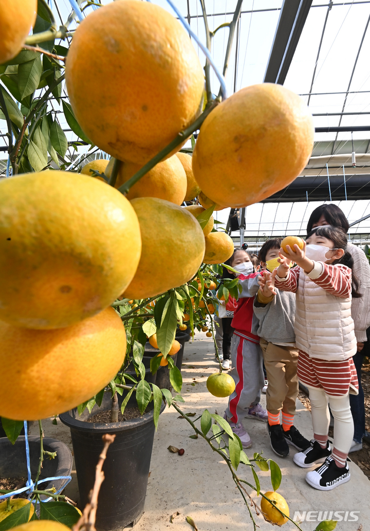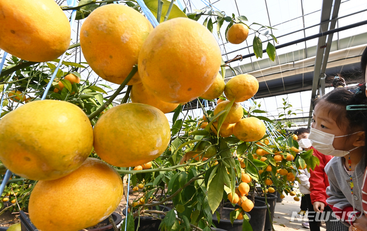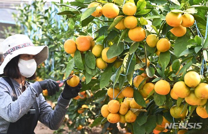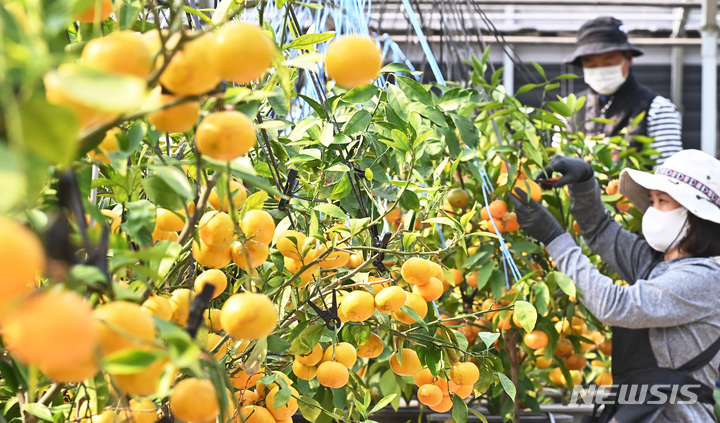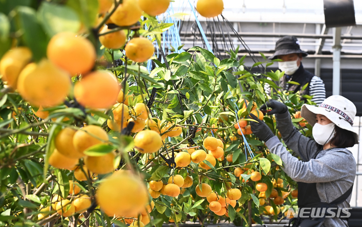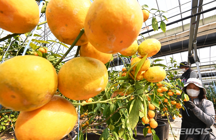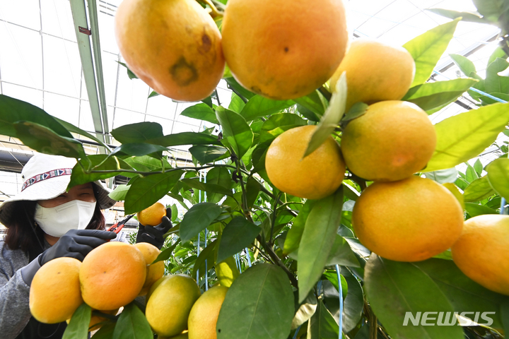 26日、京畿道広州市退村面のあるビニールハウスで、かんきつ類を収穫している農業者の様子。済州島をはじめとする温暖な南部地方が主体となっていたかんきつ類の生産地が、気候変動などによって次第に北上し、最近では中部地方の京畿道でも本格的に生産されている。