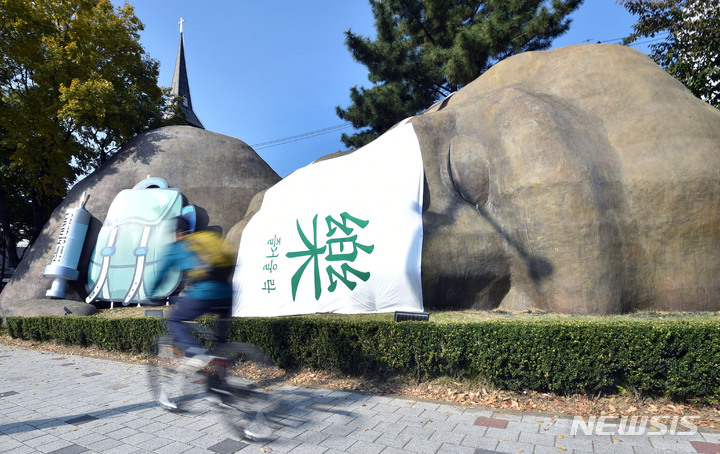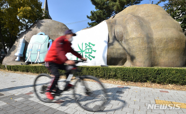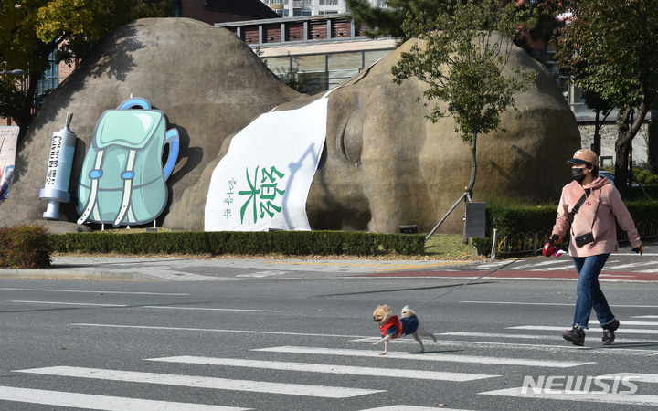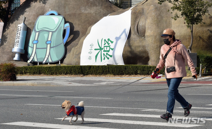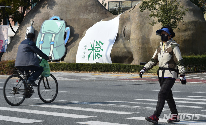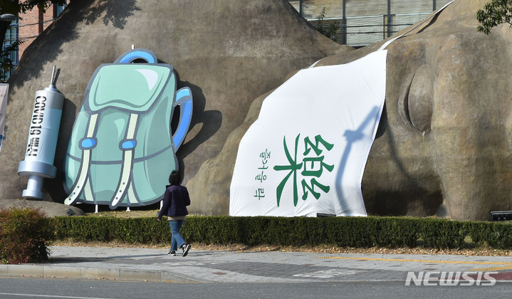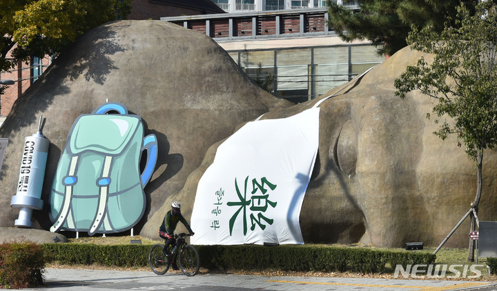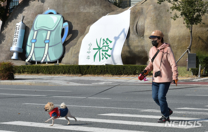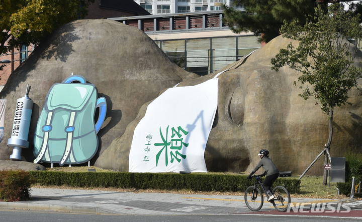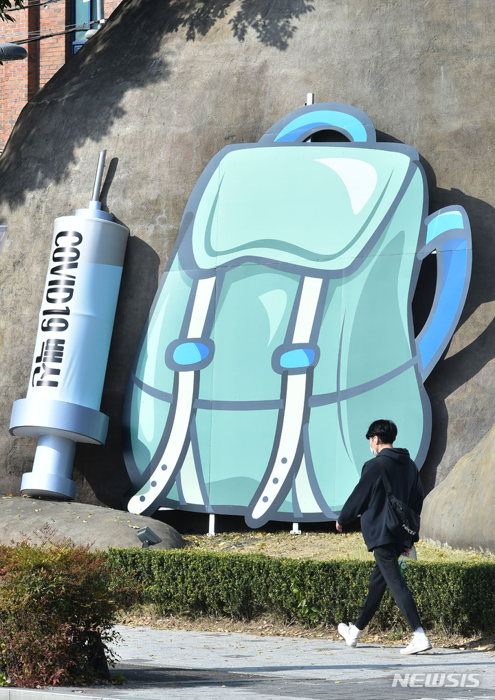 段階的日常回復(ウィズコロナ)第1段階の施行二日目に当たる2日午後、大邱市達西区辰泉洞の先史遺跡公園内にある原始人の造形物には「新型コロナワクチンの注射器」と「旅行用リュック」が設置され、市民の注目を集めていた。