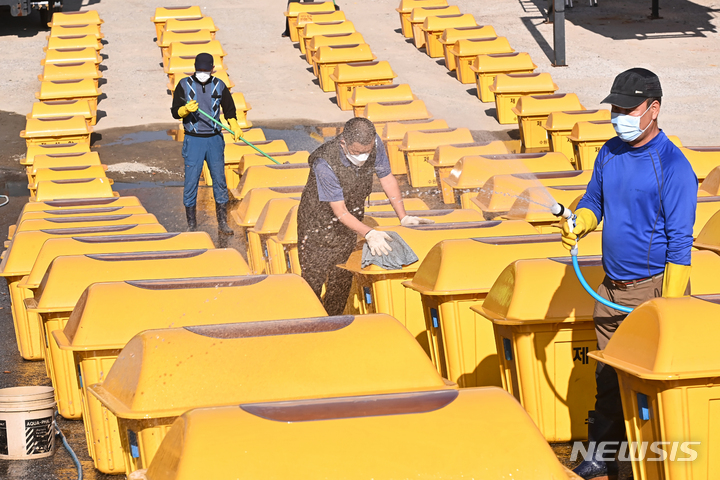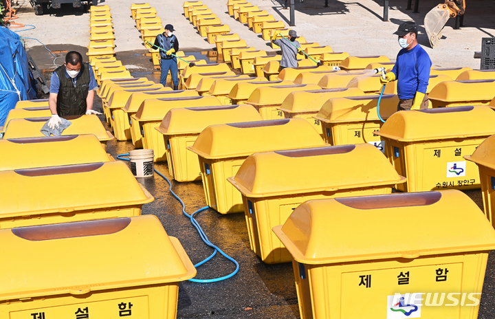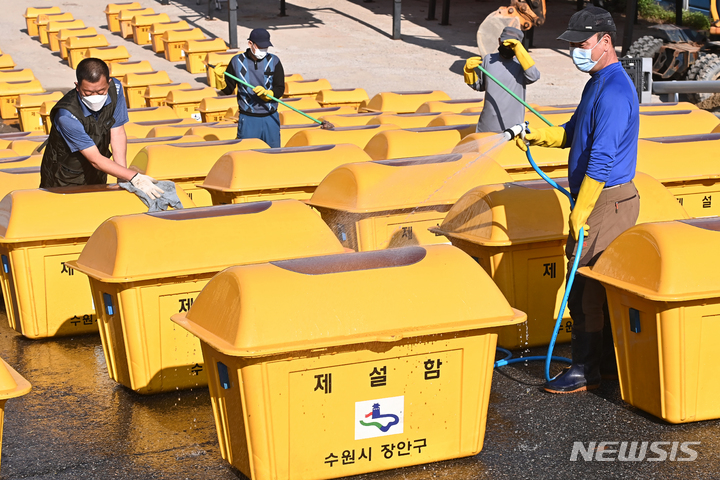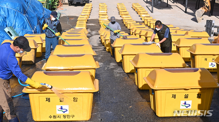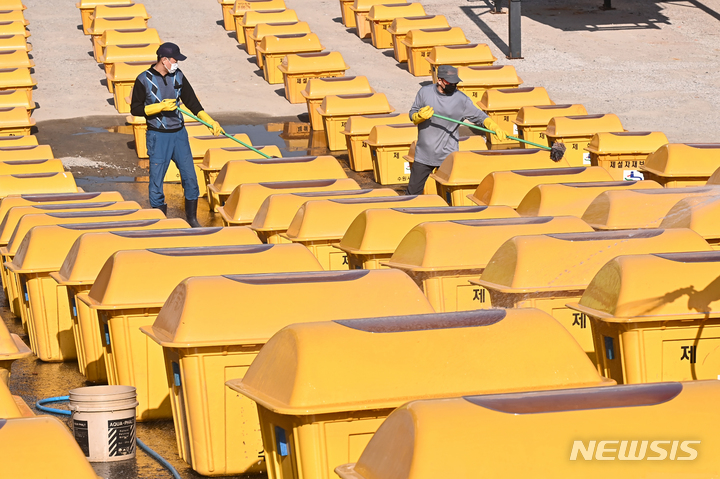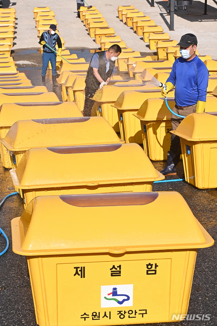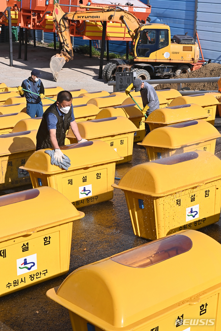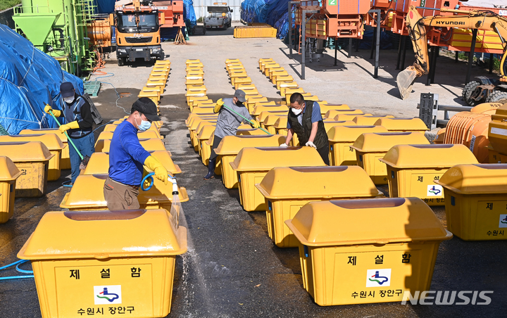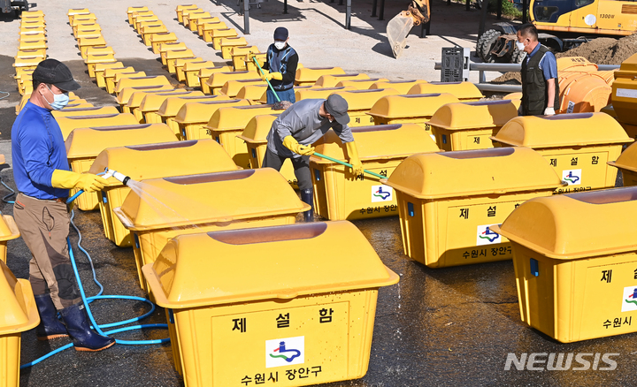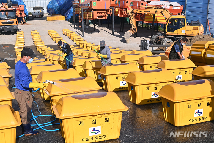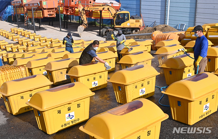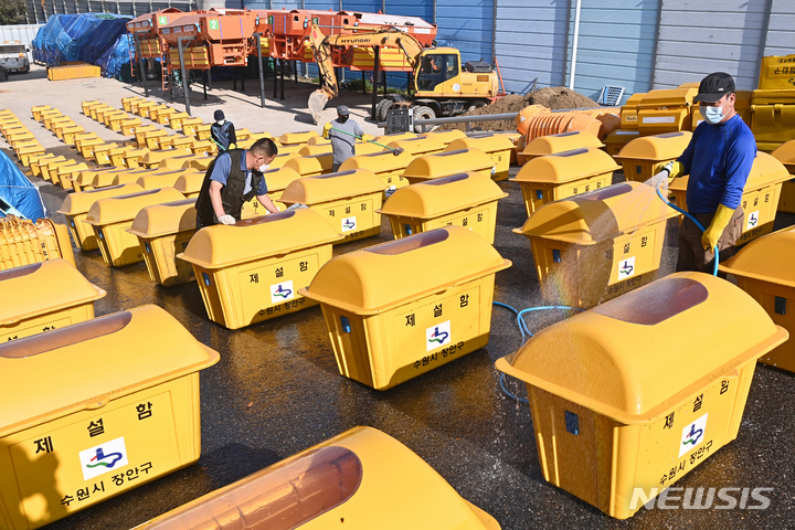 冬の始まりを告げる「立冬」まであと四日となった3日午前、京畿道水原市の長安区庁安全建設課資材倉庫では、関係者が「除雪箱」を洗浄して冬支度をしていた。