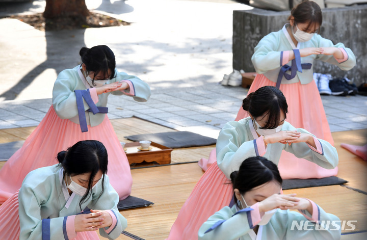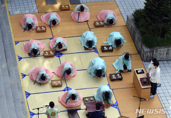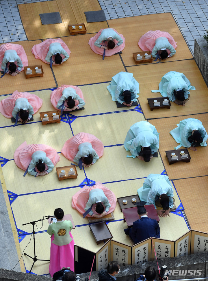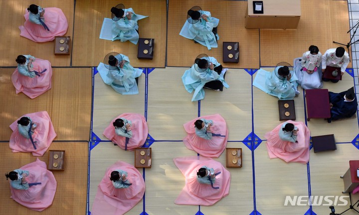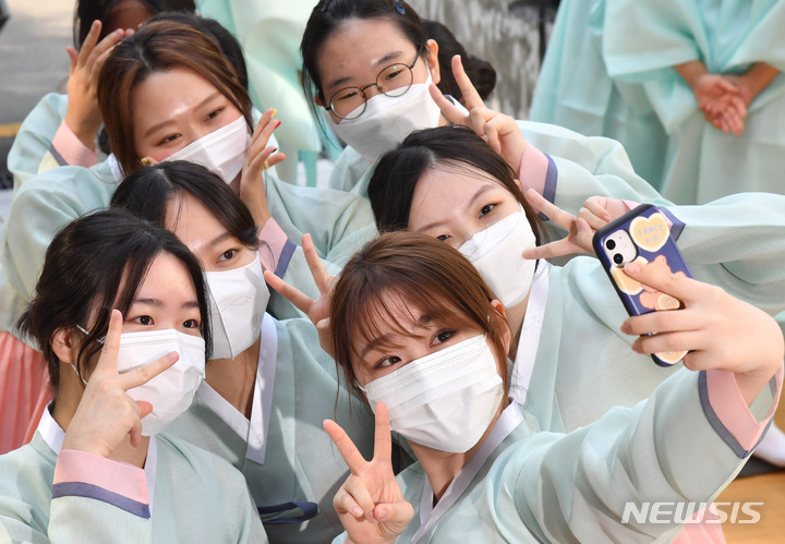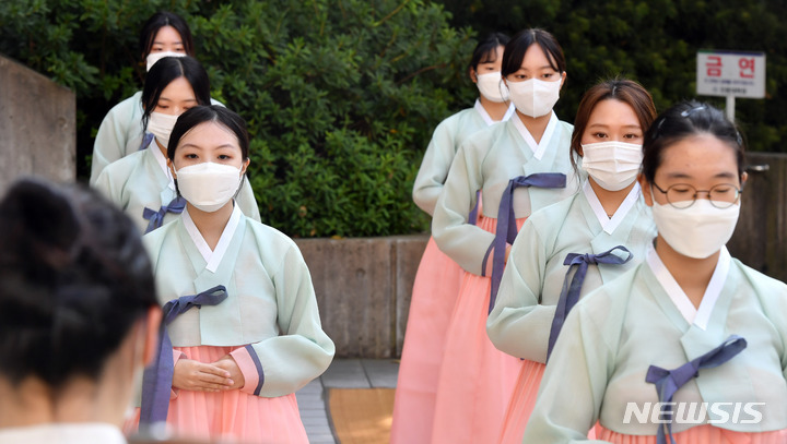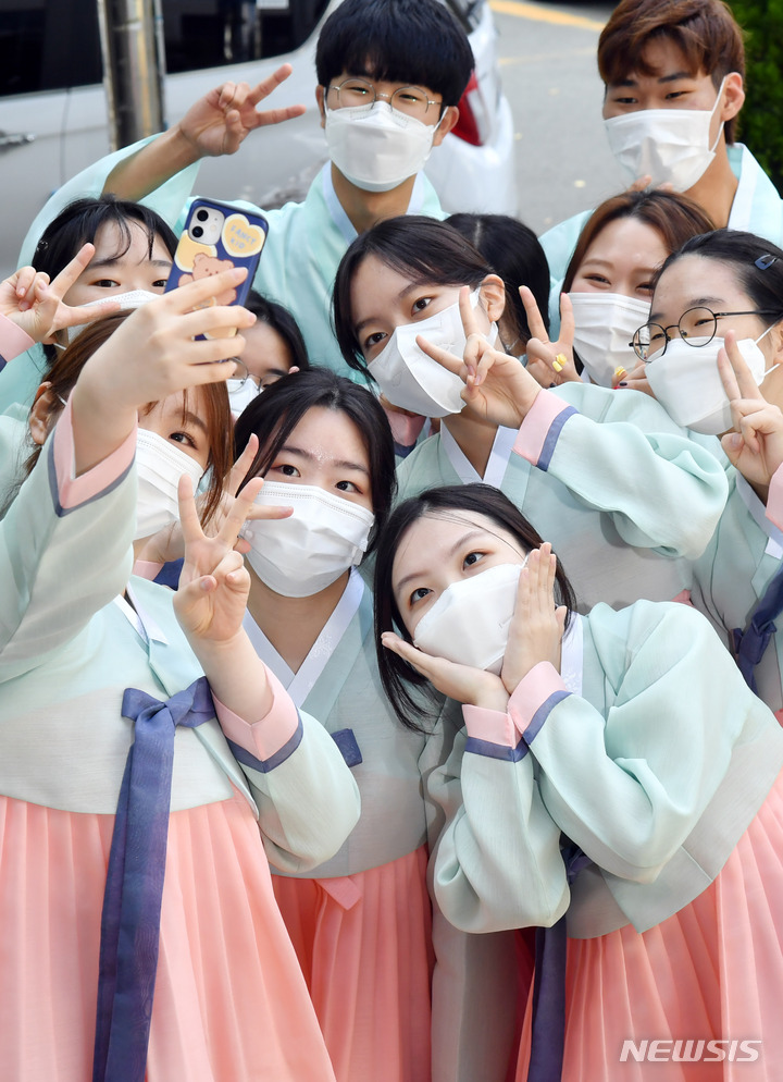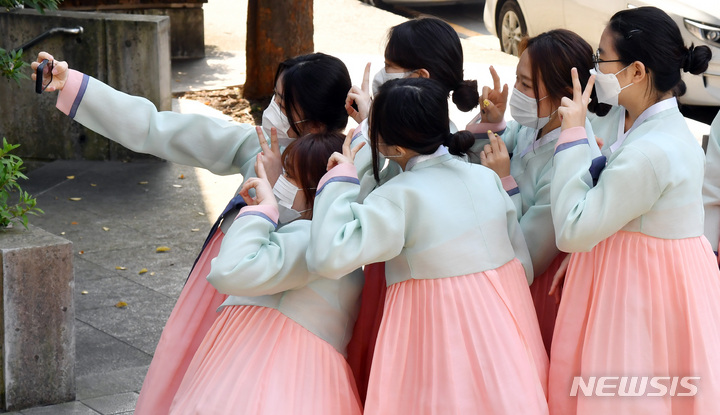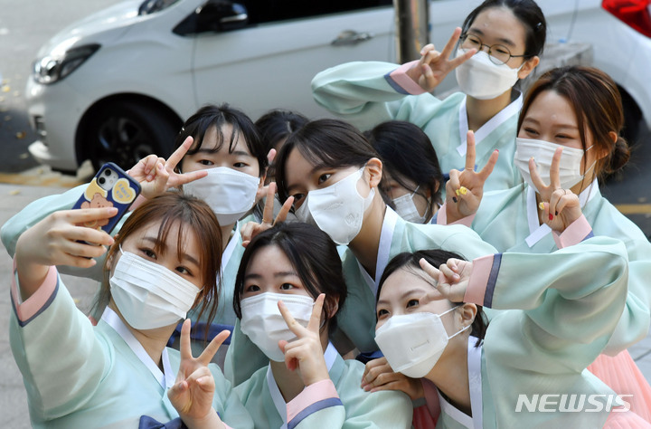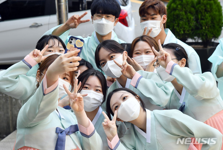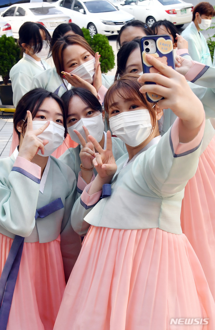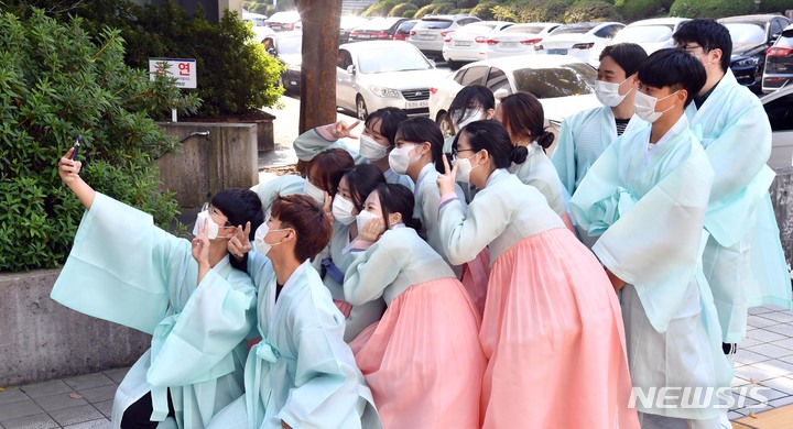 釜山大学の伝統成人式「第23回暁原成年祭」が開かれた3日午後、釜山市金井区の釜山大学キャンパスで、今年成人した韓文学科の学生らが韓服を着て記念写真を撮っているところ。釜山大学は、新型コロナの拡大により昨年は成年祭をオンラインで開催し、今年も行事を延期していた。