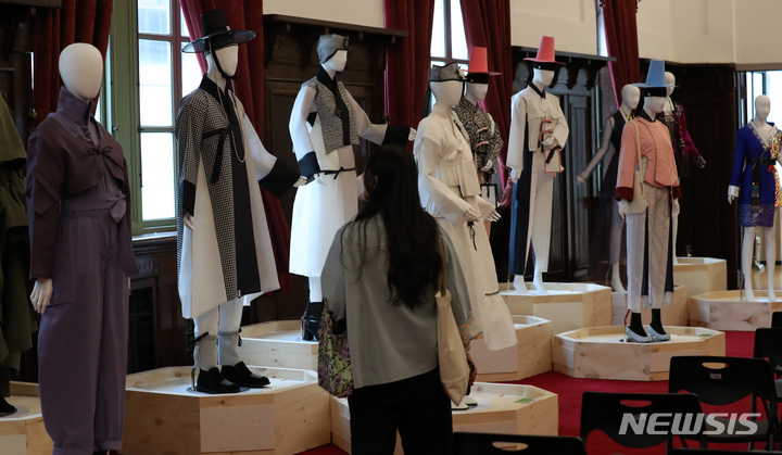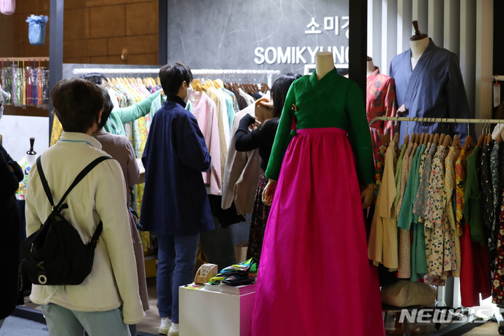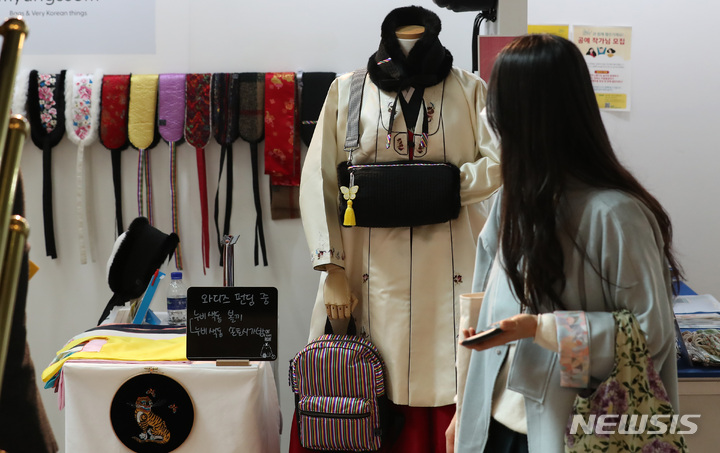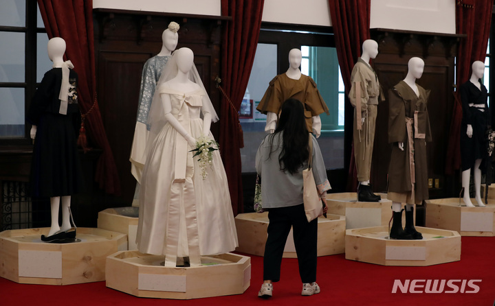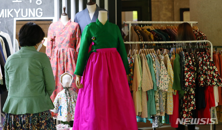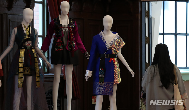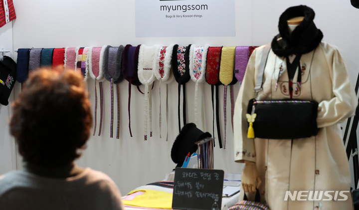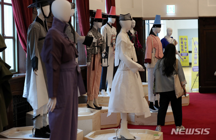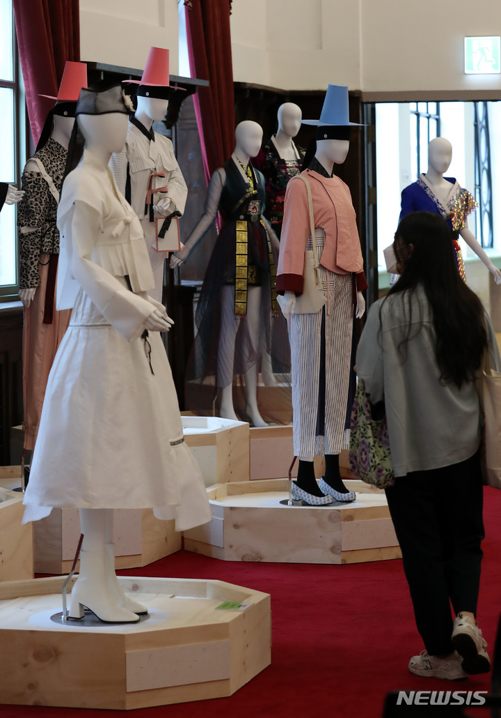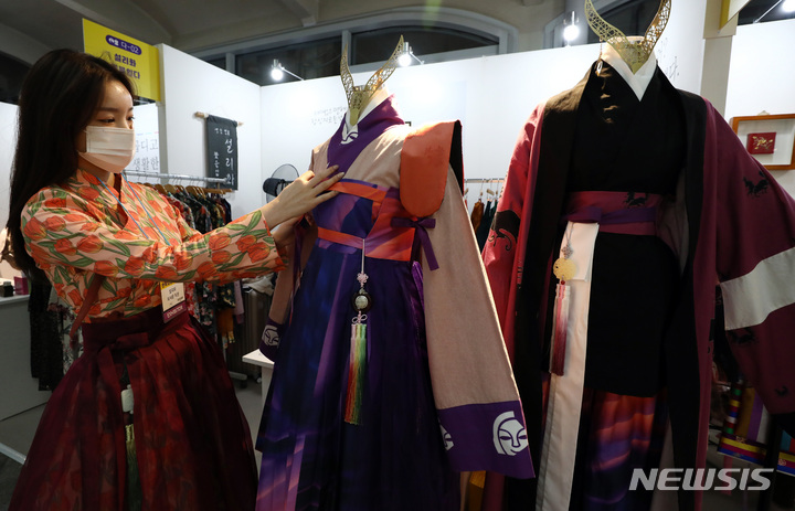 4日午後、ソウル市中区の「文化駅ソウル284」で始まった「2021韓服商店」にて展示中の2021年韓服デザイン公募展受賞作。今回のイベントは、伝統および生活韓服、アクセサリー関連企業などが参加して平均30%台の割引販売を行うもので、7日まで「文化駅ソウル284」で開催されている。