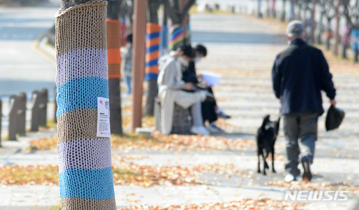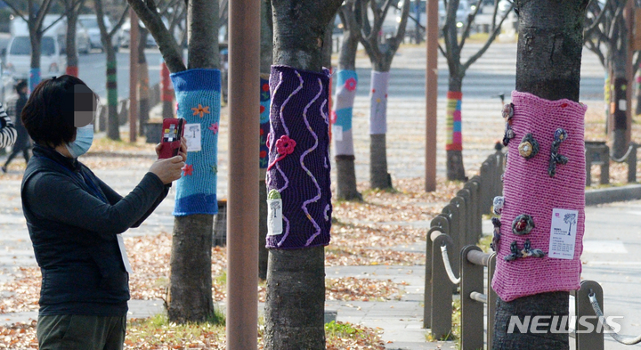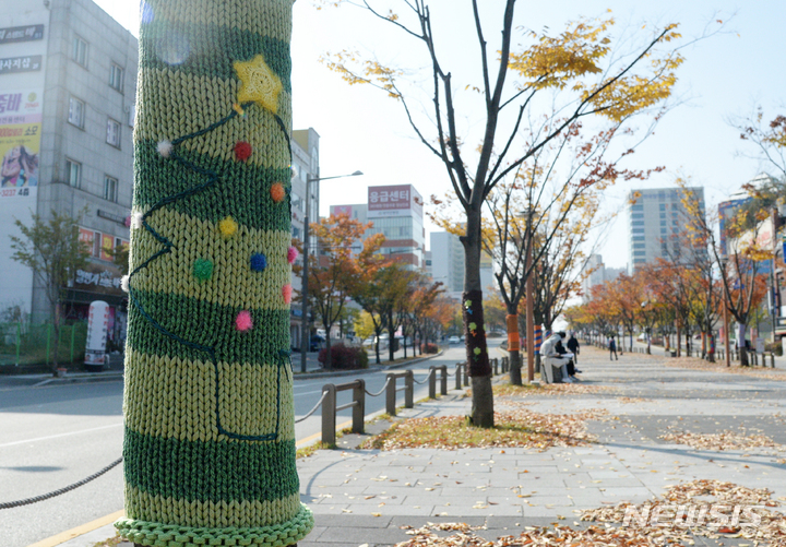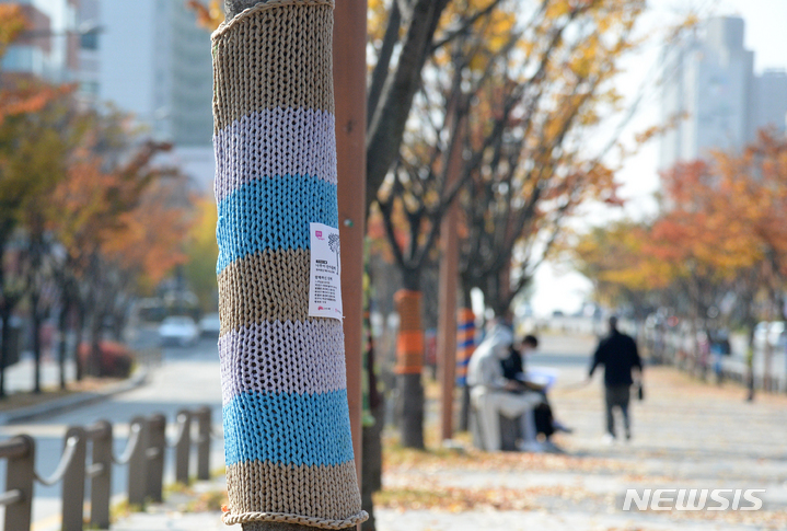 うららかな秋の天気が続いている4日、「ツリーハグ」が設置された全州駅前のチョッマジュン路(全羅北道全州市)の街路樹の様子。