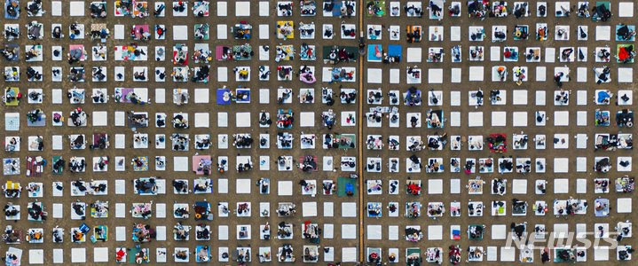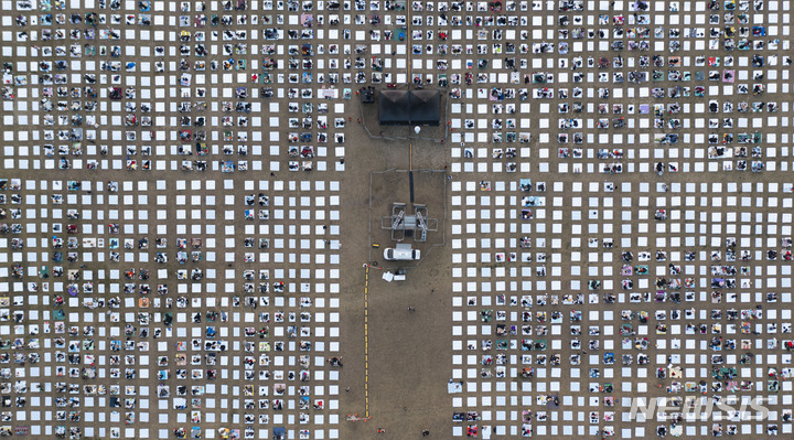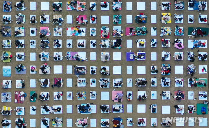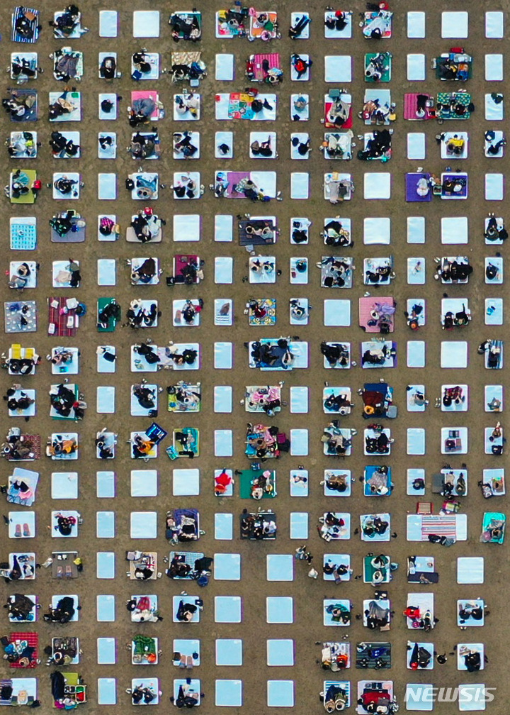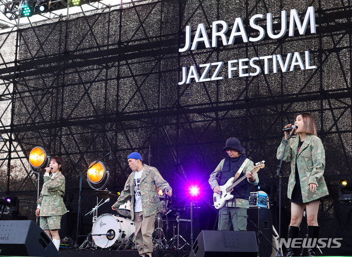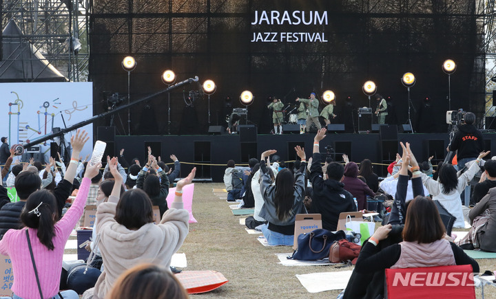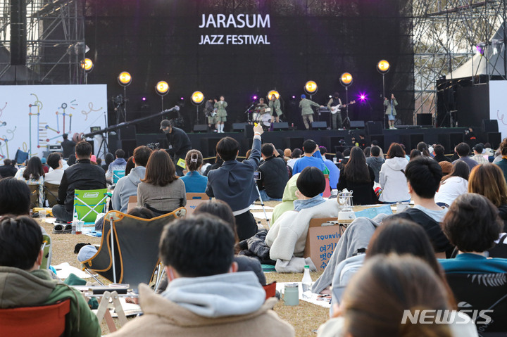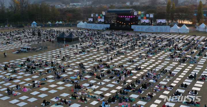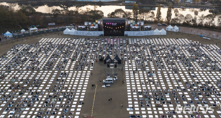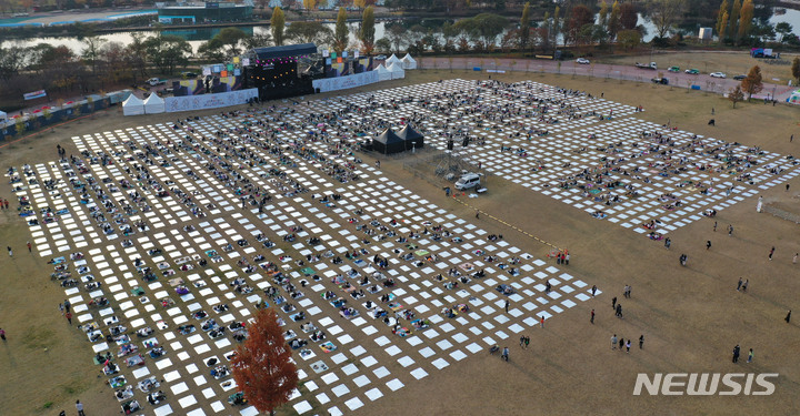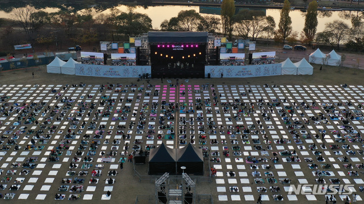 「段階的日常回復」(ウィズコロナ)施行後、初の週末を迎えた6日午後、京畿道加平郡のチャラ島で開かれた第18回ジャズフェスティバルを訪れた市民が公演を楽しんでいる様子。今回の公演は、韓国政府の「段階的日常回復」に基づいて「ワクチンパス」が適用された初の大規模野外公演だ。