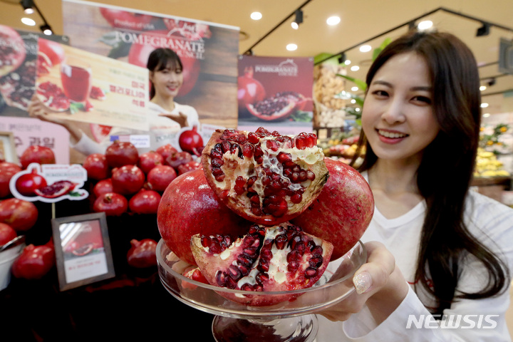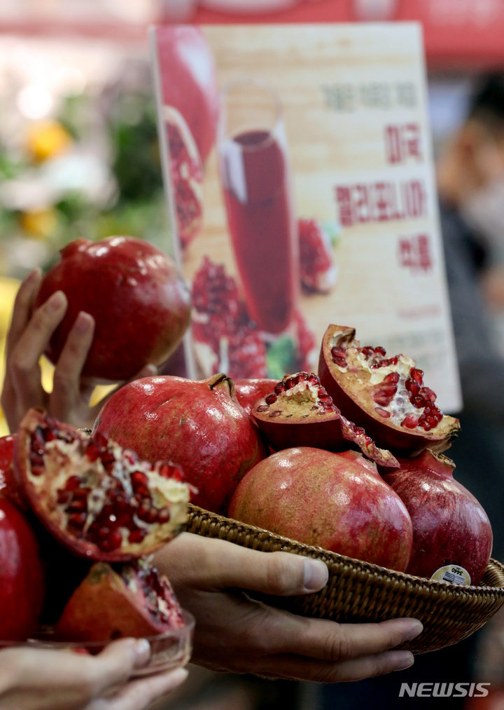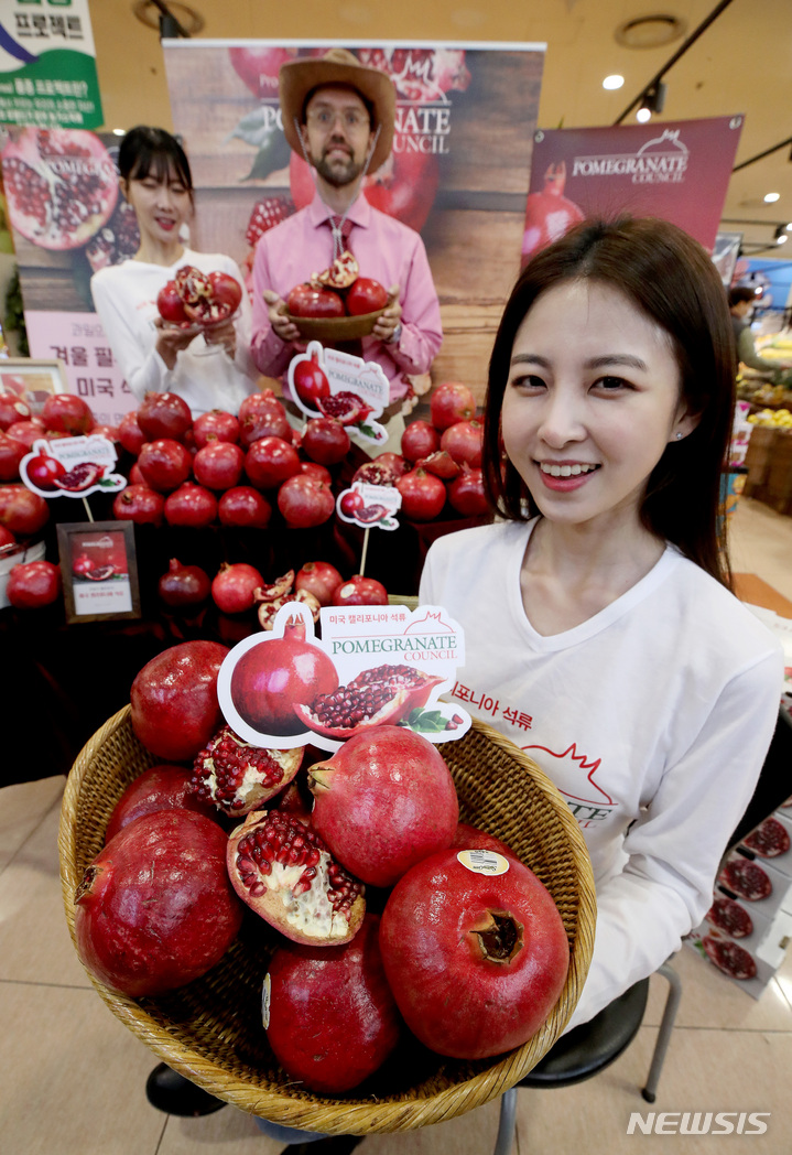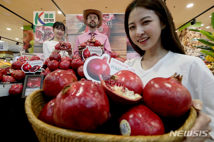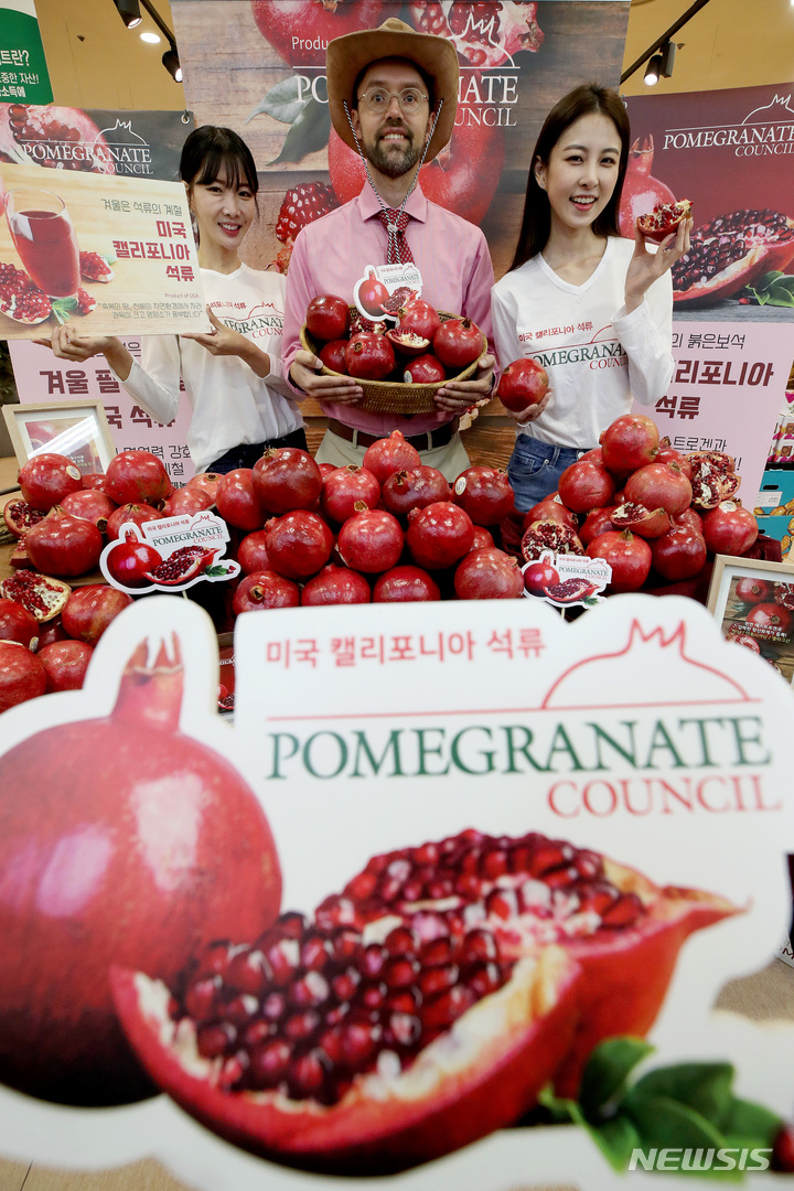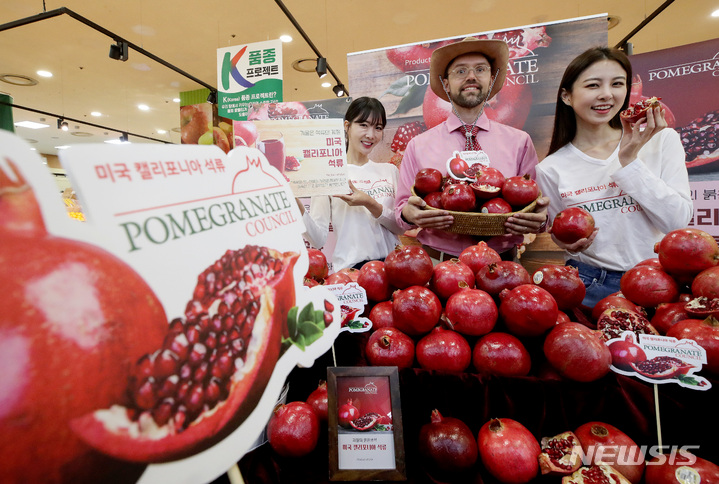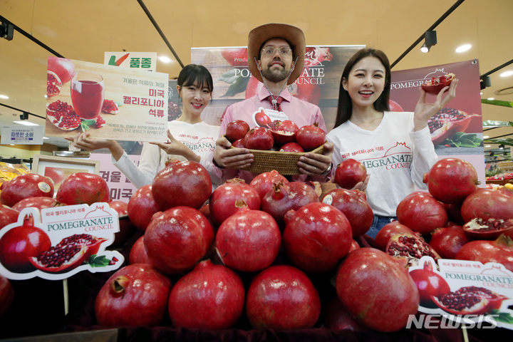 在韓米国大使館農産物貿易事務所(ATO)のアンドリュー・アンダーソン所長とコンパニオンが9日午前、ソウルの大手スーパー「ロッテマート」ソウル駅店で、初冬を代表するフルーツの「米国カリフォルニア産ざくろ」をPRしている様子。米国ざくろ協会(US Pomegranate Council)は、女性の健康や季節の変わり目の免疫力アップに有効な米国産ざくろが食べごろを迎え、韓国国内の大手スーパーやデパートで同時発売されると発表した。