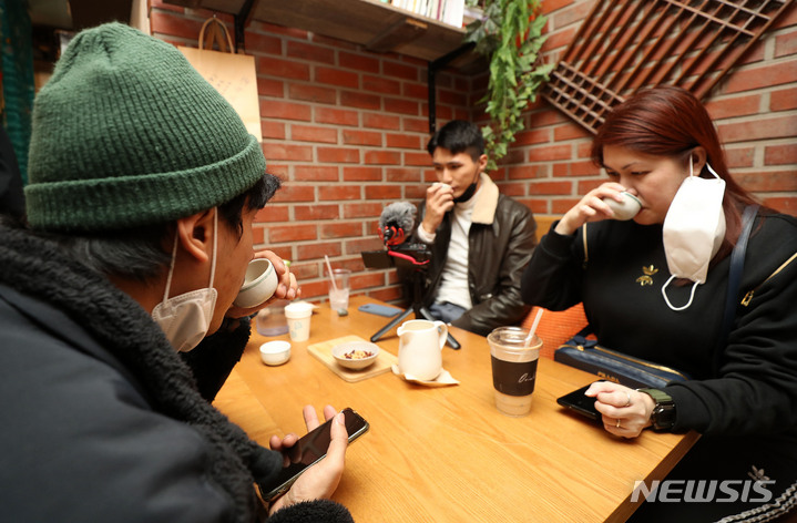 シンガポールの団体旅行客が19日午後、ソウル市竜山区の解放村にある酒屋「尹酒党」で、マッコリ作り体験をしているところ。この団体旅行客は、韓国-シンガポール間の旅行安全圏域(Vaccinated Travel Lane/VTL. ワクチン接種済トラベルレーン)の施行に伴って今月15日に韓国入りした。