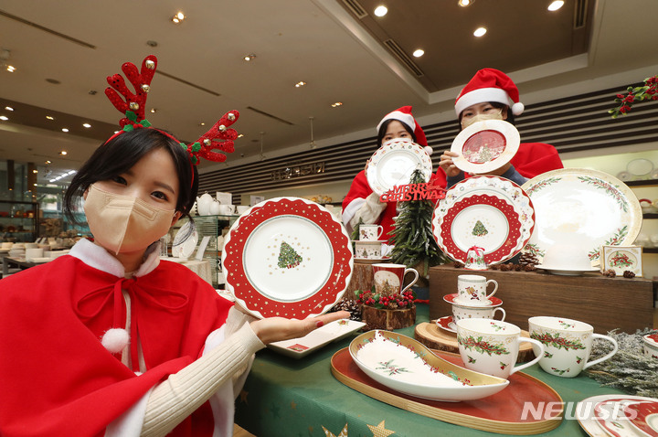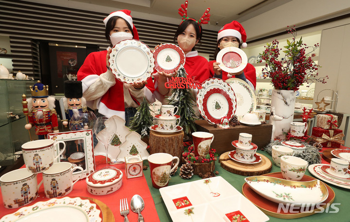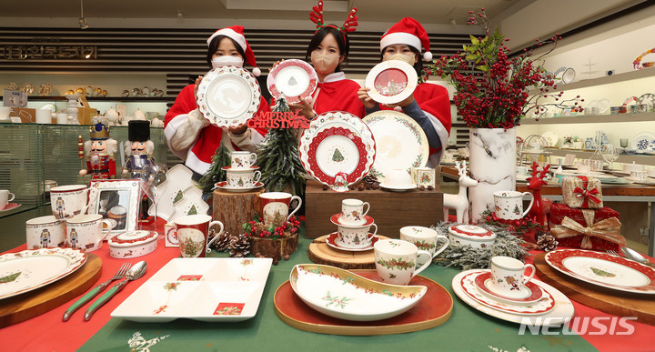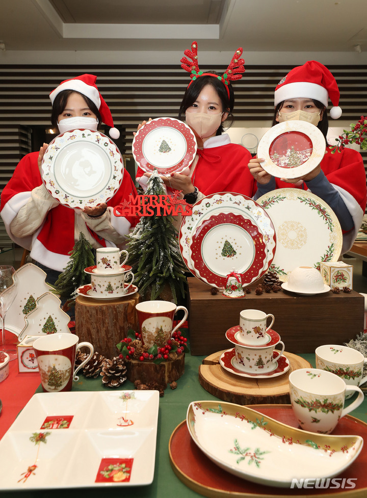 ソウル市東大門区の韓国陶磁器中央店で9日午前、コンパニオンらがさまざまなデザインのクリスマス用ギフトセットをPRした。