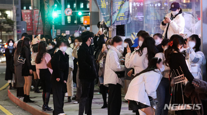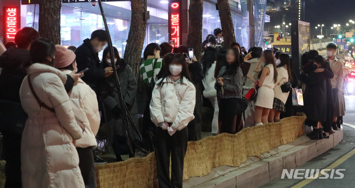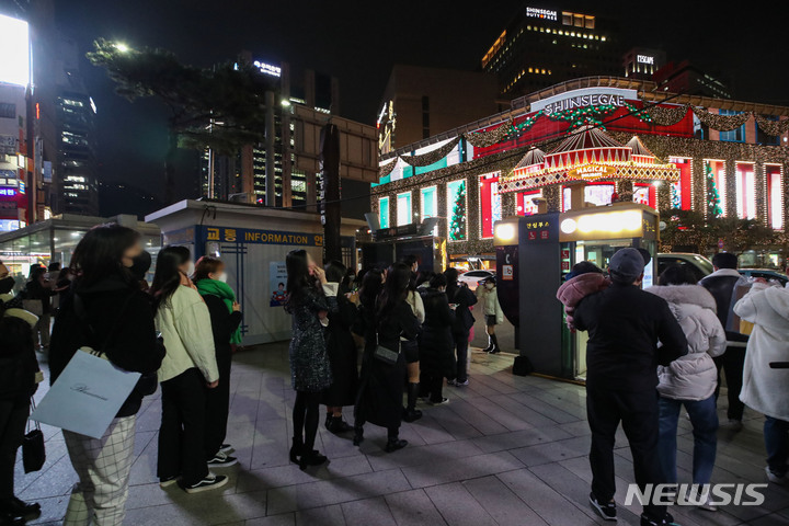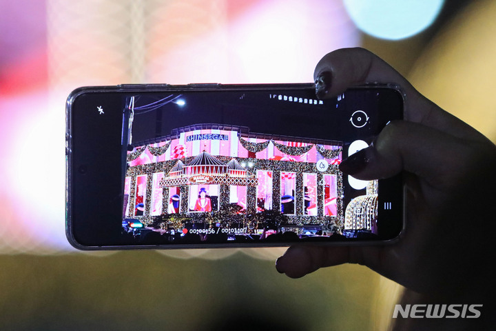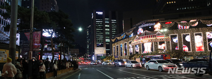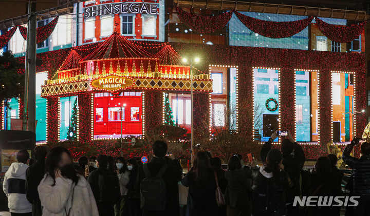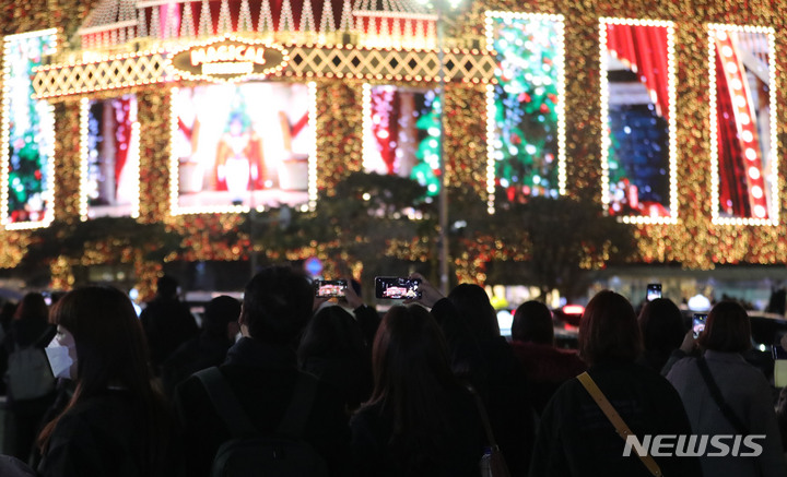 クリスマスをおよそ半月後に控えた9日午後、ソウル市中区の新世界百貨店本店付近は、クリスマスのメディアファサードを撮影しようと集まった市民たちで混雑していた。
