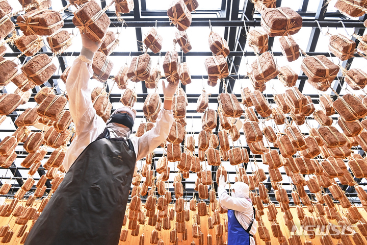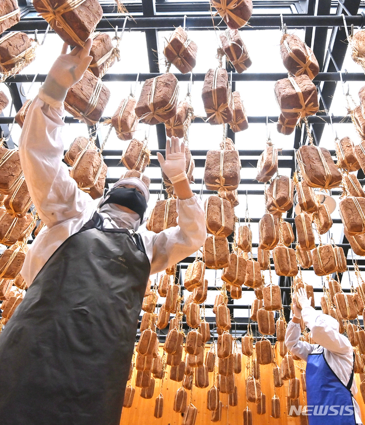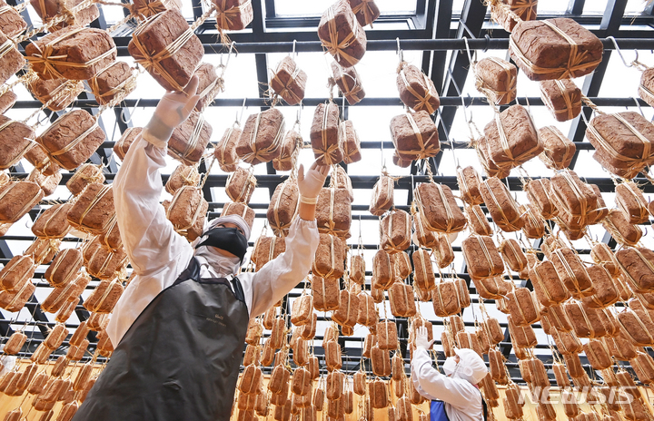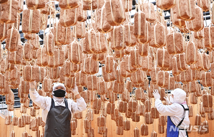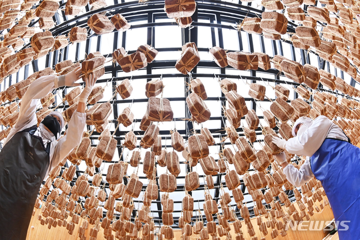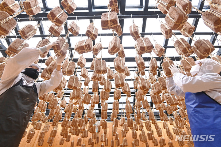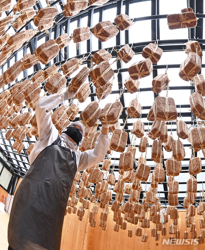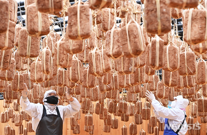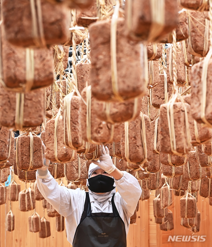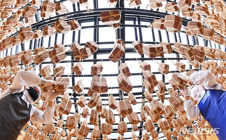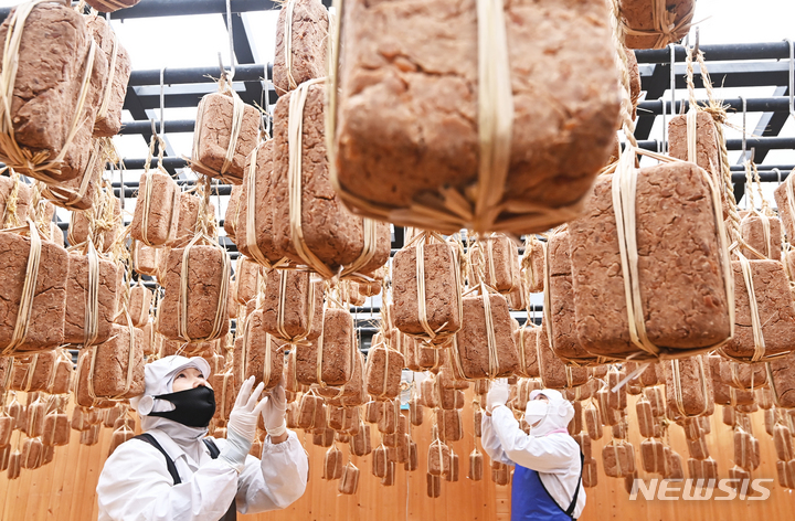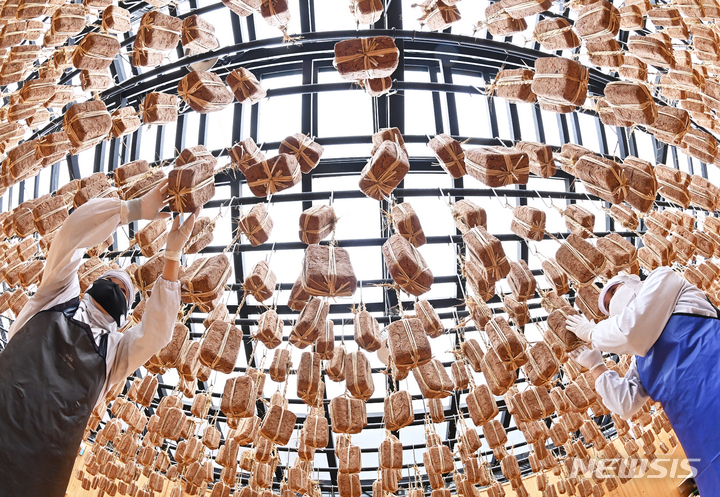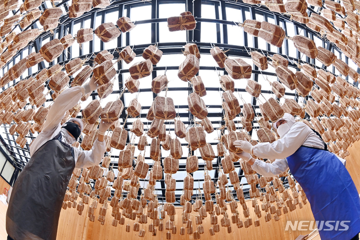 京畿道安城市一竹面のソイル農園で14日午前、ずらりと吊り下げられた「メジュ(みそ玉)」を見て回る農園関係者の様子。