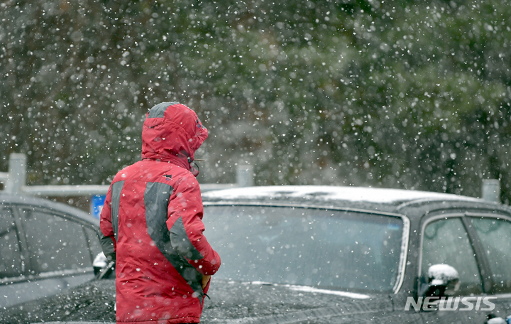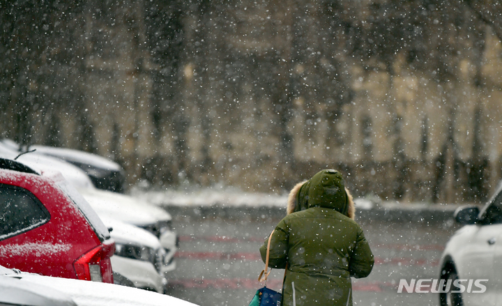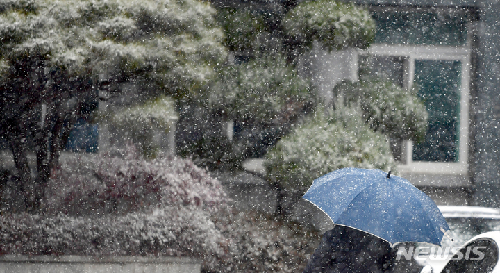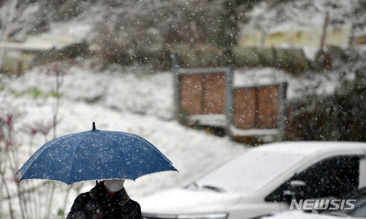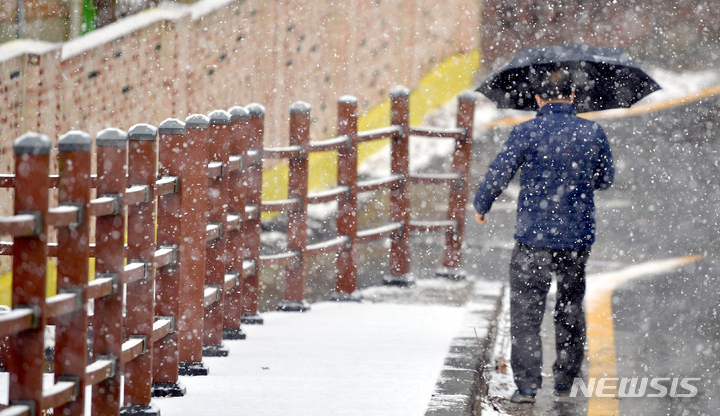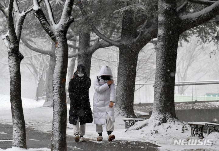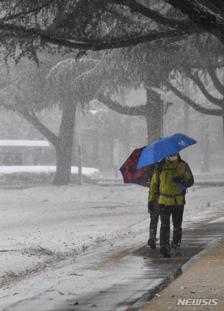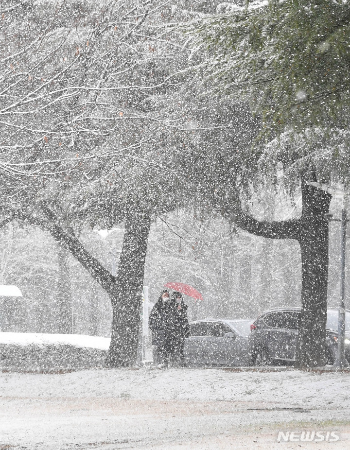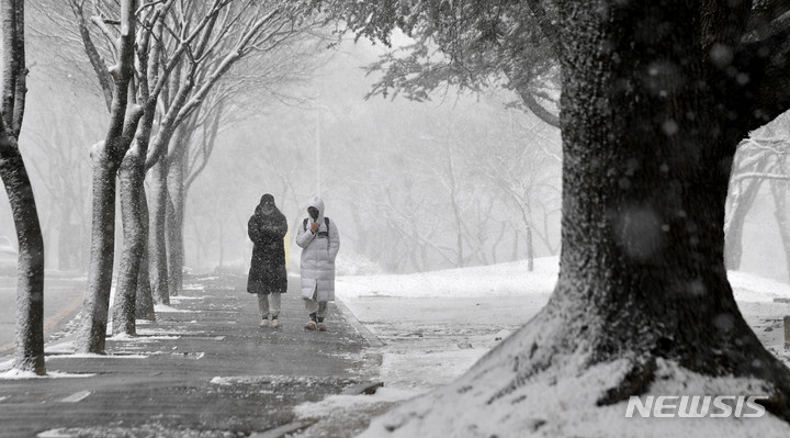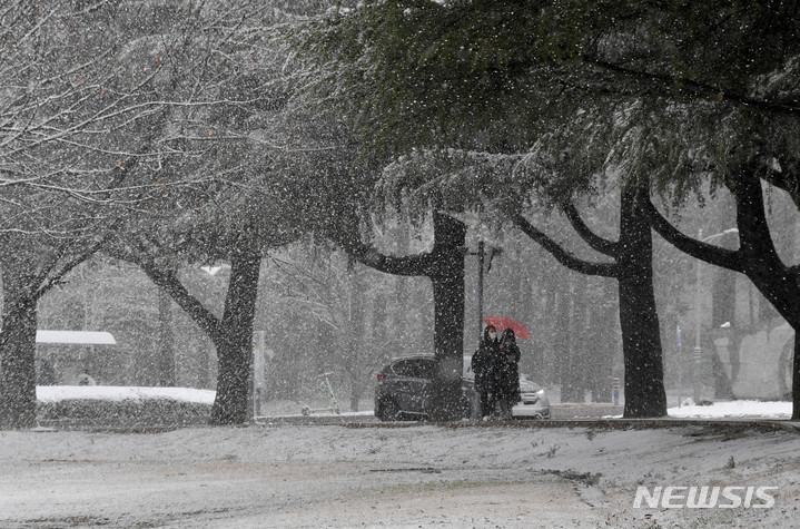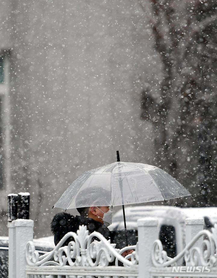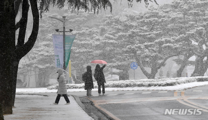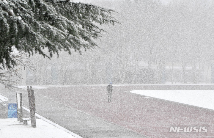 光州・全羅南道地方の各所に大雪特報が発令された17日午後、光州市北区竜鳳洞の全南大学グラウンドでは、雪煙の中でかさを差した市民が歩みを急いでいた。