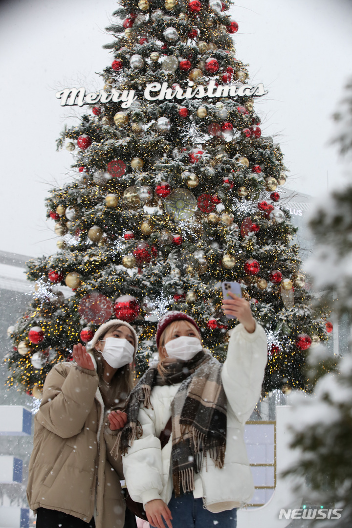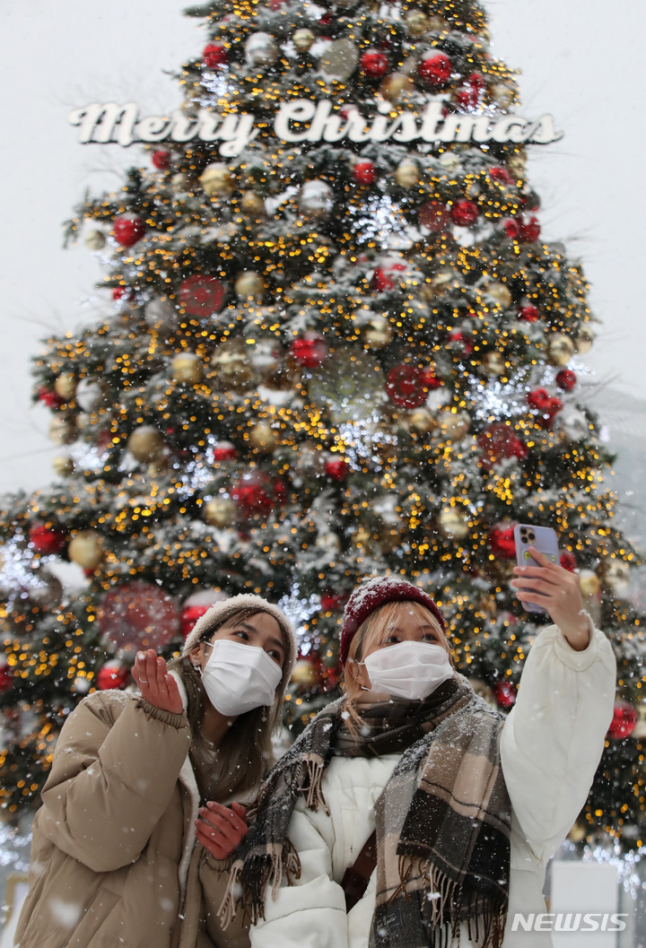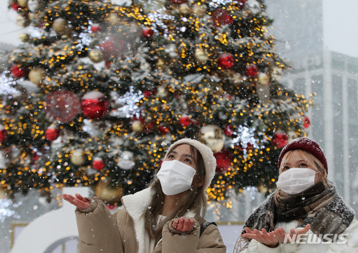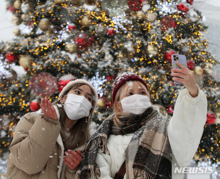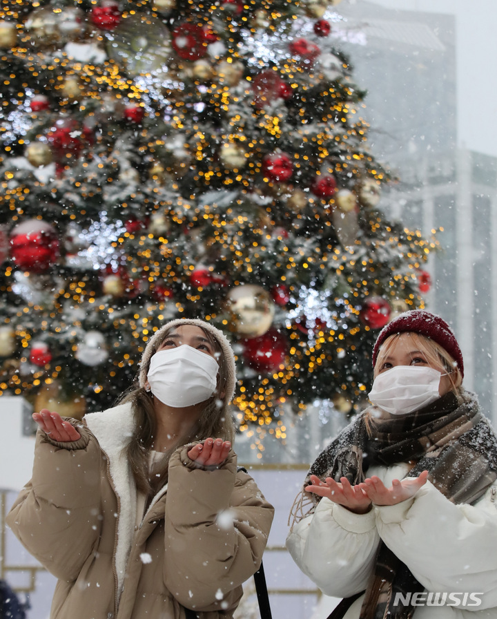 今冬初の大雪注意報が発令された18日午後、ソウル広場のクリスマスツリー前で、降りしきる綿雪を迎える留学生の様子。