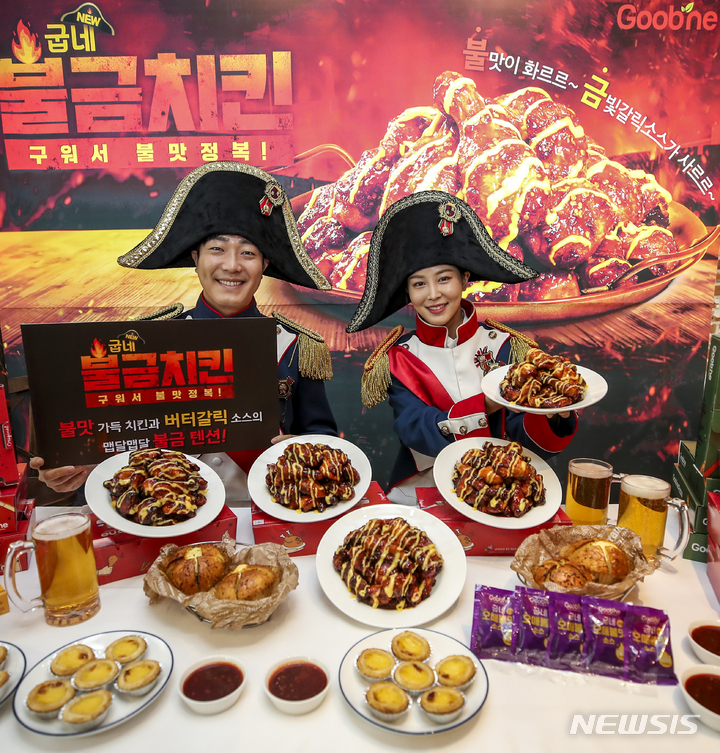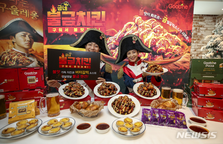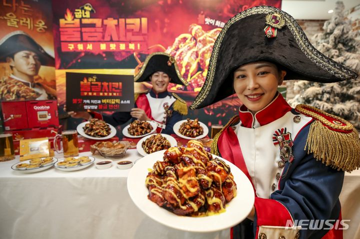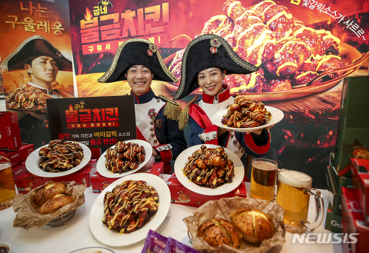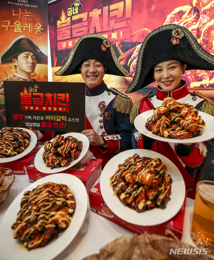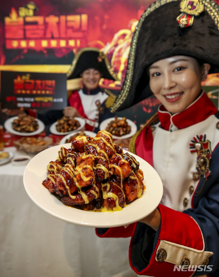 ソウル市内にあるクムネチキン塩倉駅店で21日午前、コンパニオンらが新商品「クムネ・プルグムチキン」をPRした。