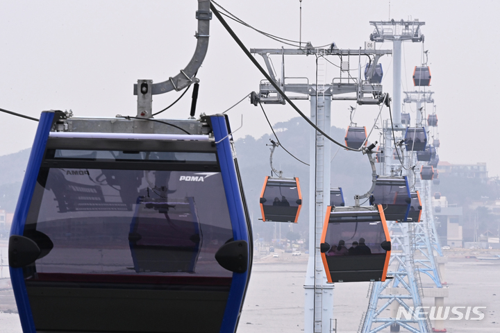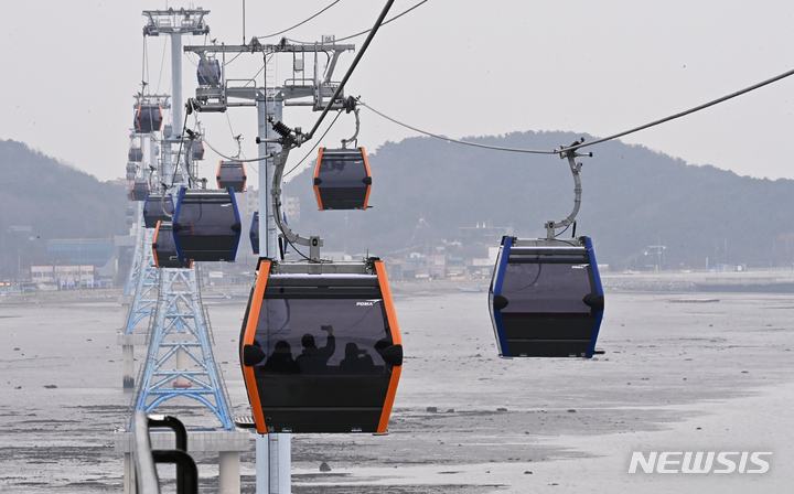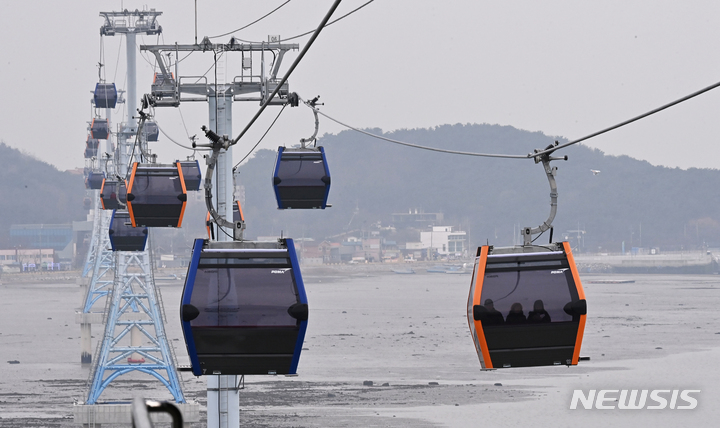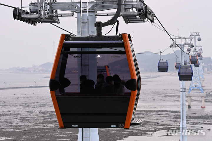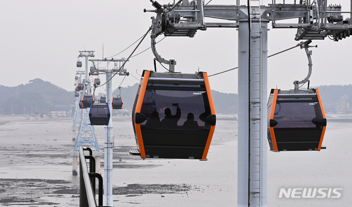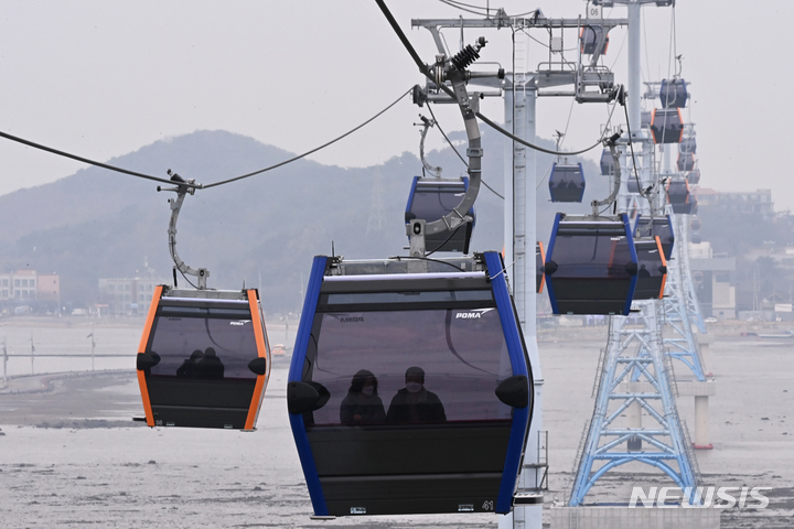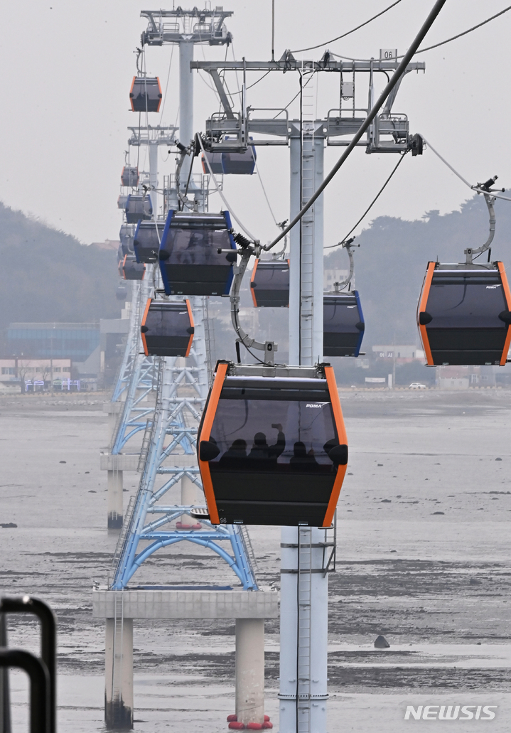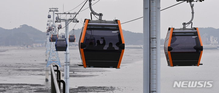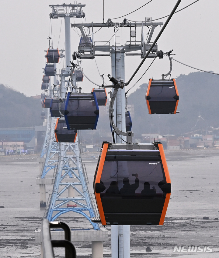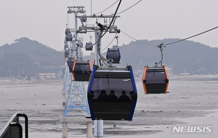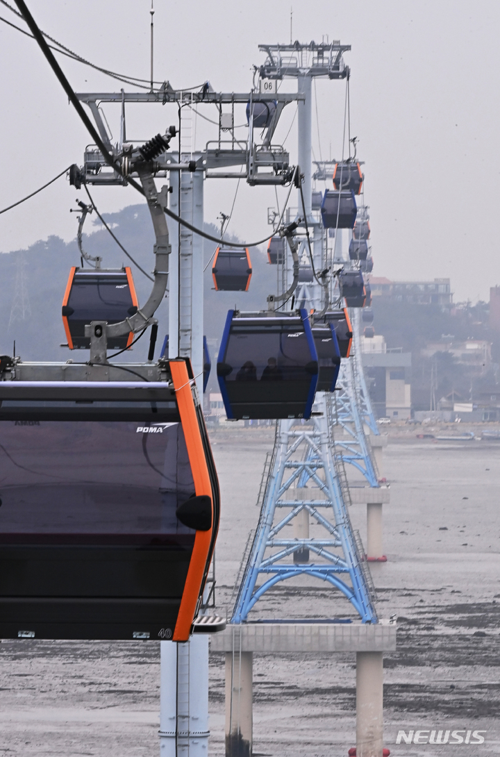 24日、京畿道華城市の前谷港と済扶島を結ぶ「ソヘラン済扶島海上ケーブルカー」が運行している様子。ソヘラン済扶島海上ケーブルカーは、自動循環式のゴンドラで華城市西新面檣外里(前谷港コリョム山)から済扶島入口までの海上区間を運行する。海上区間の長さは2.12キロで、韓国では最長だ。