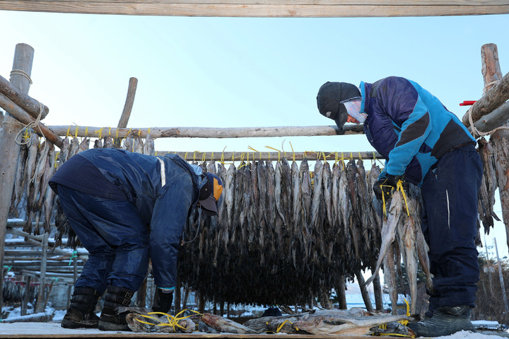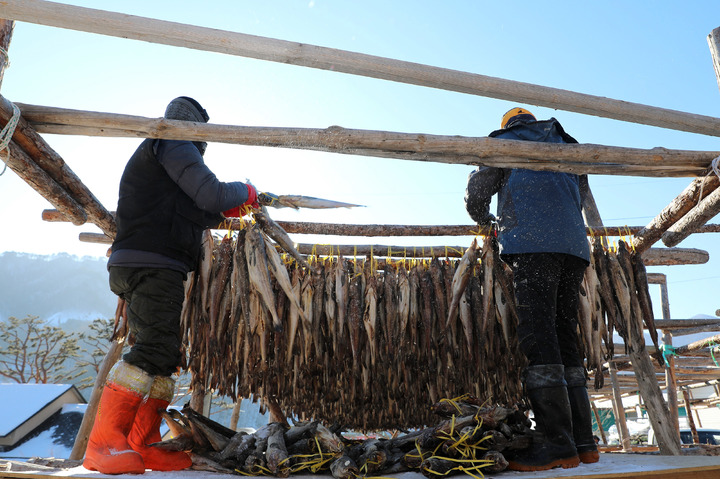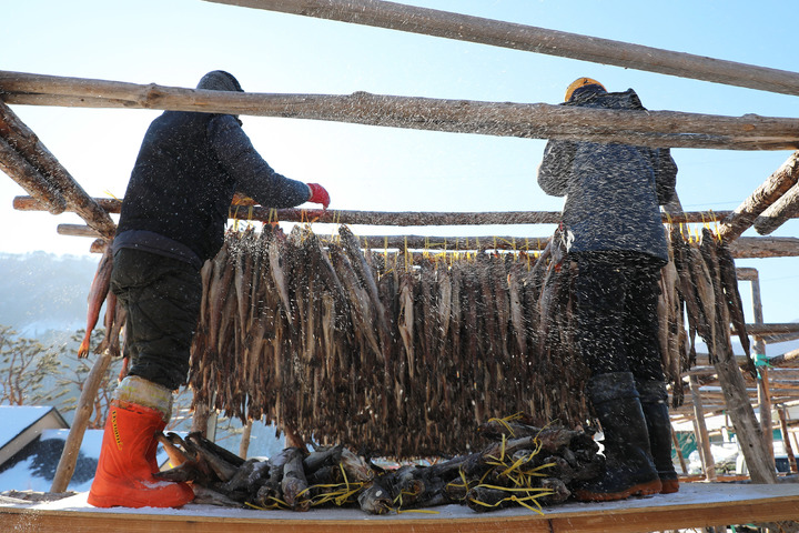 【NEWSIS】この冬、最も気温が下がった26日午前、江原道麟蹄郡のタラ干し場で、カチカチに凍ったタラを干す人々。タラが冬の間数カ月間にわたり凍ったり溶けたりを繰り返してこそ、最高の味のファンテ(干しダラ)になる。(写真提供=麟蹄郡庁)