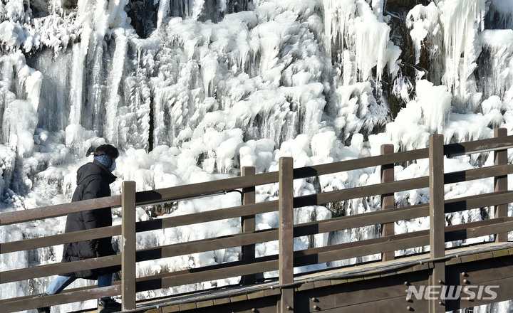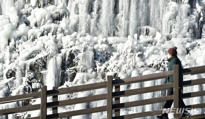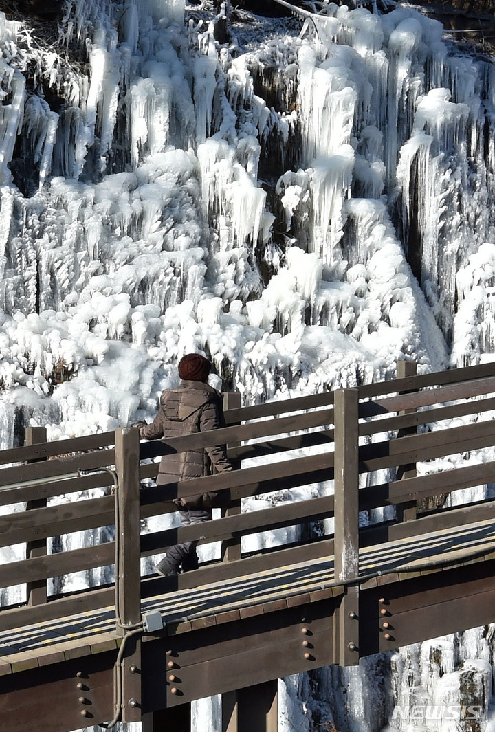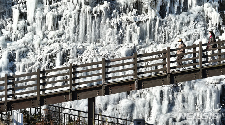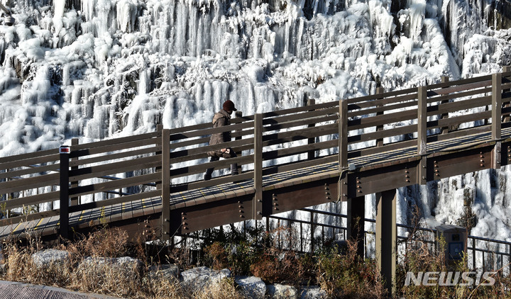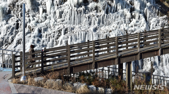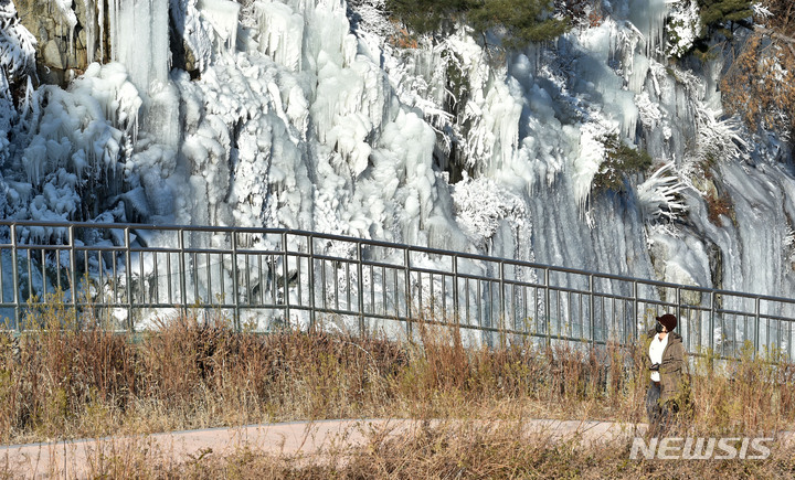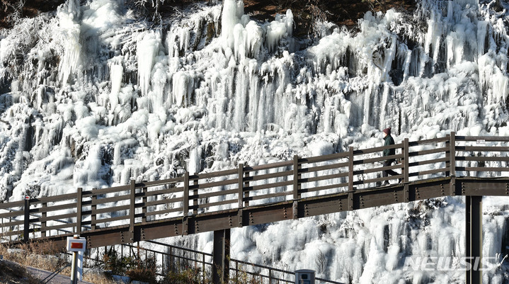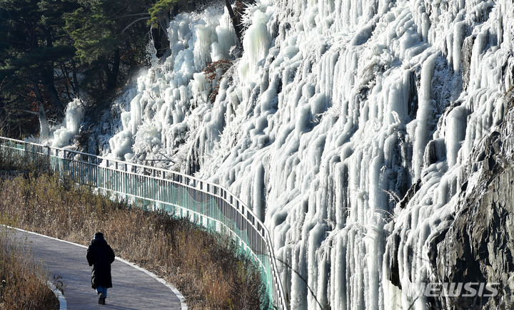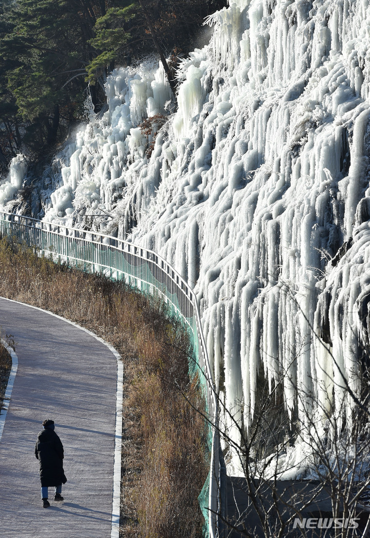 全国のほとんどの地域に寒波特報が発令されるなど、厳しい寒さとなった27日午前、大邱・達城郡の玉淵池宋海公園の散策路横には巨大な氷壁ができ、壮観な光景が広がっていた。