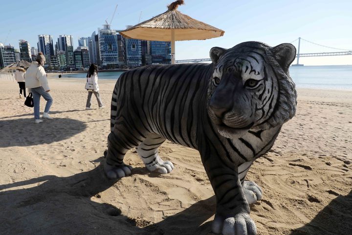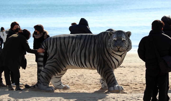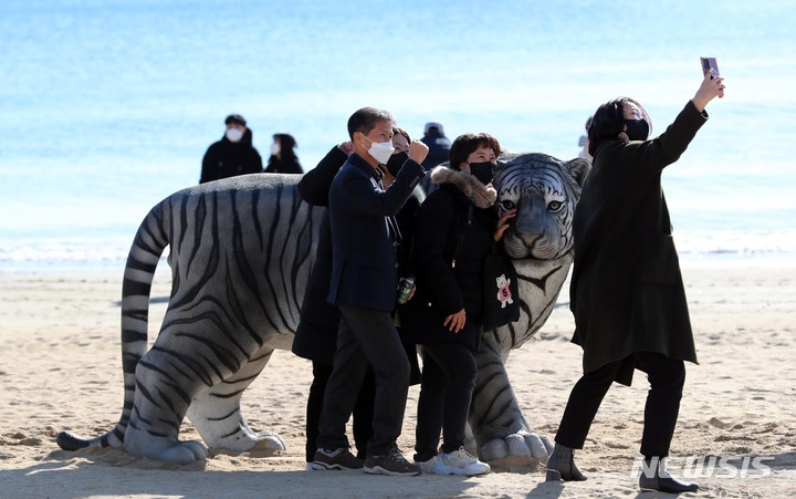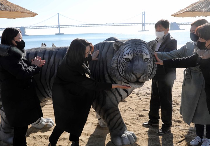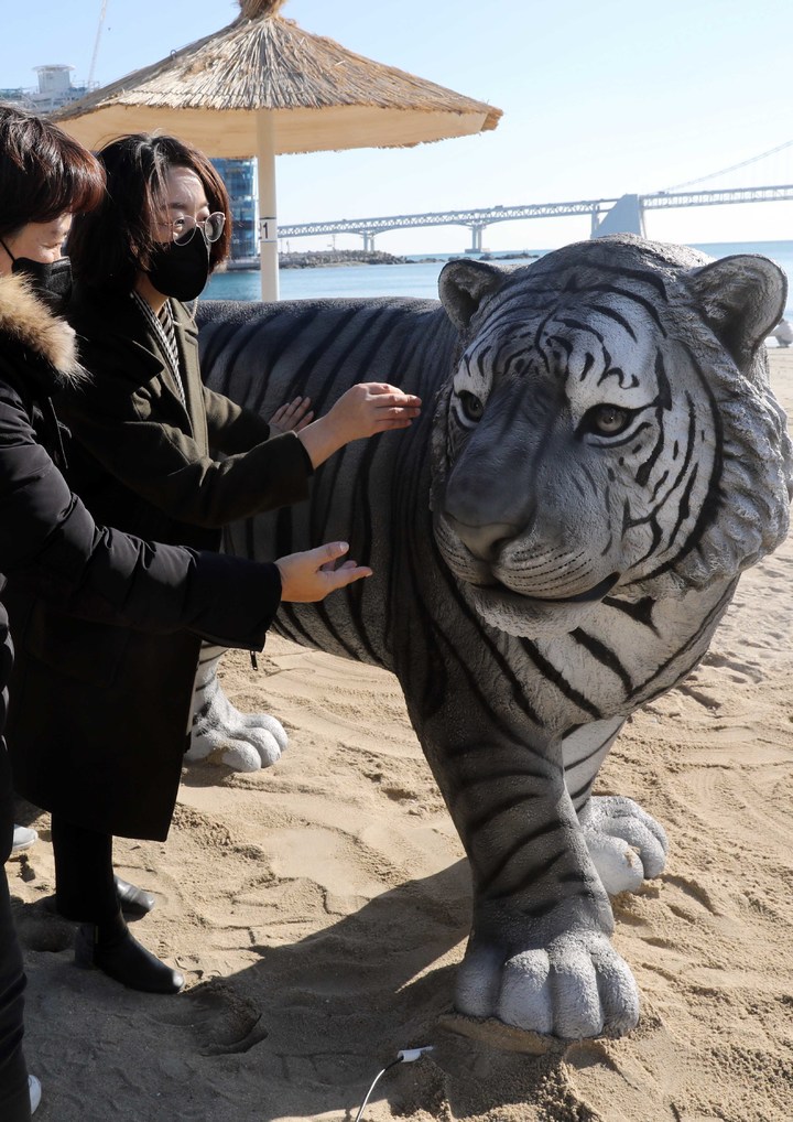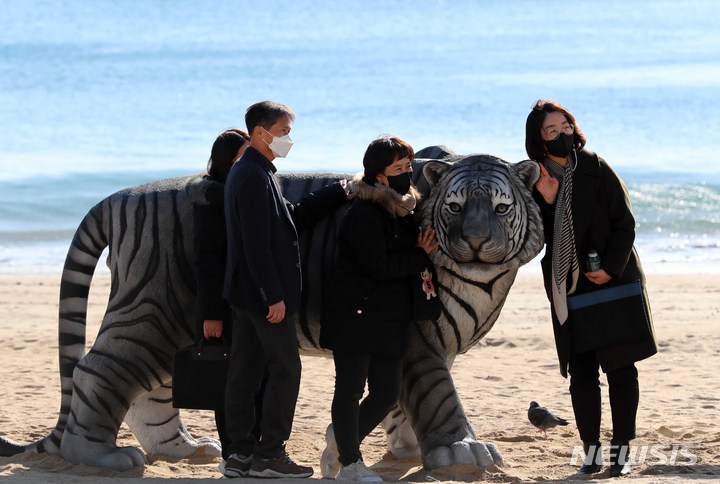 2022・壬寅(みずのえとら)の新年が迫る30日、釜山市水営区の広安里海水浴場にて、砂浜に設置されたトラの像を見物している市民。