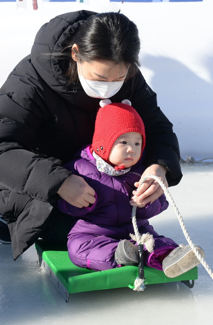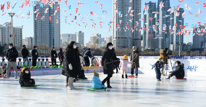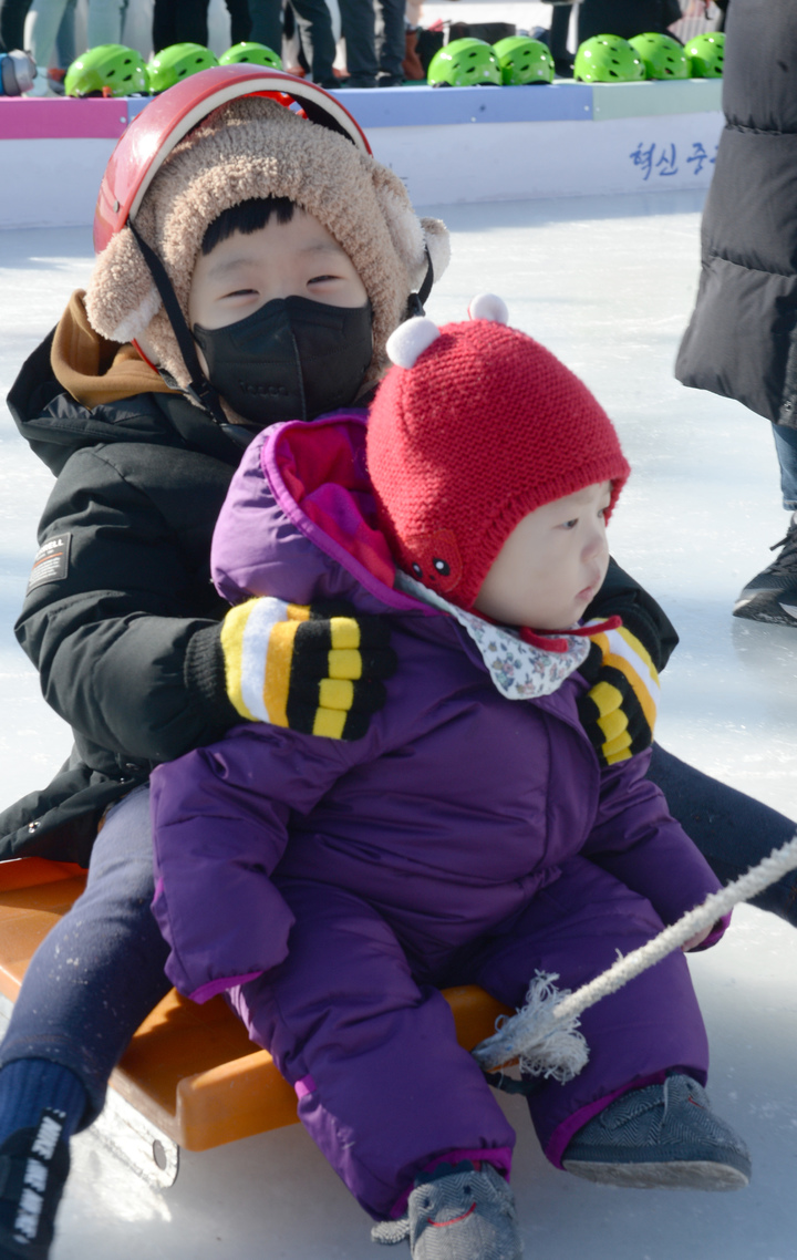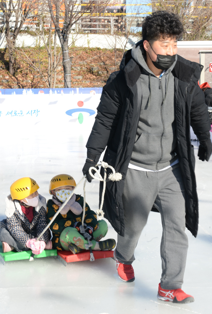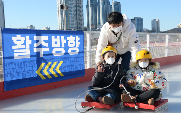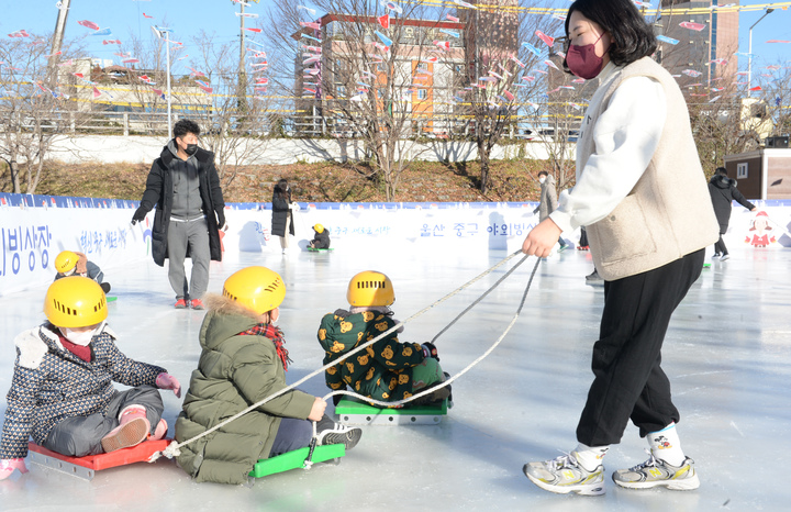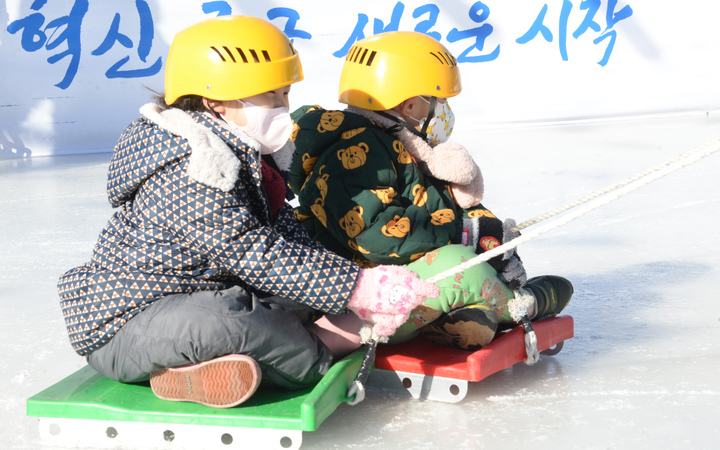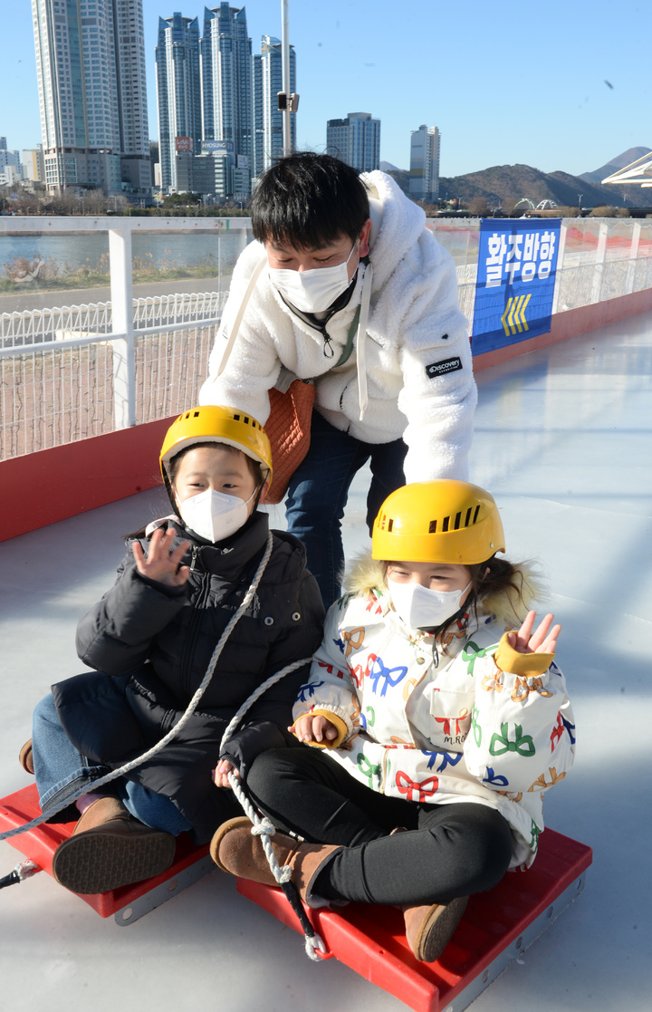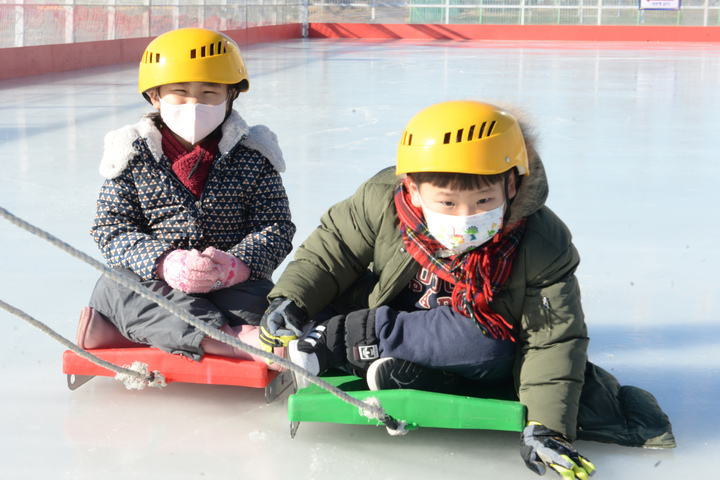 12月31日午前、蔚山市中区の太和江体育公園では蔚山初の野外リンクのオープン記念式典が行われ、子どもたちがそりに乗って楽しいひとときを過ごした。