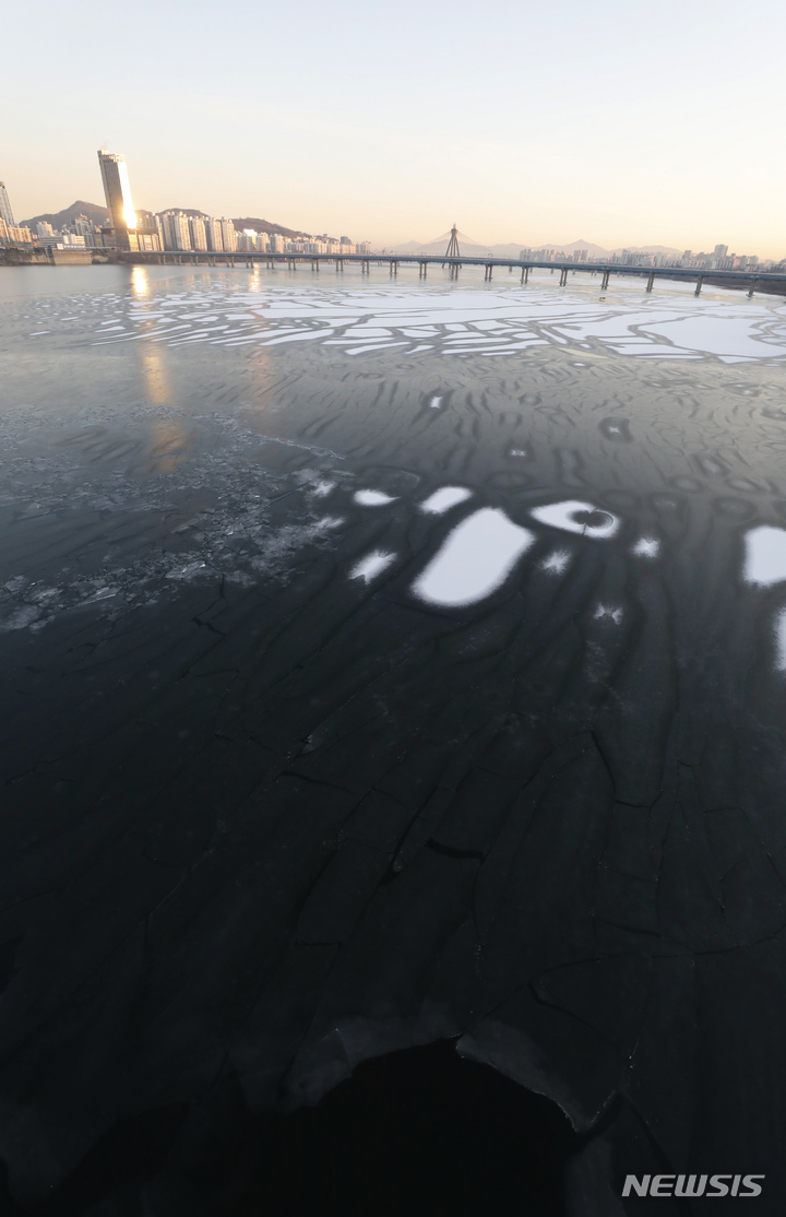 ソウルで朝の気温がマイナス8度まで下がった3日午前、ソウル市内の蚕室大橋と鉄橋の間では漢江が凍っていた。