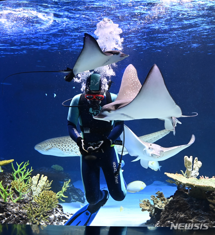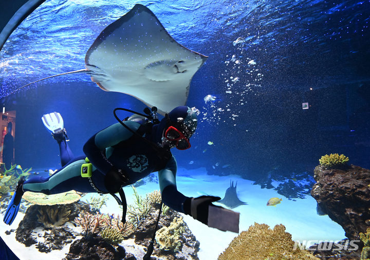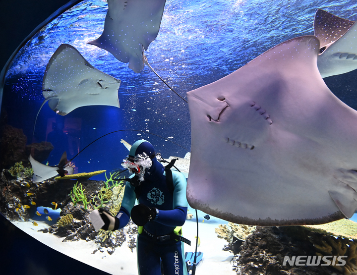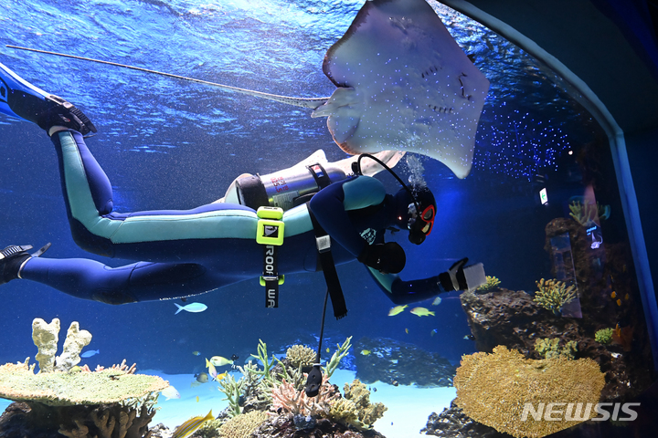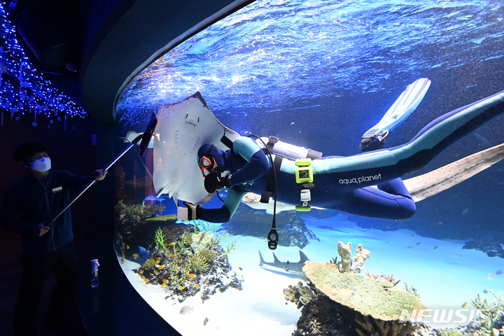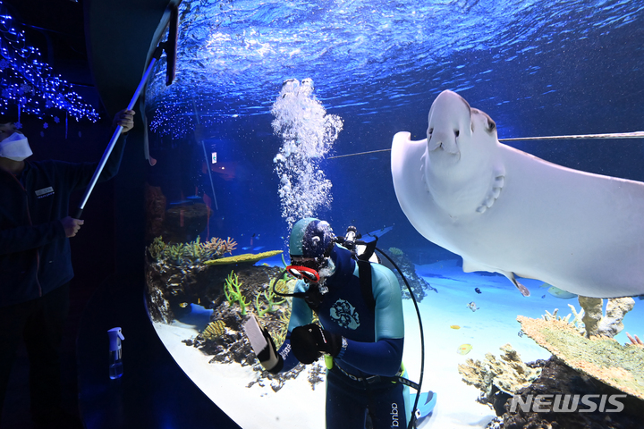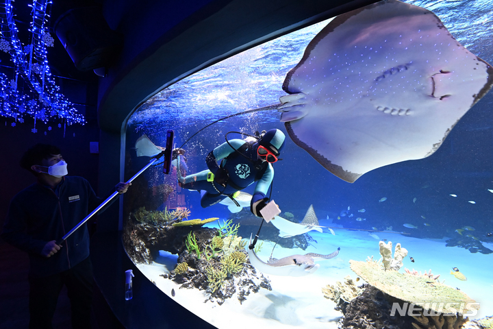 京畿道水原市霊通区のアクアプラネット光教で11日午後、新年を迎えるに当たり、ダイバーが水槽の清掃を実施した。
