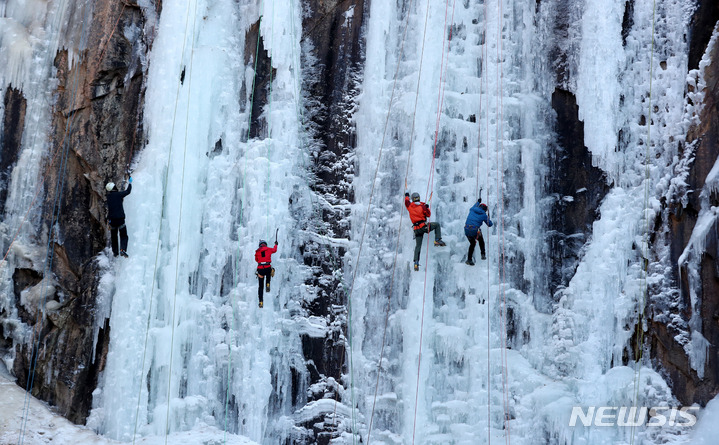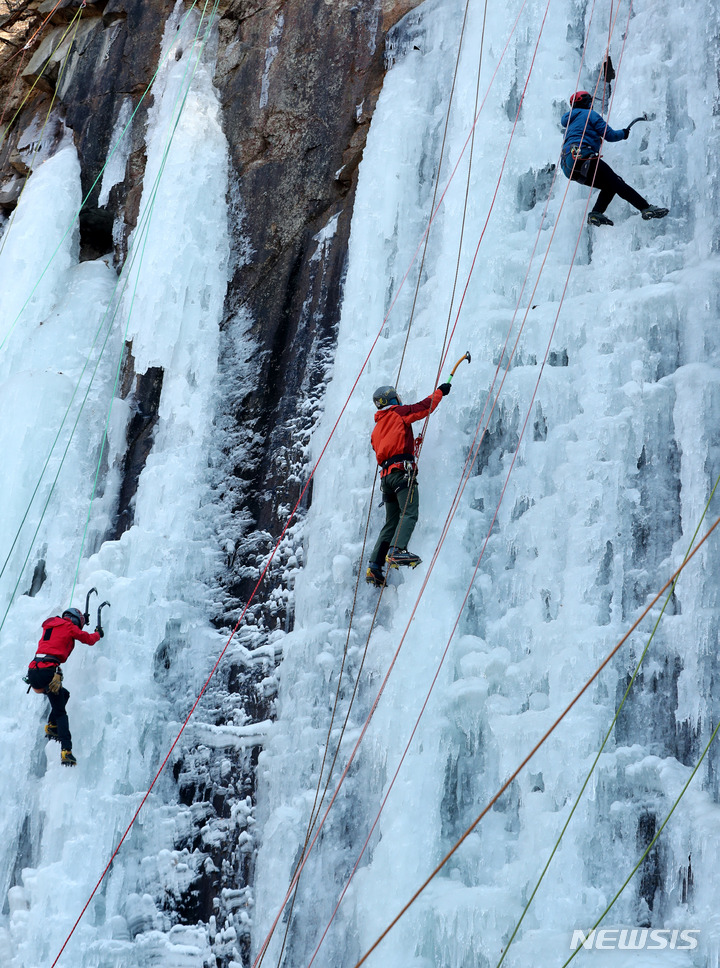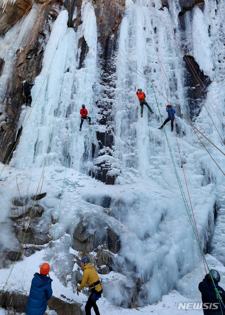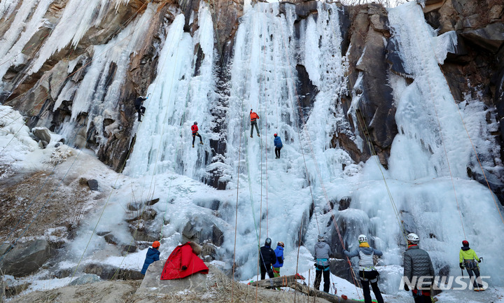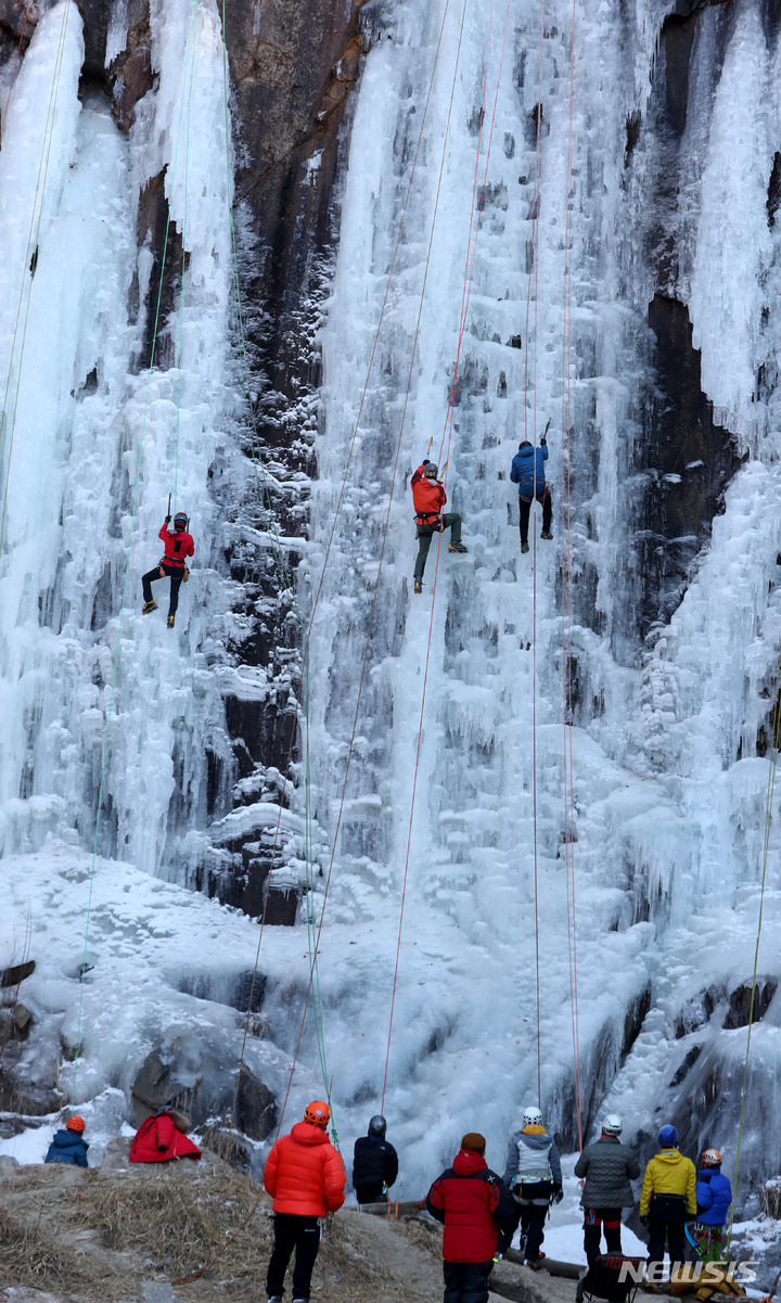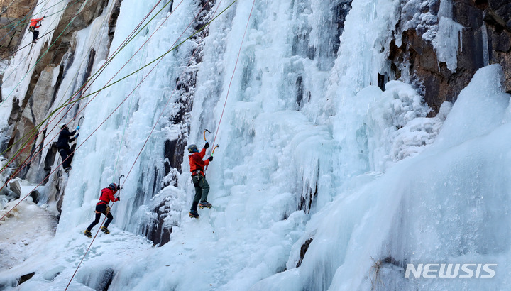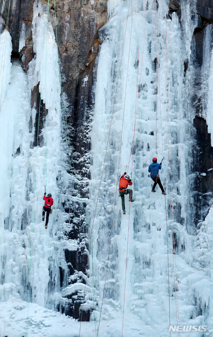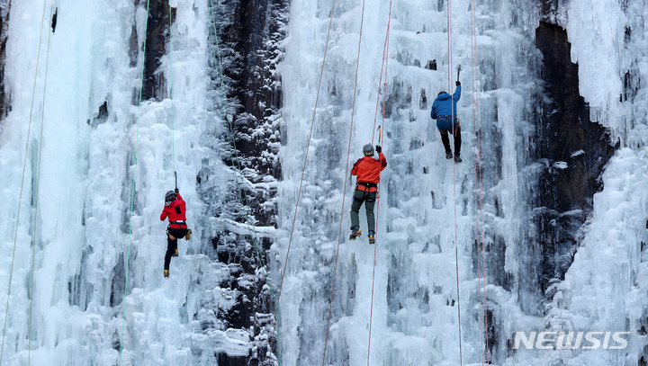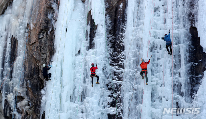 【NEWSIS】寒波が続いた16日午後、京畿道楊州市のカレビ氷壁場で、氷壁を登るクライマーたち。