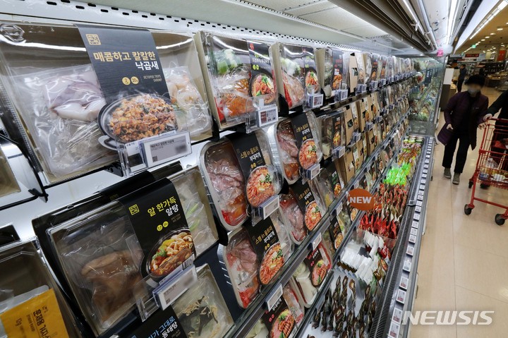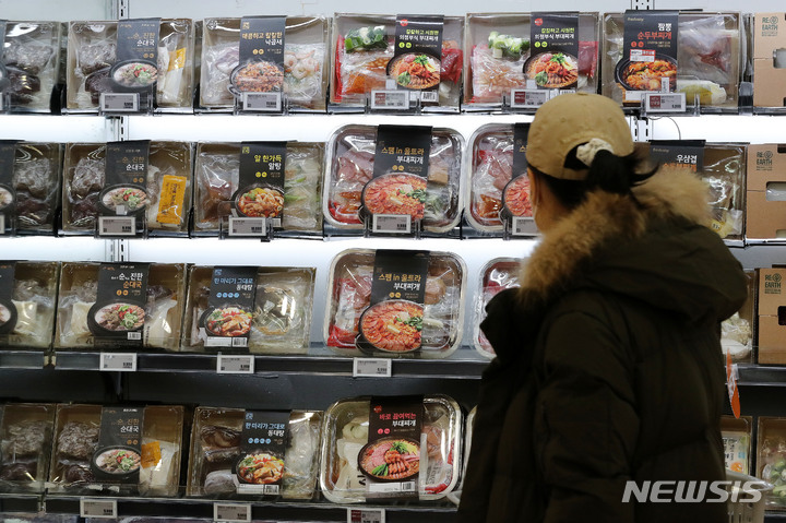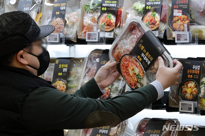 【NEWSIS】新型コロナウイルス感染症の流行長期化でRMR(Restaurant Meal Replacement)商品が人気を集めている。写真は16日午前、ソウル市中区の大型スーパー「ロッテマート」ソウル駅店で、RMR商品を選ぶ買い物客。RMRとは、有名レストランの人気メニューを自宅でも味わえるようにした食品で、昨年の売上は前年と比べ急成長を見せるなど、流通業界の新たなトレンドとして浮上している。
