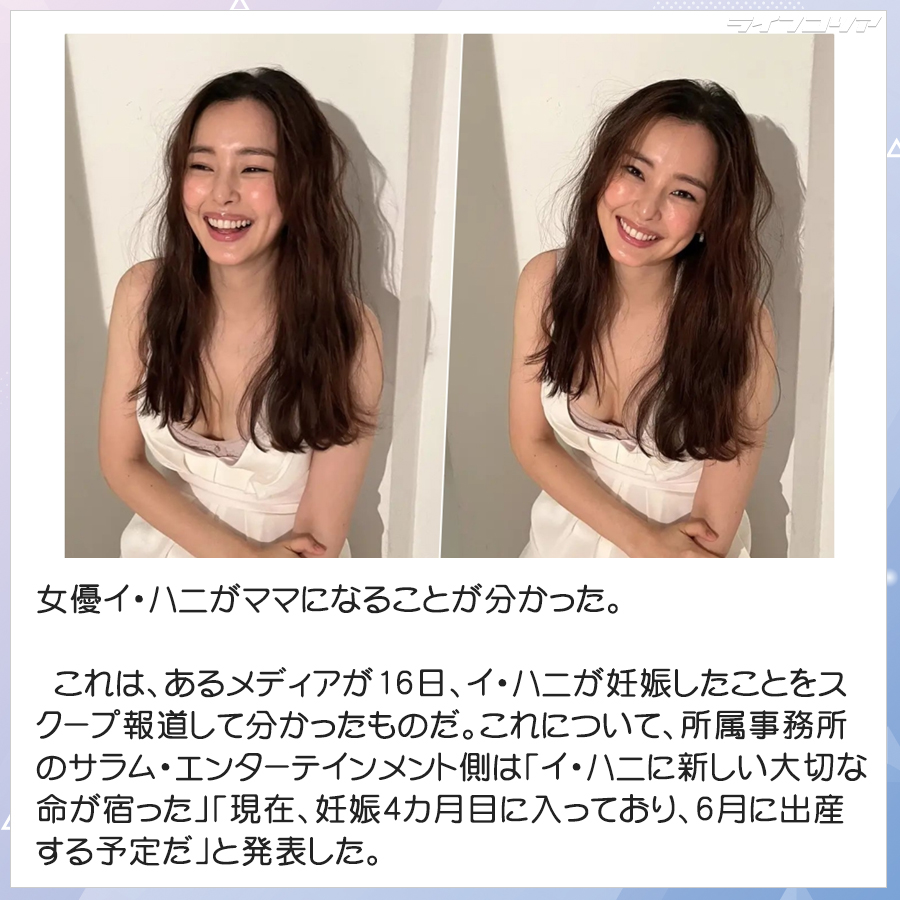 女優イ・ハニがママになることが分かった。 これは、あるメディアが16日、イ・ハニが妊娠したことをスクープ報道して分かったものだ。これについて、所属事務所のサラム・エンターテインメント側は「イ・ハニに新しい大切な命が宿った」「現在、妊娠4カ月目に入っており...