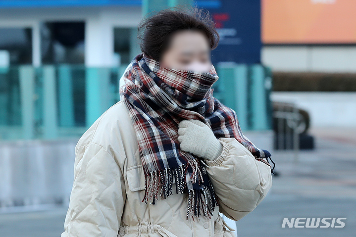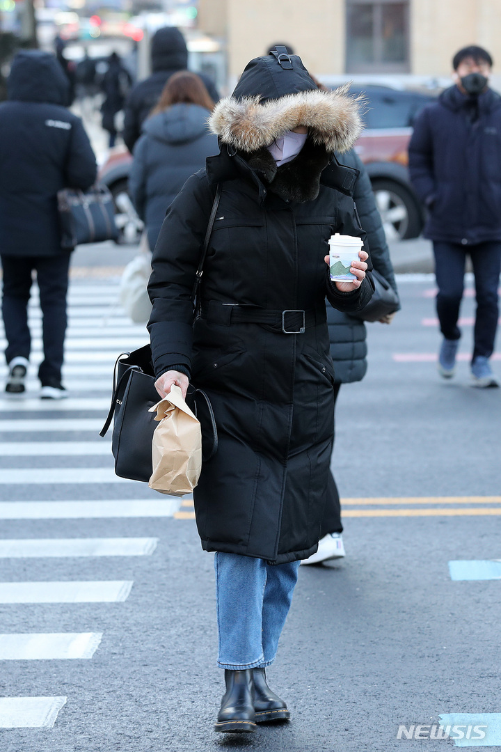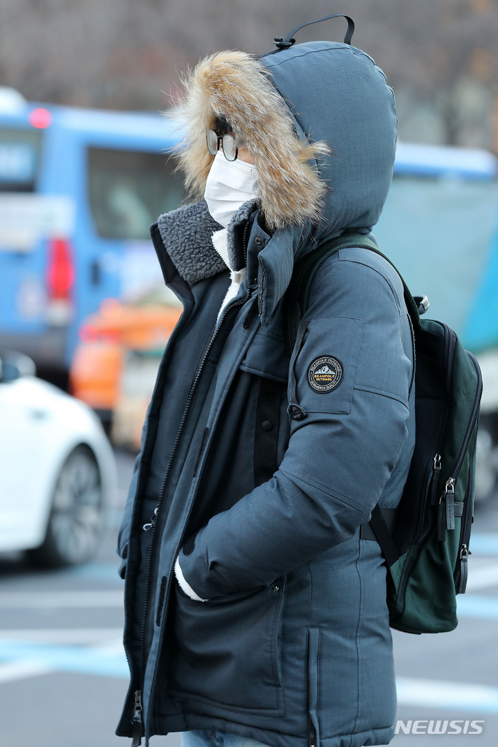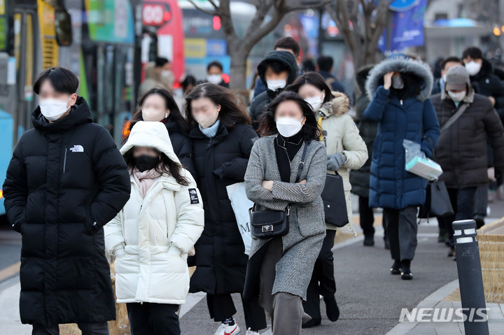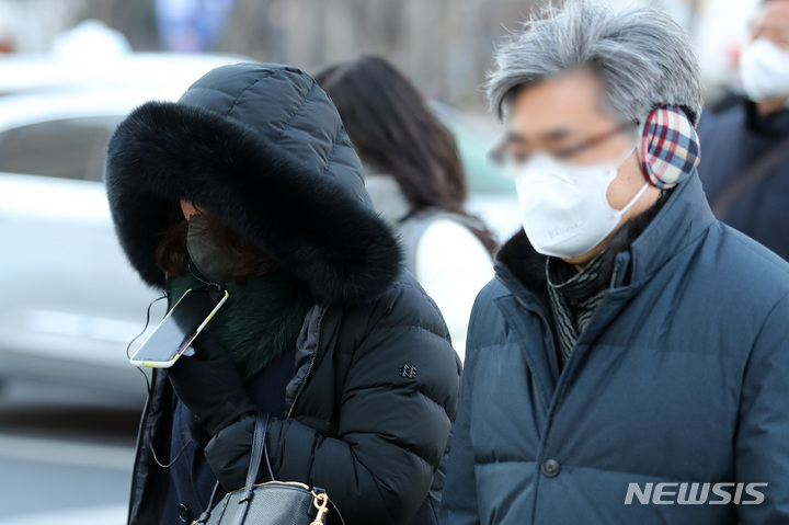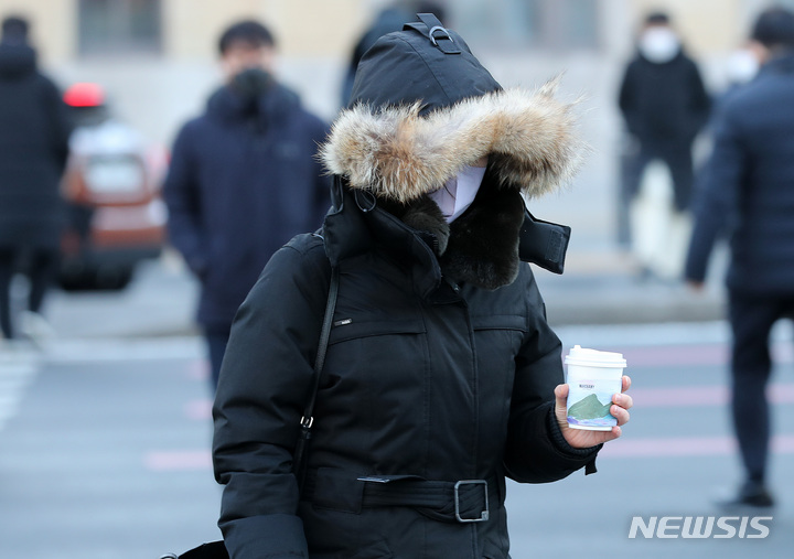 【NEWSIS】ソウル市内の最低気温が氷点下10℃まで下がった18日午前、ソウル市鍾路区の世宗大路交差点で、横断歩道を渡る人々。