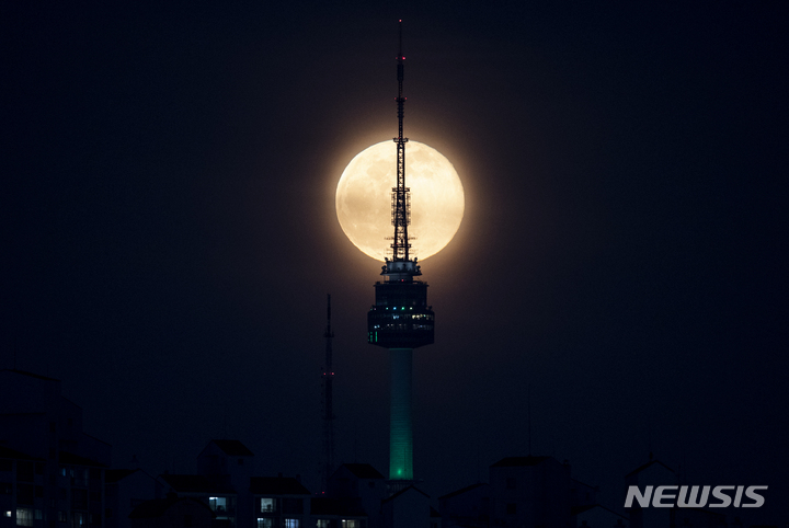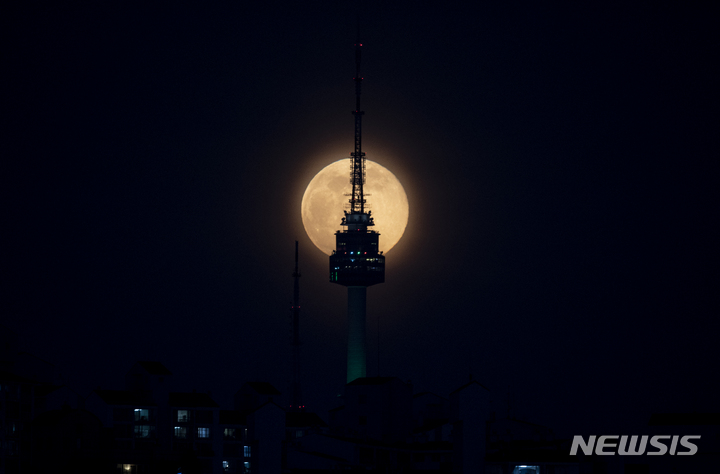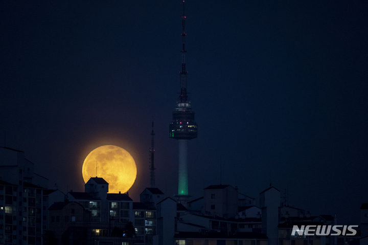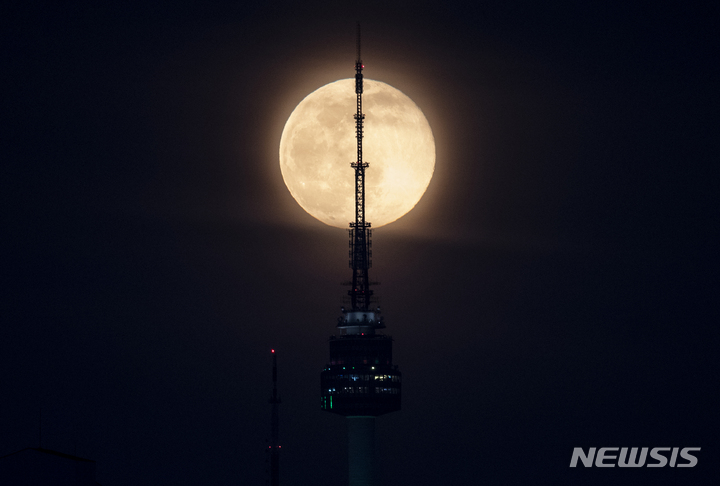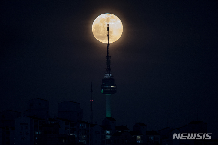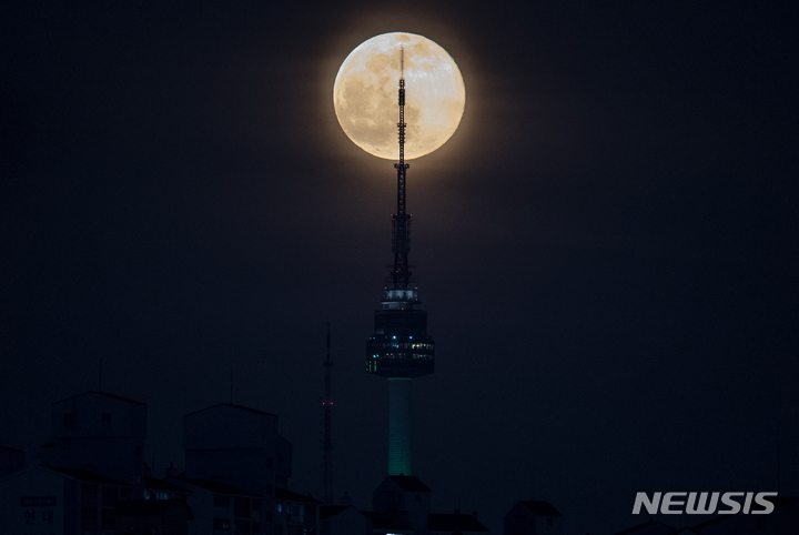 【NEWSIS】18日午後、ソウル市永登浦区汝矣島の漢江公園から見たNソウルタワー。その後ろには今年初めての満月が浮かんでいた。