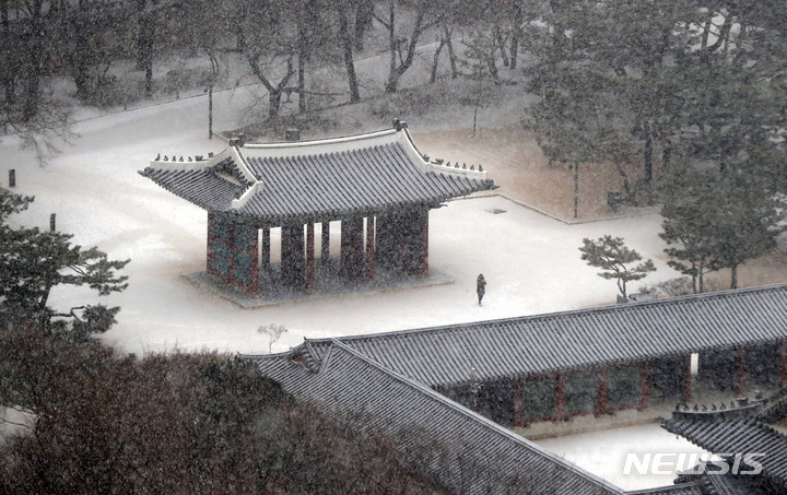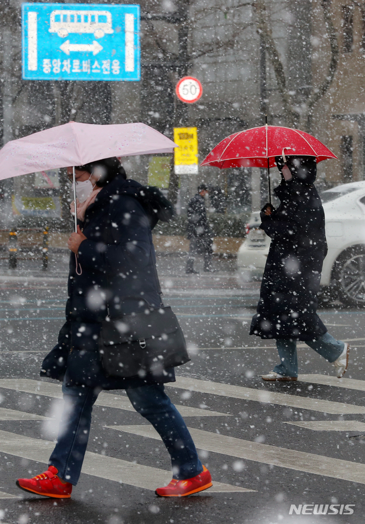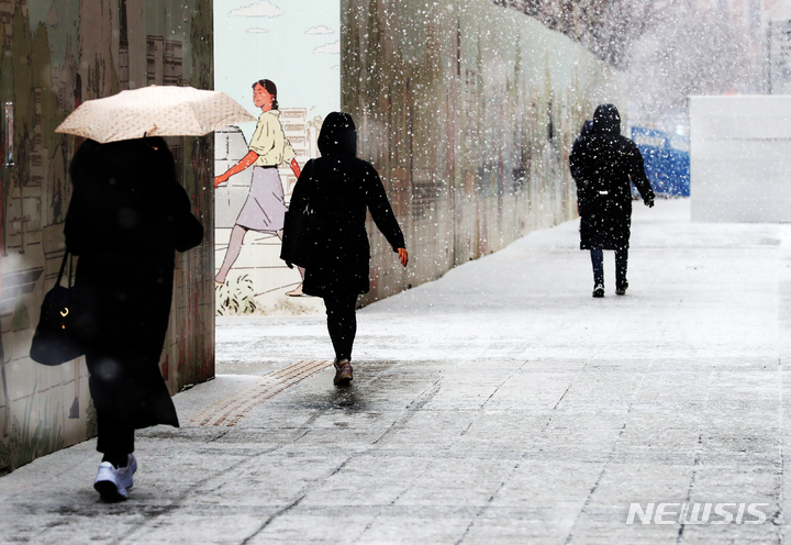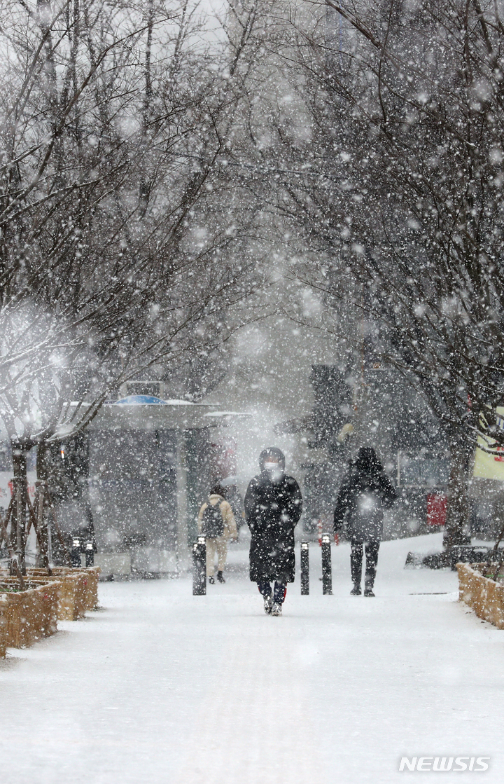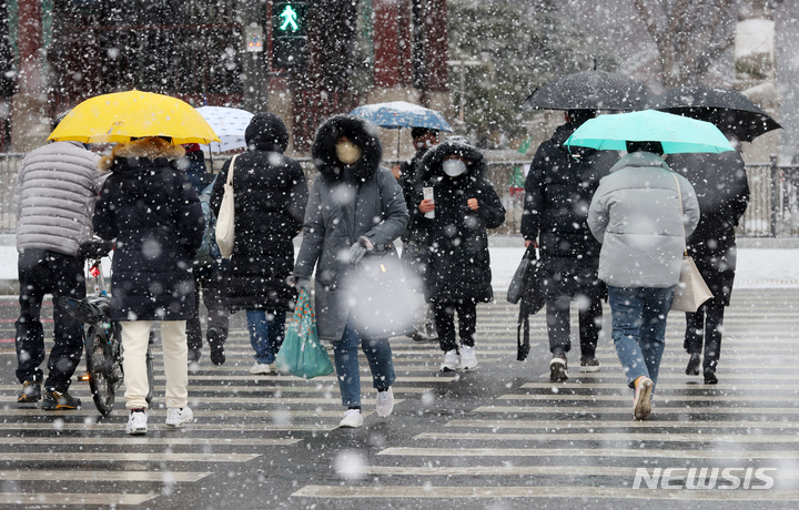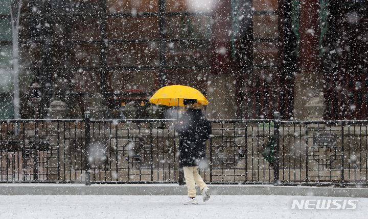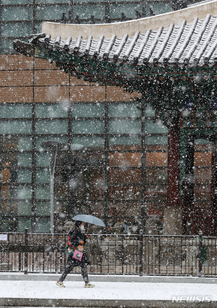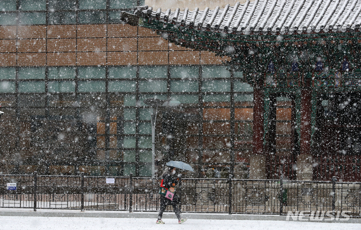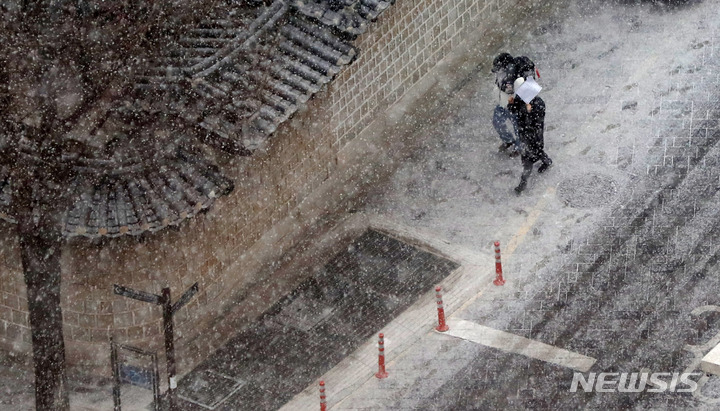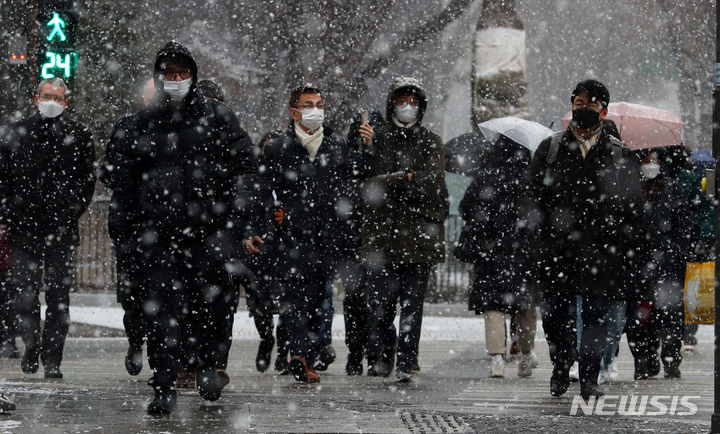 ソウル市内全域に大雪注意報が出された19日午前、同市鍾路区の世宗路交差点では、雪の中を歩く市民たちの姿が見られた。