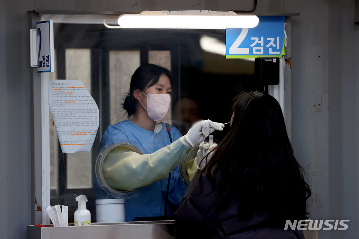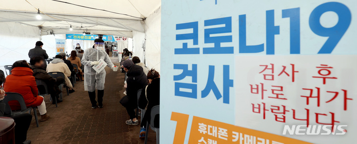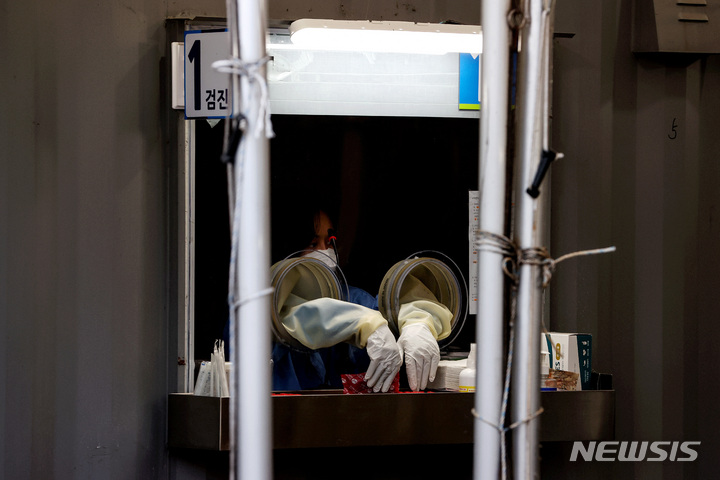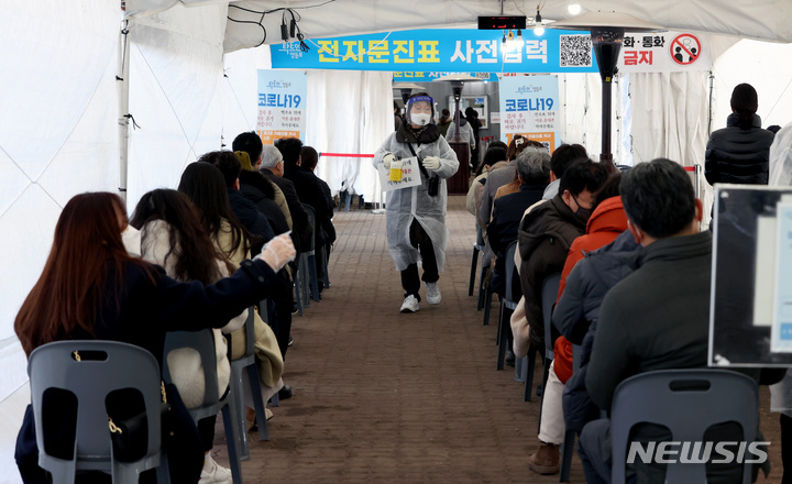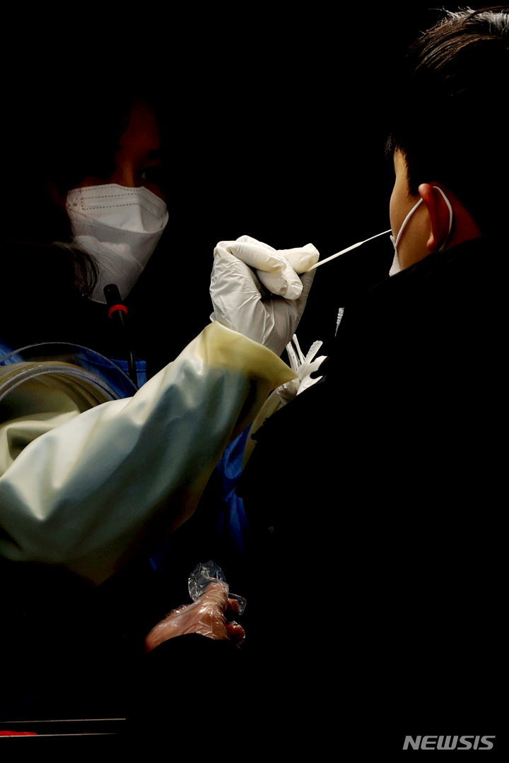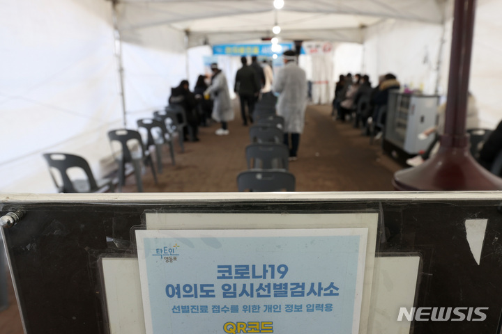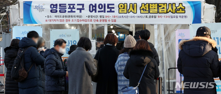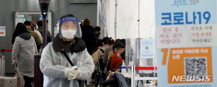 【NEWSIS】24日午前0時時点で新型コロナウイルス感染症一日新規感染者が7,513人となり、三日連続の7,000人台を記録した。写真は24日午前、ソウル市永登浦区汝矣島公園の臨時選別検査所で、検査を受けるために並んでいる人々。