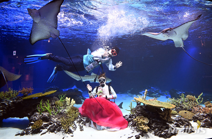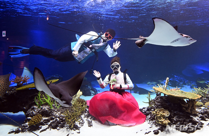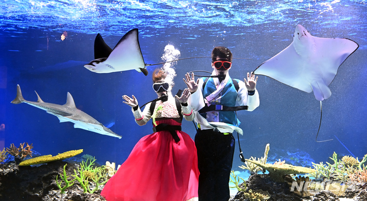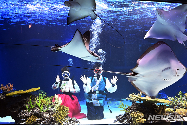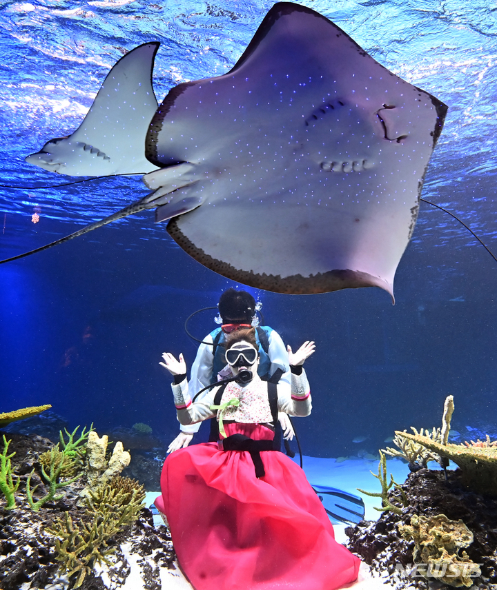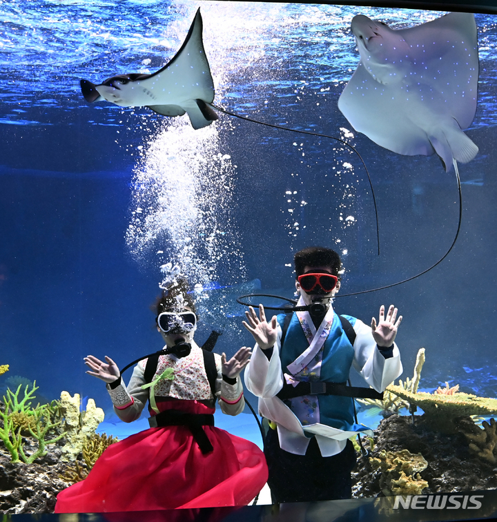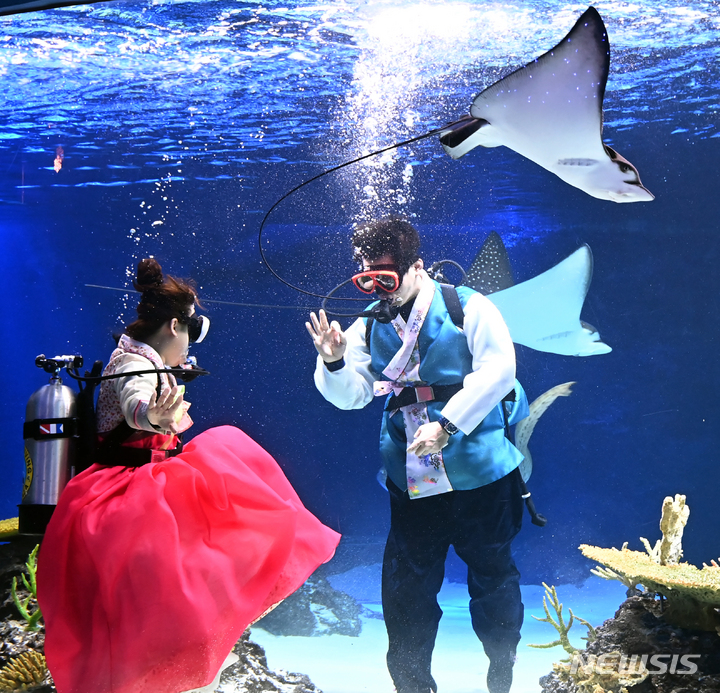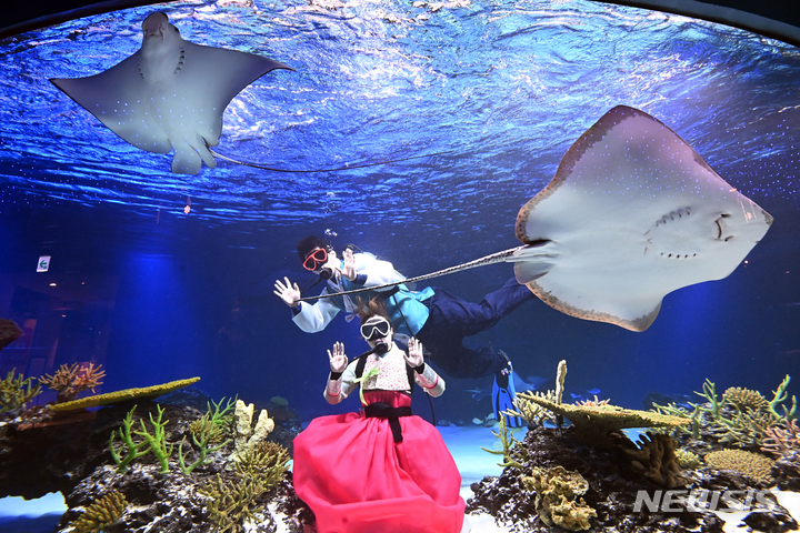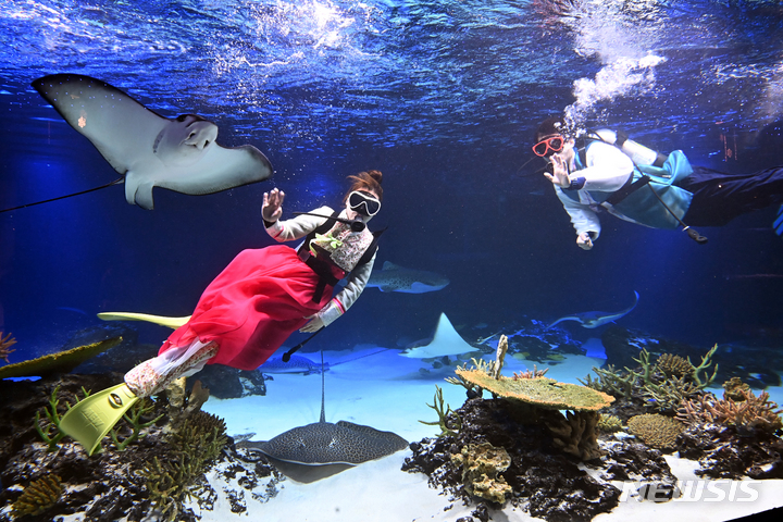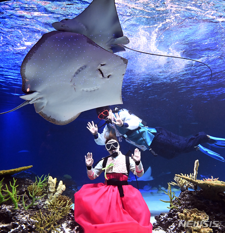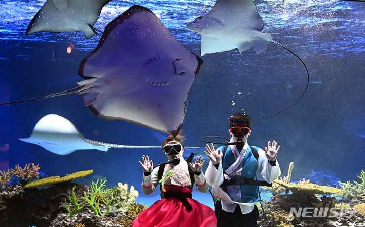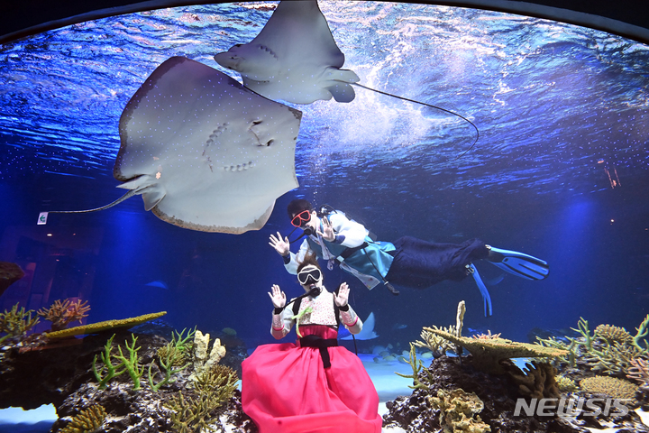 旧正月連休(今年は1月31日から2月2日)を控えた24日午前、京畿道水原市霊通区のアクアプラネット光教の水槽では、韓服(韓国の伝統衣装)を着た水族館スタッフらが水中パフォーマンスを繰り広げた。