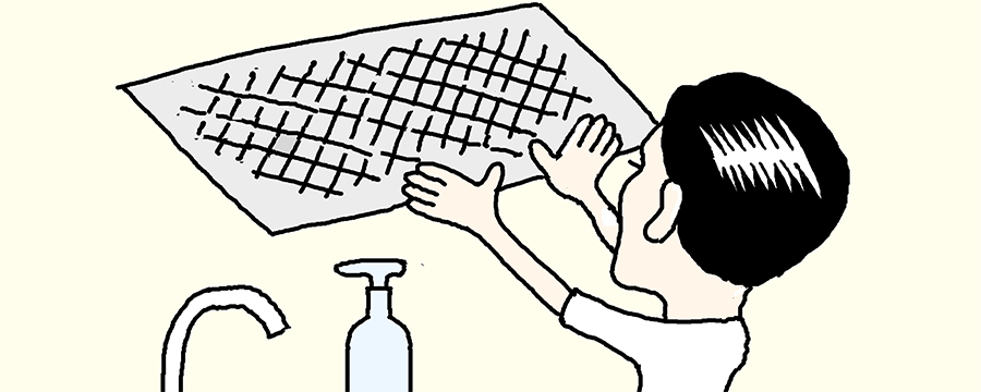 過炭酸ソーダ(過炭酸ナトリウム)を溶かしたお湯にキッチンのレンジフードフィルターをつけておくと、しつこい油汚れも楽に落とせる。