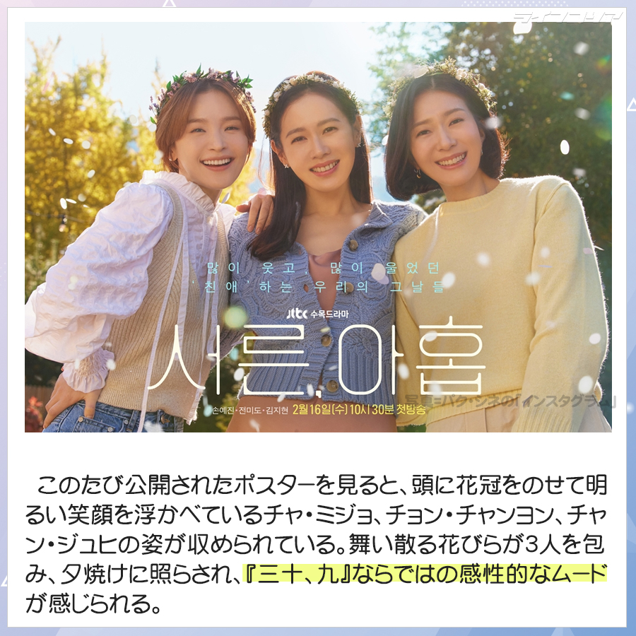 JTBCの新ドラマ『三十、九』に出演する花のように華やかなチャ・ミジョ(ソン・イェジン)、チョン・チャンヨン(チョン・ミド)、チャン・ジュヒ(キム・ジヒョン)の姿を収めたメインポスターが公開された...